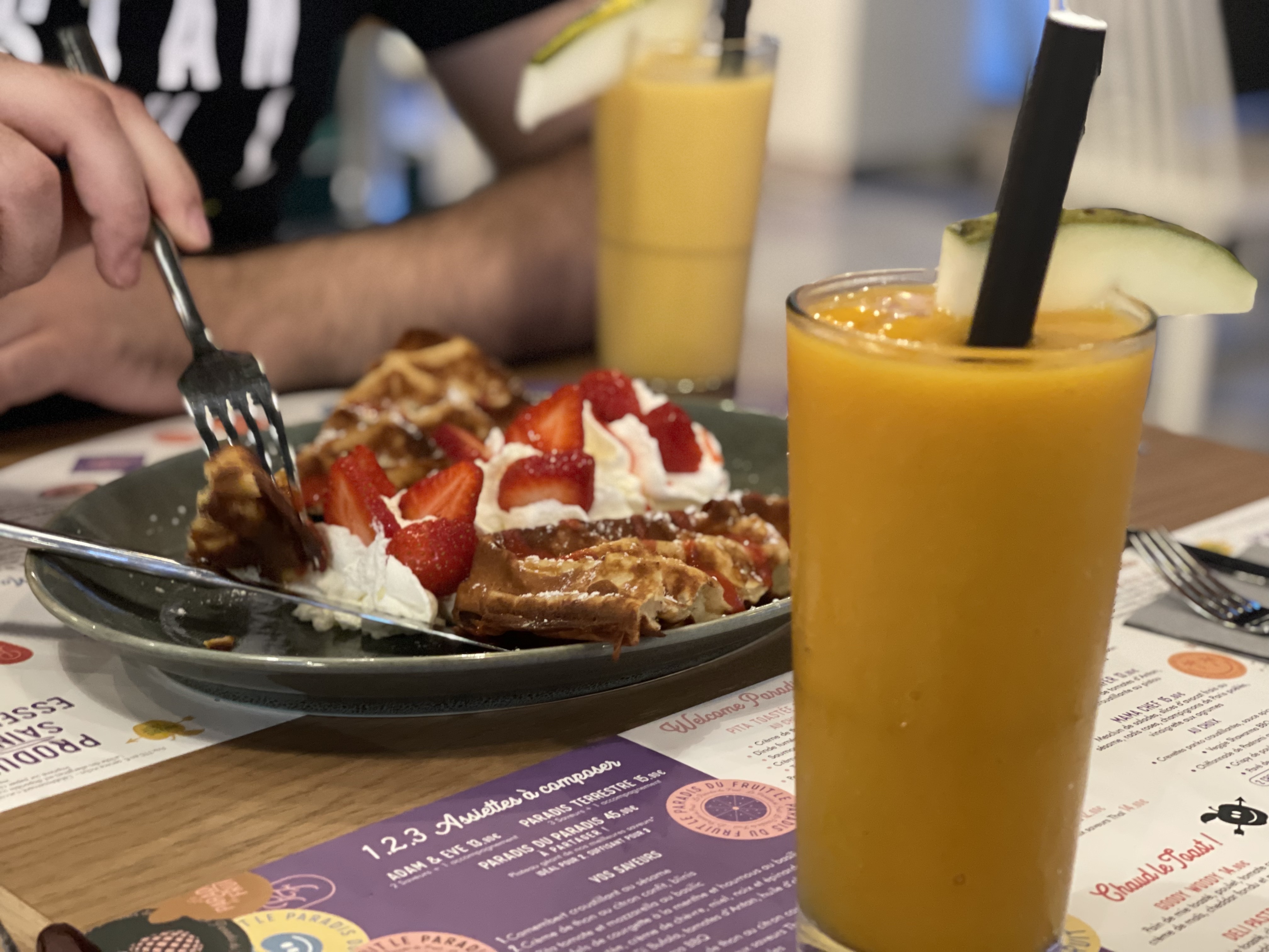 On a essayé des cocktails, qui étaient très bons en effet. On a aussi demandé une gauffre aux fraises, qui était bonne, mais qui peut être améliorée cependant. Rapport qualité prix pas très bien. Payer 7 euros pour un jus composé de 2 fruits, c’est un peu trop. Mais en revanche c’est super bon.
