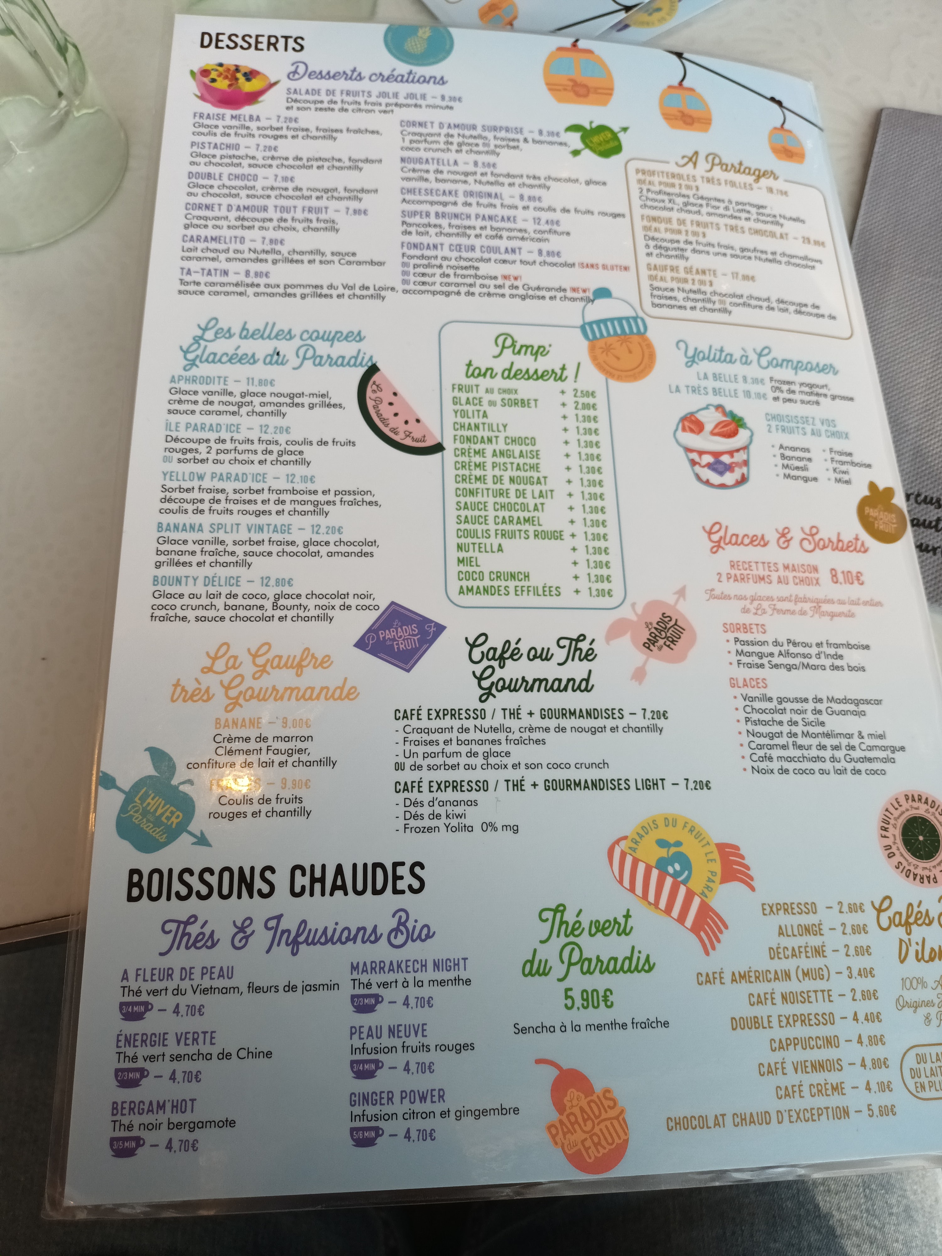 Je trouve que le paradis du fruit en a vraiment perdu, les portions sont très minces en quantité par contre le prix est très gros… c’est des prix limites dignes d’un gastronomique alors que ce sont des choses assez basiques simples à faire qui sont proposés à la carte. Sinon la nourriture est bonne, mais seulement une toute petite quantité de sauce est donné pour les frites et si on ne demande pas de sauce salade elle ne nous est pas proposé, ensuite j’ai pris un café gourmand et la verrine avec du cornet de glace émietté + une cuillère de nutella et une touche de chantilly dessus c’est vraiment se moquer du monde… les prix sont bien trop élevés pour ce que c’est !