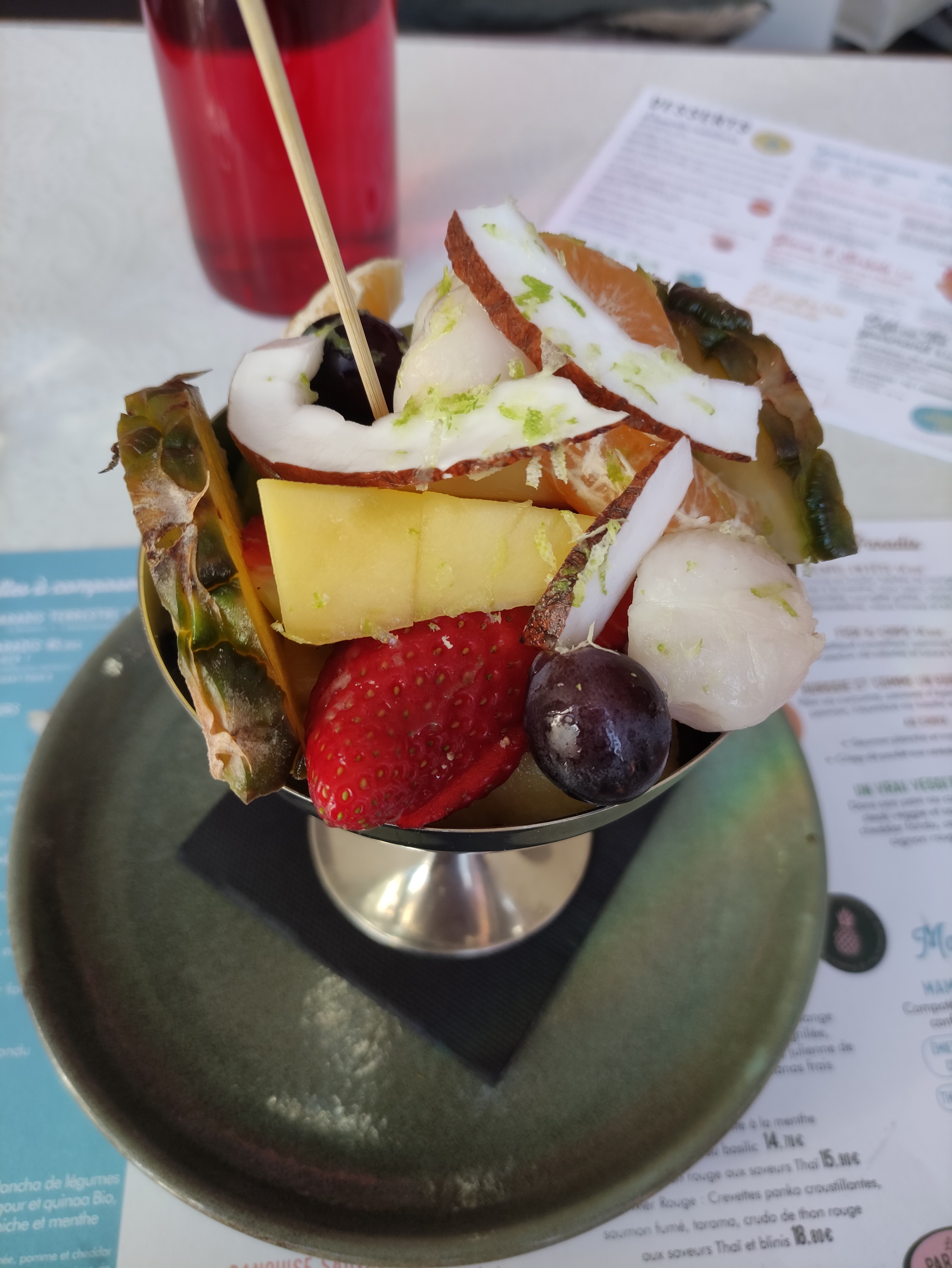 Nous nous sommes arrêtés au paradis du fruit pour le goûter! Nous avons pris des jus pressés et des salades de fruits! Un vrai régal! Notre serveuse était agréable et gentille! Nous reviendrons!