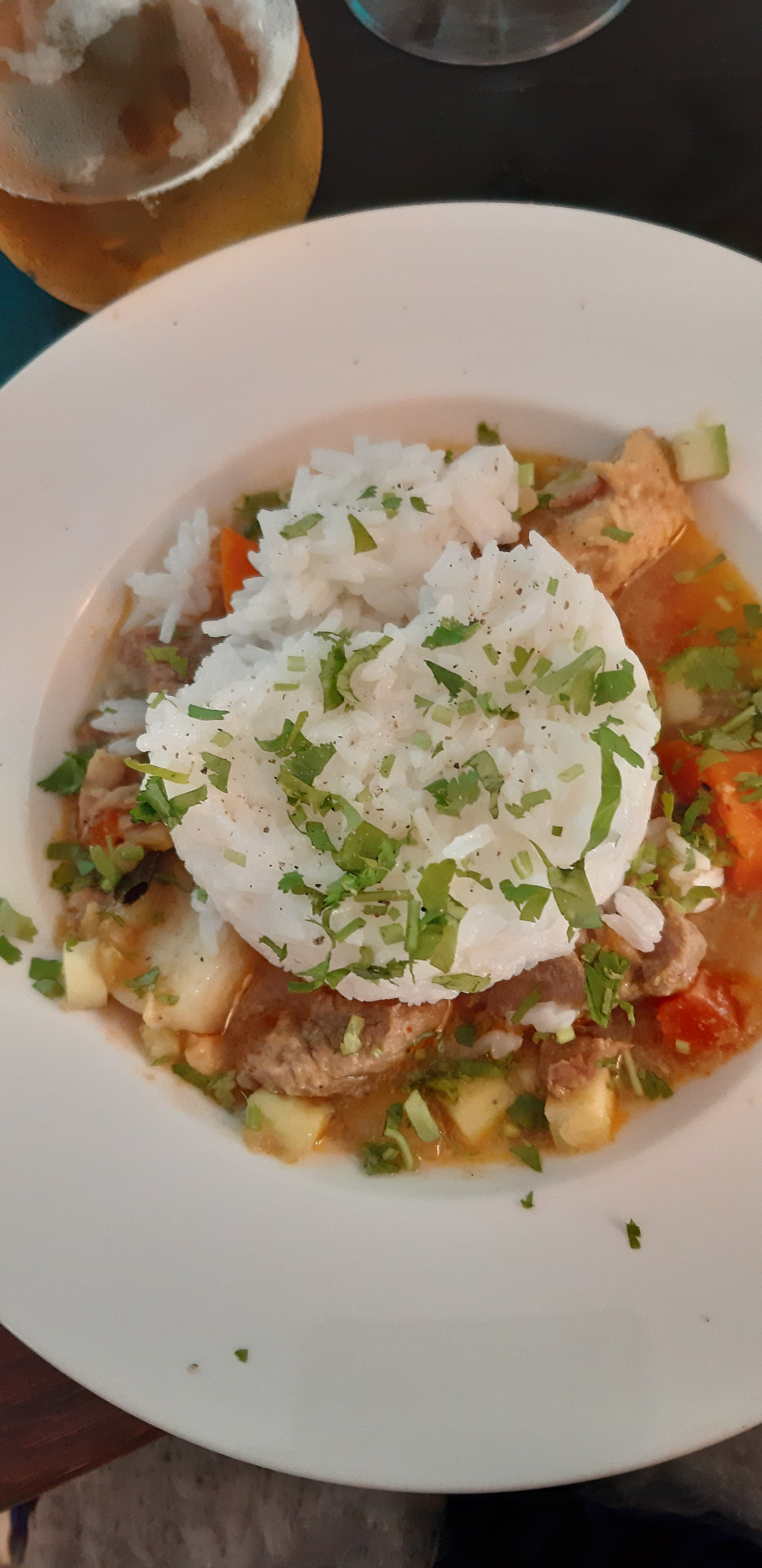 Nous avons pris le menu sur ardoise Entrée + Plat + Dessert à 18 €. J'ai choisi : - en entrée : le poisson cru, - le plat : le sauté de veau (annoncé pourtant pour un sauté de poulet)😕, - le dessert : part à la mangue. Nous avons apprécié dans l'ensemble nos plats😋, et c'était des plats originaux. Par contre, je précise que niveau quantité, ce n'est pas pour les gros appétits !🙄