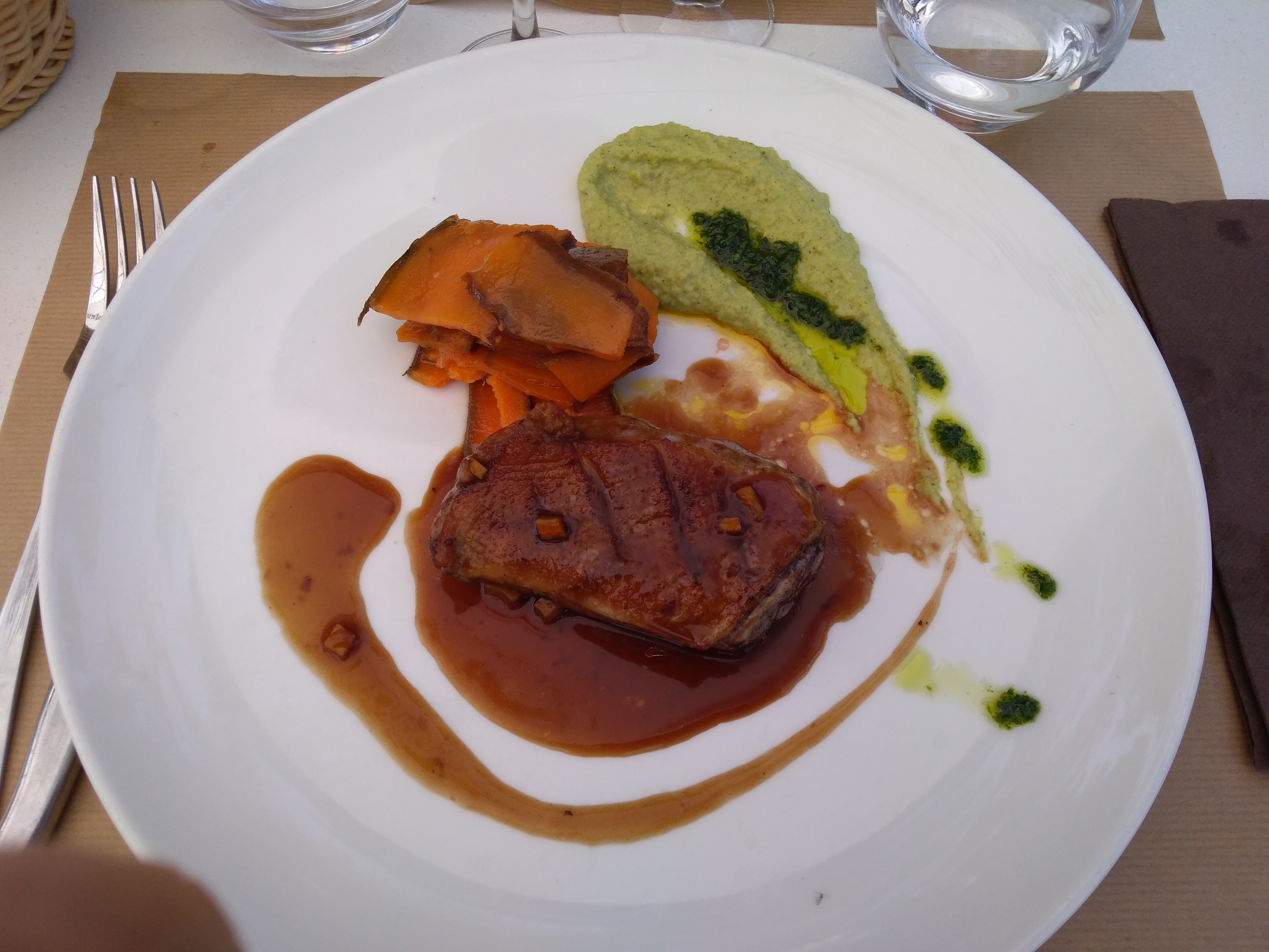 Le cadre est très agréable puisqu'on mange sur une terrasse en bois qui surplombe un bois de pin. Accueil et service sympathique. le rapport qualité/prix est très bon, avec une formule du marché 3 plats à 21.5 euros. Sans être de la haute gastronomie, c'est très bon et un effort notable est fait sur la présentation des plats, voir ci-dessous la photo du pavé de merlu. Je recommande cette halte reposante.
