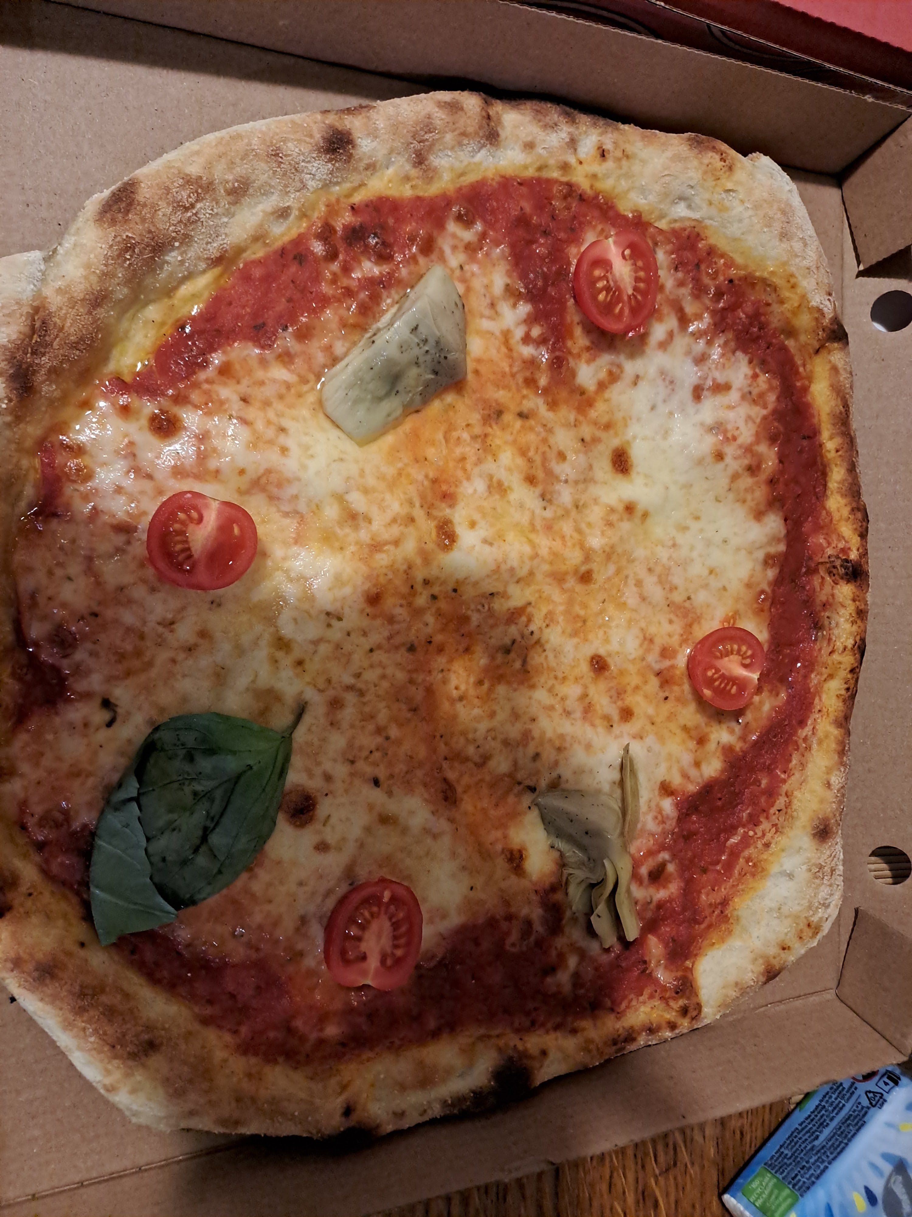 Notre pizza avait quatre demi-tomates cerises et deux morceaux d'artichauts. Rien de terrible en soi mais on dirait qu'il y a un petit relâchement sur les quantités... C'est un peu décevant.