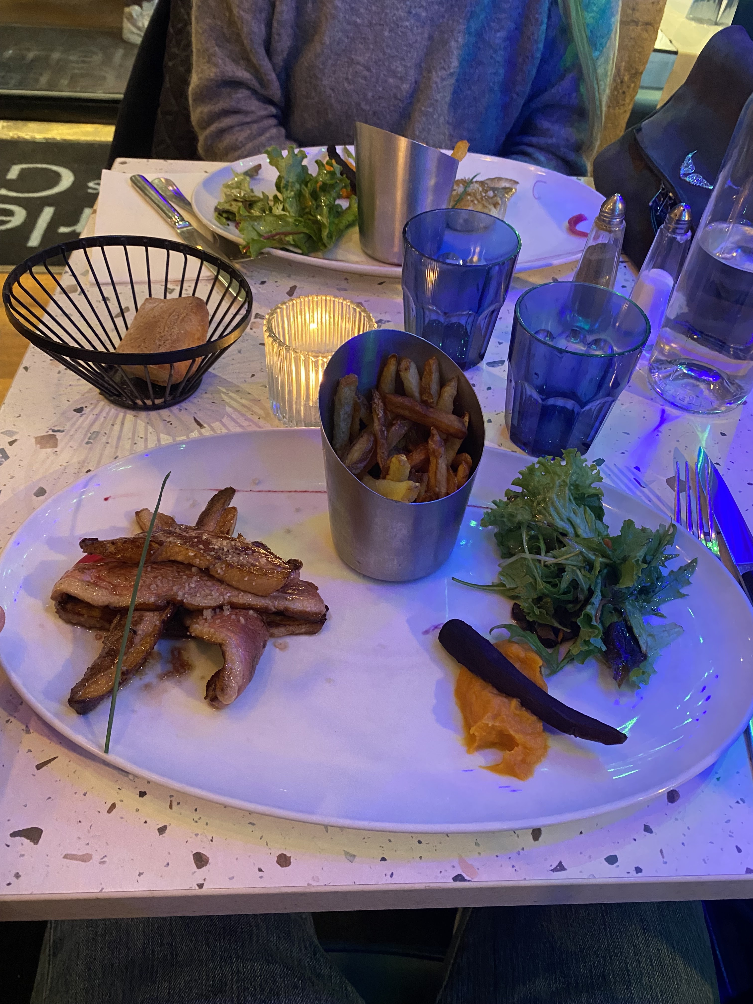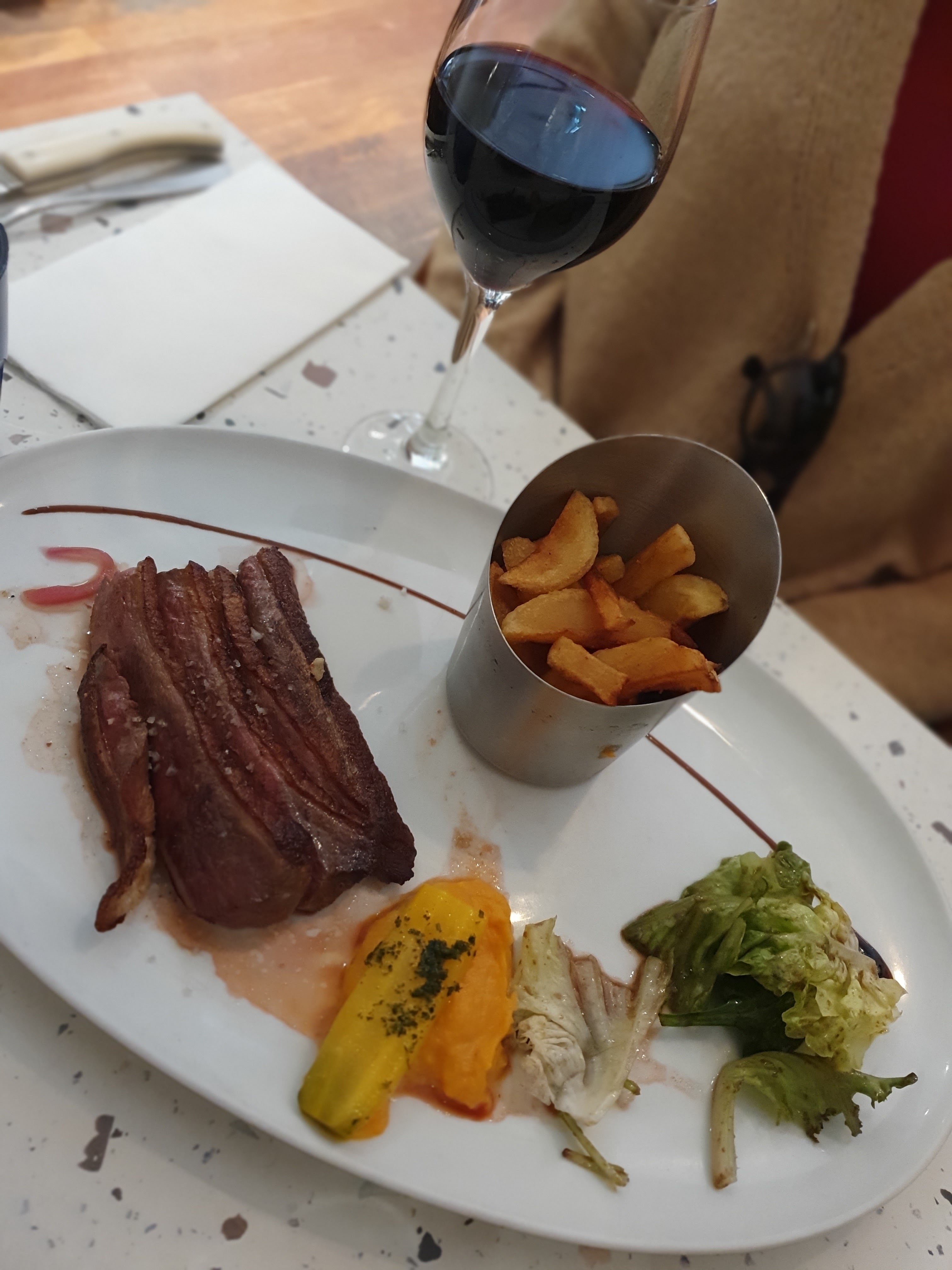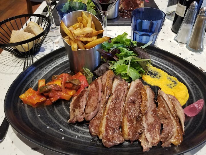 Nous avons adoré, mon frère et moi ce petit restaurant avec un décor raffiné et simple. Nous avons voulu prendre à la carte mais quand on a vu la table voisine qui est servie avec le menu de 19,90 nous avons opté pour ce même menu tellement c’est copieux. Mon frère a choisi l’entrecôte la viande est très tendre et bonne, moi j’ai pris le magret de canard, excellent ! Tout est servi avec de très bonnes frites maison, une petite salade et un peu de purée de carotte et carotte noire Service excellent ! l’équipe est top !