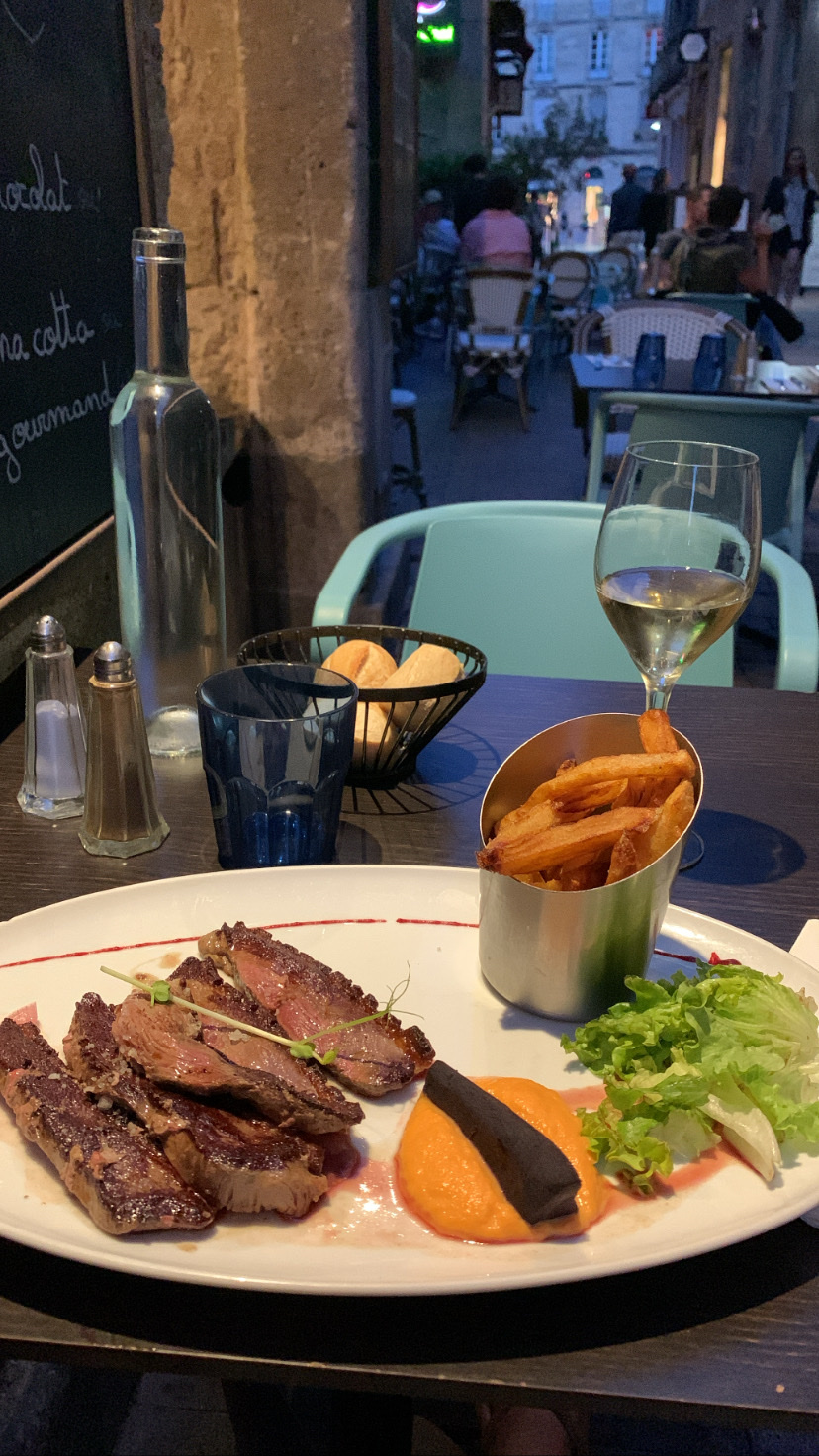 Notre visite de Bordeaux a été embellie par notre arrêt dans ce restaurant lors de notre repas de midi. Nous avons été placés à l’intérieur et nous avons donc pu profiter de la climatisation ce qui a fait une partie de notre bonheur. L’autre partie a été largement comblée par le repas de qualité et le service très agréable. La qualité était au rendez-vous de l’apéritif jusqu’au dessert. L’entrée au saumon et le plat de magrets ont été vraiment très bons. Le vin rouge a pu également relever la saveur du canard. Merci à ce restaurant. Je recommande franchement.