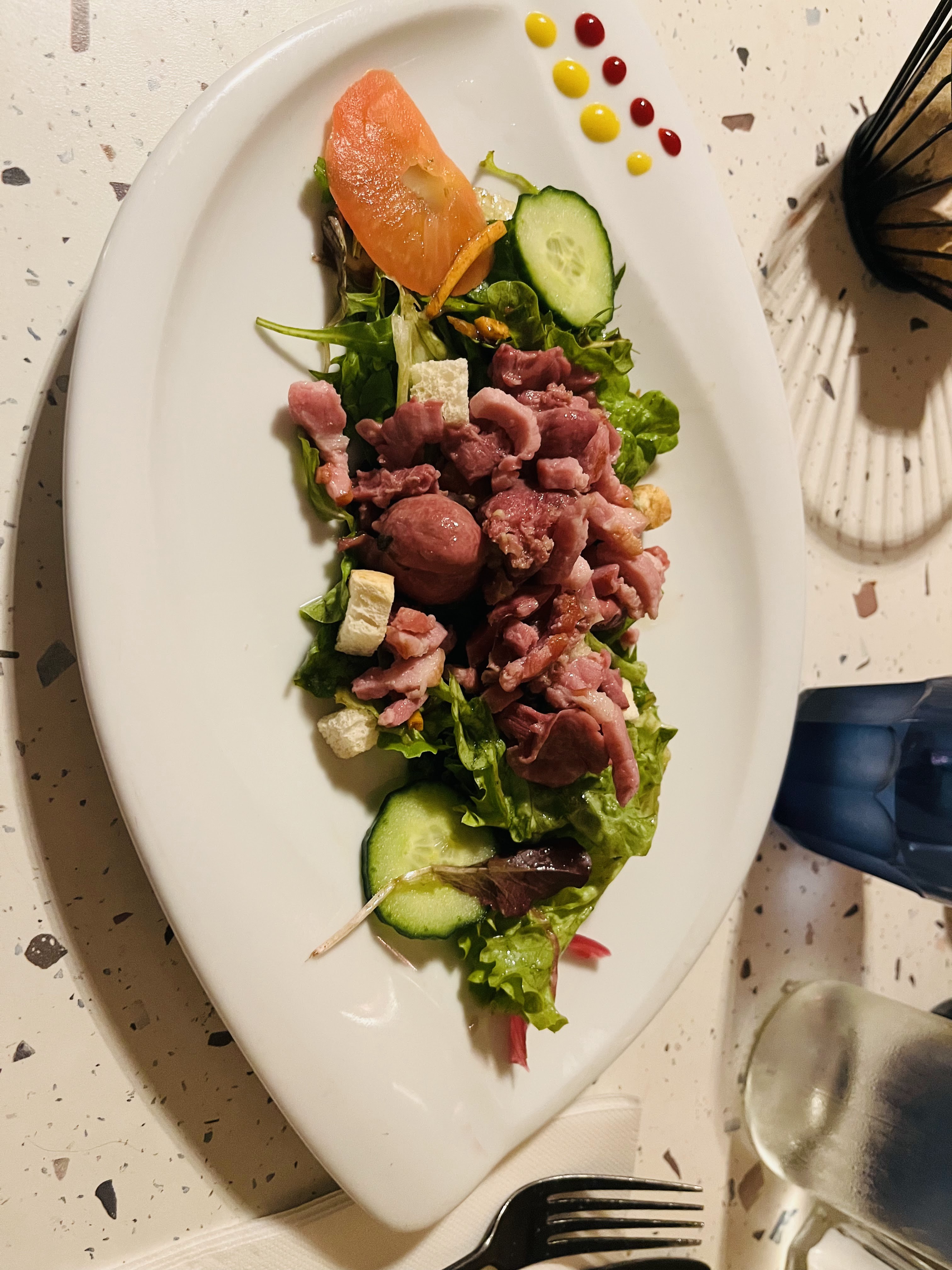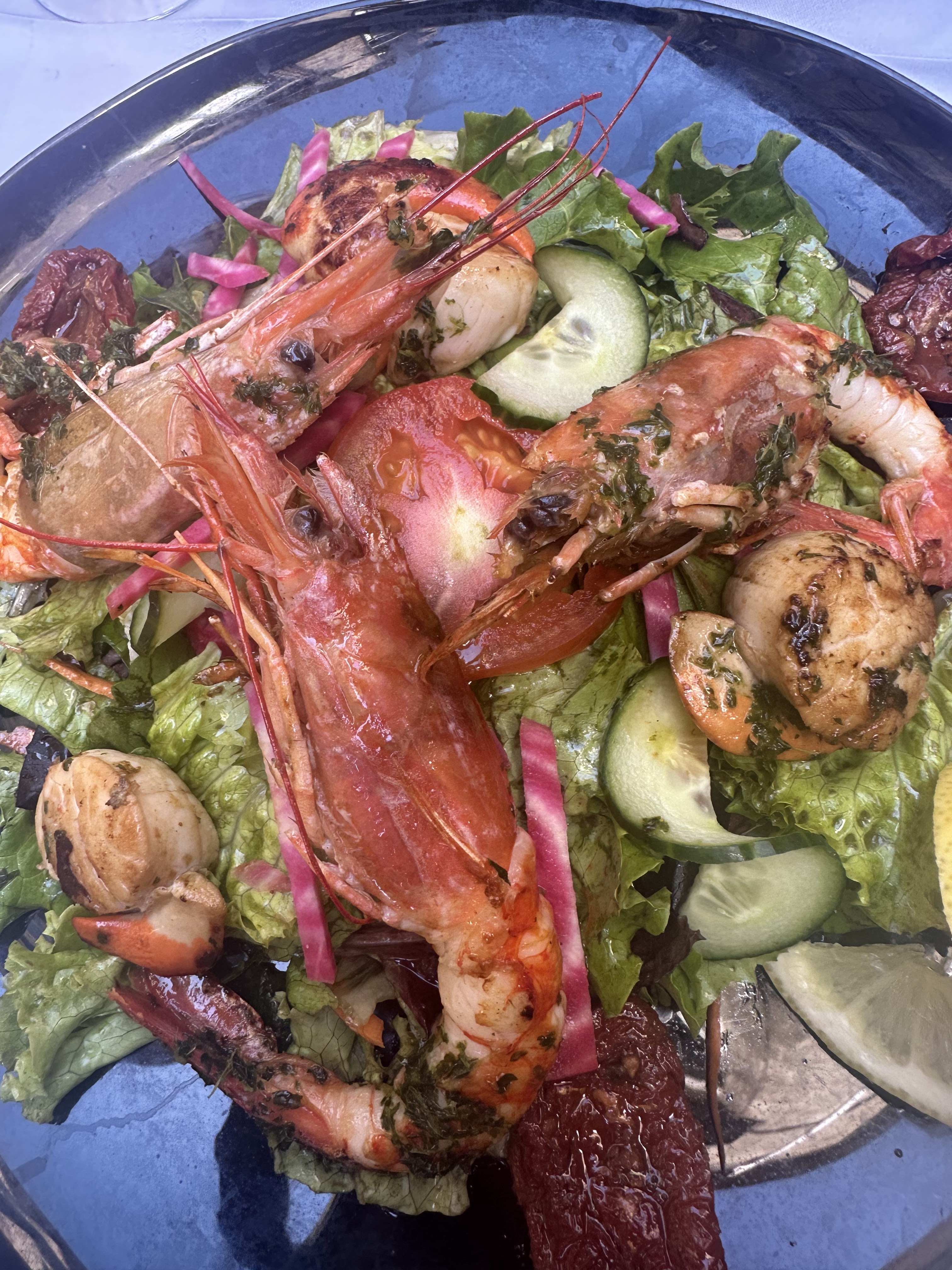 La beauté des présentations des plats ne fais pas tout! Car ma salade tiède aux gambas et st Jacques (que 3 petites)sur le dessus.mais la salade avec les crudités qui l'accompagnait était très peu assaisonnée et amer! 21€pour ça ! Pt Bémol avec des verres en plastique pour de l'eau dans un endroit comme celui là ! Pour les autres plats peu de saveurs et de goûts ! Dommage pour un restaurant avec un bel intérieur et un bon service ! Cela mériterai de revoir la qualité et le goût et les saveurs !