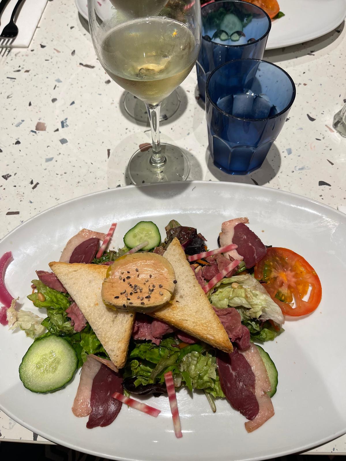 Le foie gras est exceptionnellement délicieux, nous avons eu une salade avec du saumon, du bœuf et des bières 🍻
