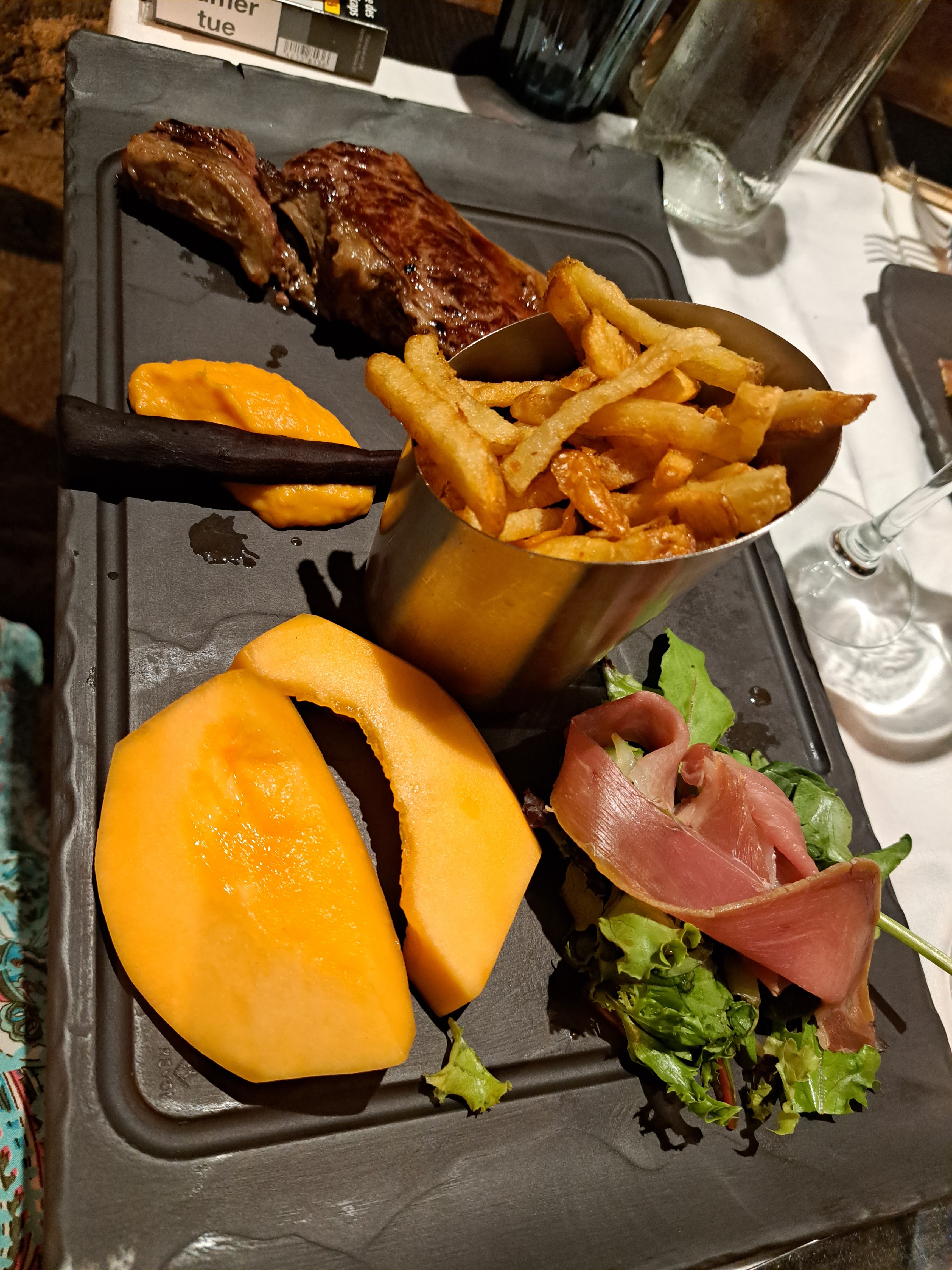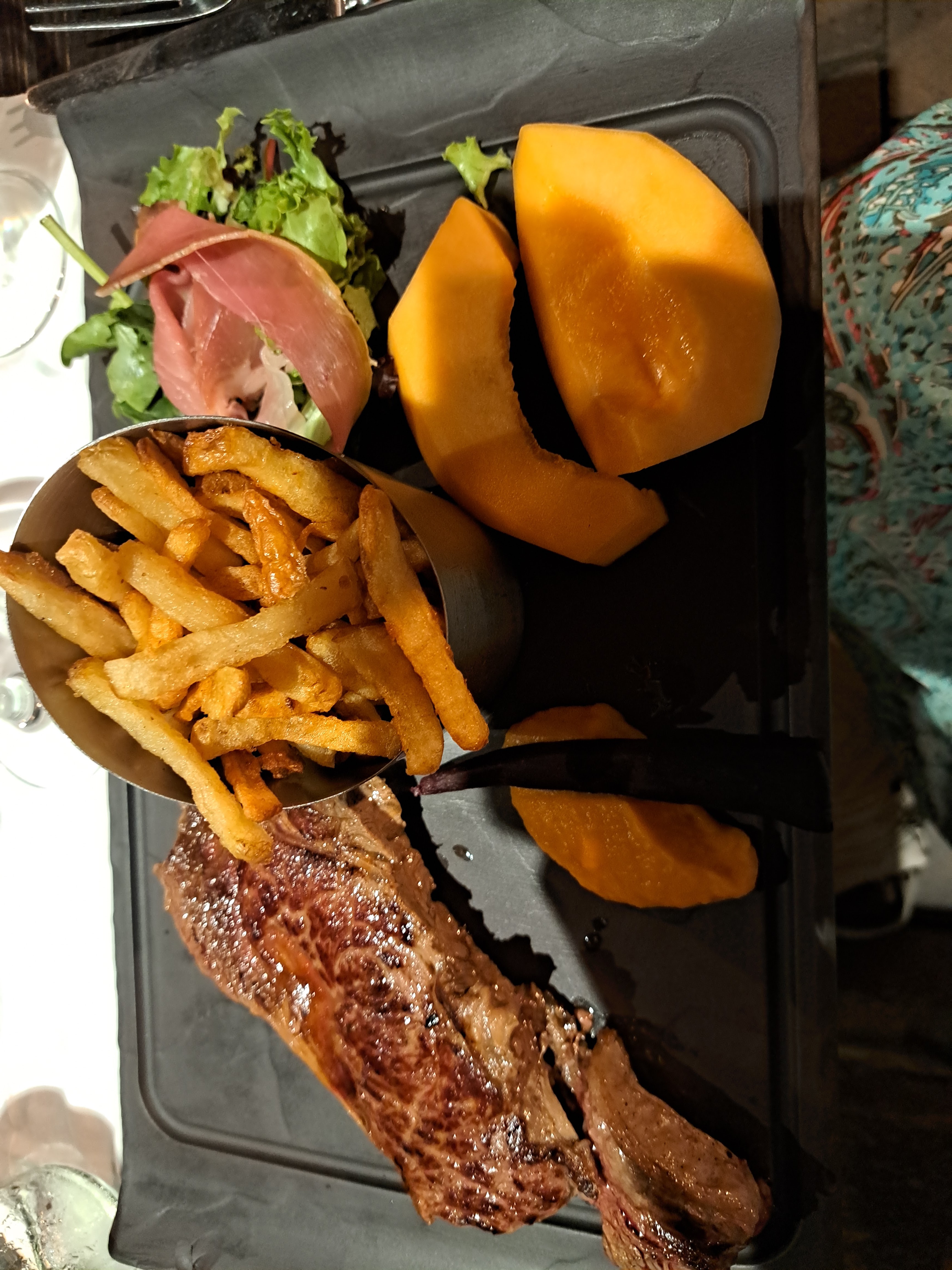 Pour moi c'est un piège à touristes, à fuir. Tous les étrangers étaient très satisfaits, pour nous c'était pas vraiment bon et peu intéressant. Dommage le lieu semblait sympathique avec des prix abordables, en effet les prix restent plutôt abordables mais on comprend mieux pourquoi ce prix. Dans le menu nous avions du melon qui était plutôt bon, mais le jambon qui l'accompagne est juste quelconque, ensuite entrecôtes grasses et pleine de nerfs et la viande n'avait pas de goût tout simplement, seule la cuisson était réussie. La sauce bordelaise qui l'accompagne avait peu de goût, manquerait d'être plus épaisse, il y avait un minuscule morceau d'échalote, dommage. Les frites étaient peut être maison, difficile à savoir alors que ça ne devrait pas, mais ça baignait tellement dans l'huile qu'impossible de savoir... Seul la petite portion d'écrasé de butternut était excellente. Le dessert avec un riz au lait au caramel était peut être le moins pire car le caramel était très bon, mais le riz au lait trop liquide et sans goût, un peu de vanille dedans et peut être que le dessert deviendrait intéressant.