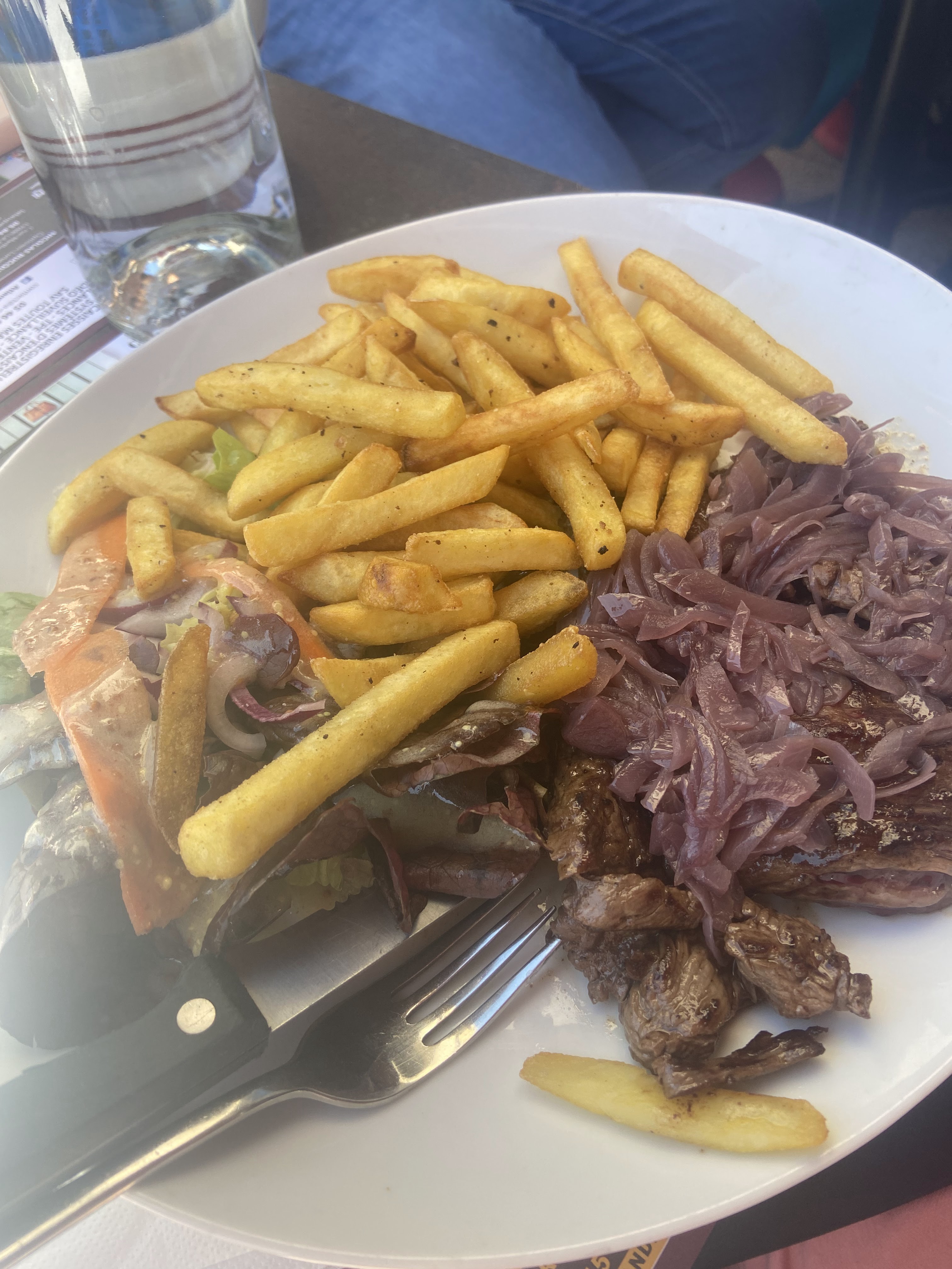 Déçue ! Nous avions eu un bon accueil et puis tout s'est gâté au fur et à mesure. On demande au serveur de nous laisser prendre le temps de siroter notre apéritif avant de nous servir notre repas et cela semble déranger au regard de sa réponse. Pourtant, la terrasse n'était pas remplie. Le service laisse aussi à désirer. Avons dû réclamer du sel pour nos frites par 3 fois avant d'en avoir. Nos desserts ont été servis après un LONG délai d'attente.Nos voisins de table qui étaient dans la même situation sont même partis avant d'être servis . Même si le repas était correct/ prix, tous les à cotés ont rendu désagréable ce repas.