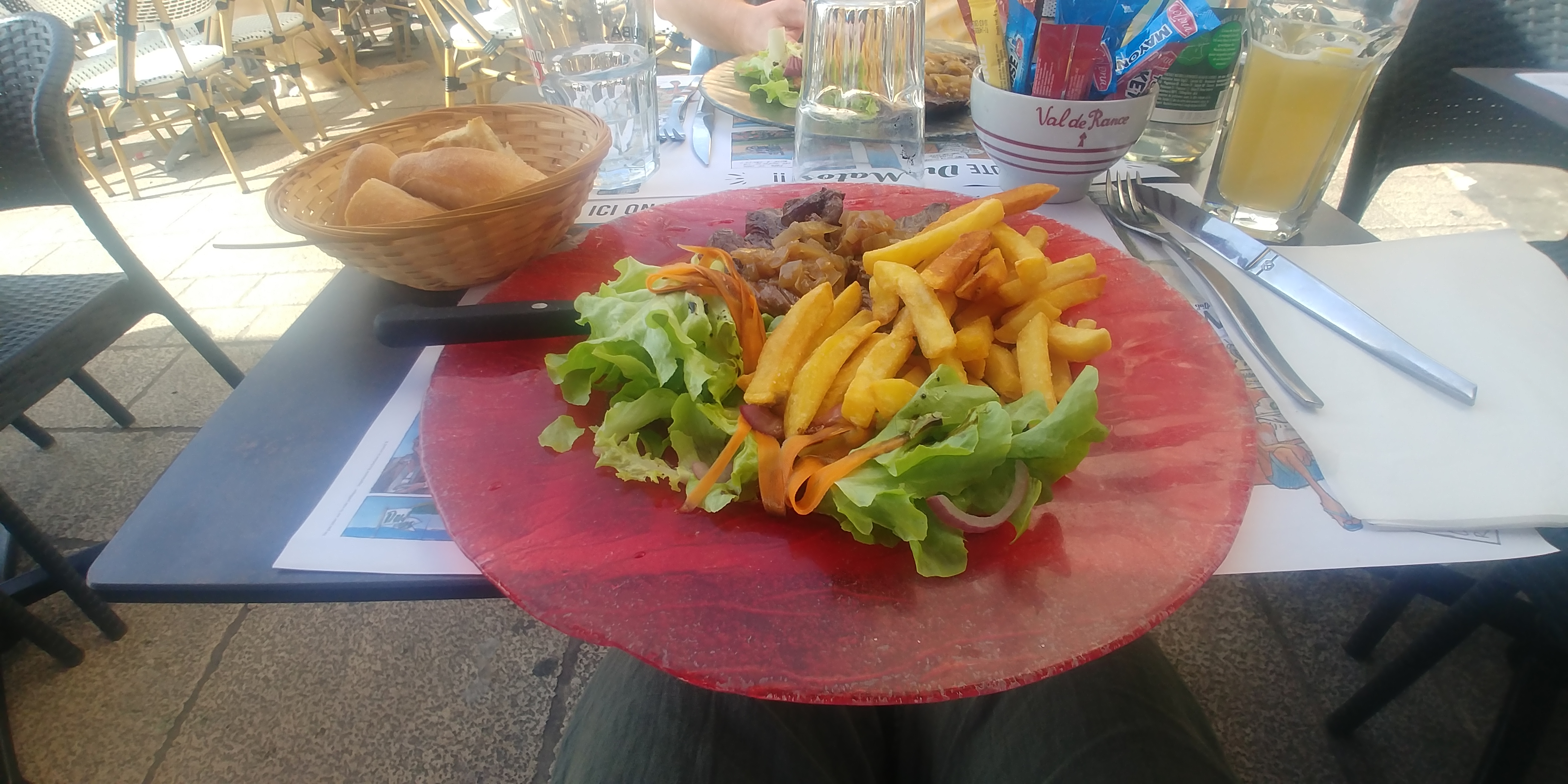 Il vaut mieux passer votre tour et trouver un restaurant un peu moins touristique quelques rues plus loin. Les plats ne sont pas à la hauteur des tarifs. Nous avons eu une salade repas décevante : salade mal lavée et peu garnie pour un tarif assez élevé. Les moules sont correctes mais surcuites et manquent de saveur. Dommage. Verres mal lavés. Nous tenons à souligner la sympathie d'un des serveurs qui gardait son sourire malgré le chaos ambiant. Merci à lui.