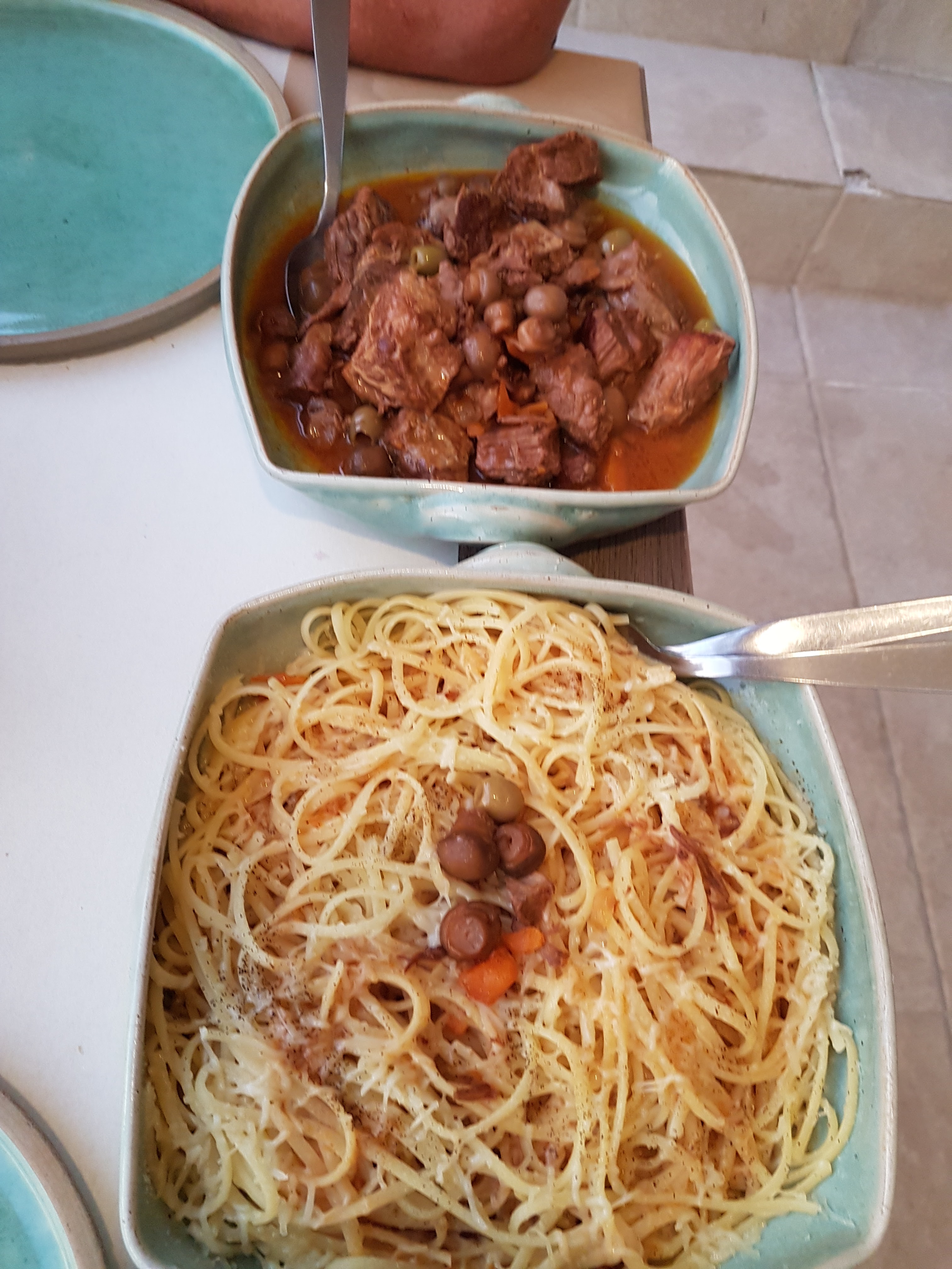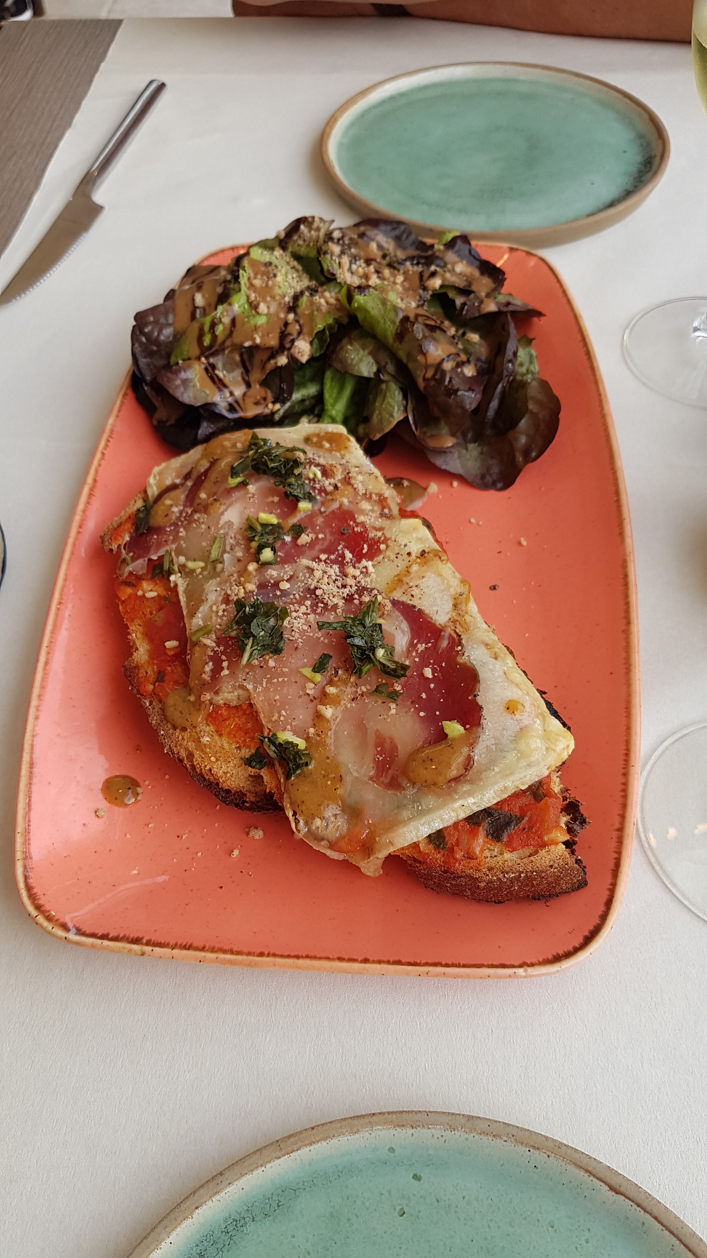 La nourriture était délicieuse, mais nous n'avons pas obtenu tout à fait ce à quoi nous nous attendions. J'ai par ex. Je ne m'attendais pas à ce qu'on serve du poulet avec des os ou à ce que des olives soient réparties sur la viande sans que cela soit au menu. Je qualifierais donc la nourriture de plus rustique avec une préparation plus rustique/traditionnelle. Le service était un peu stressant mais pas hostile. L'ambiance était un peu perturbée par la rue qui passe juste devant le restaurant. Cependant, ce fut un séjour agréable
