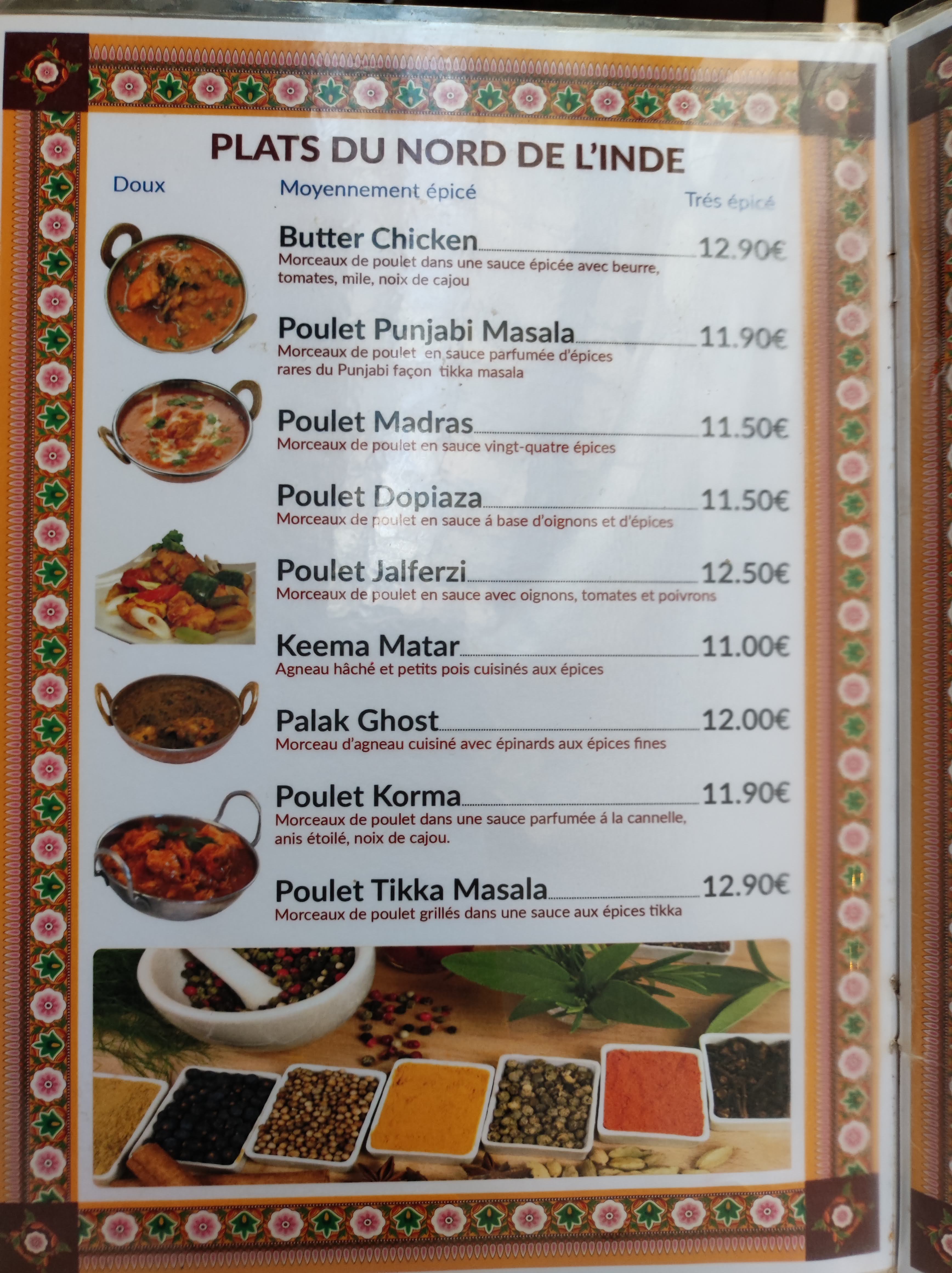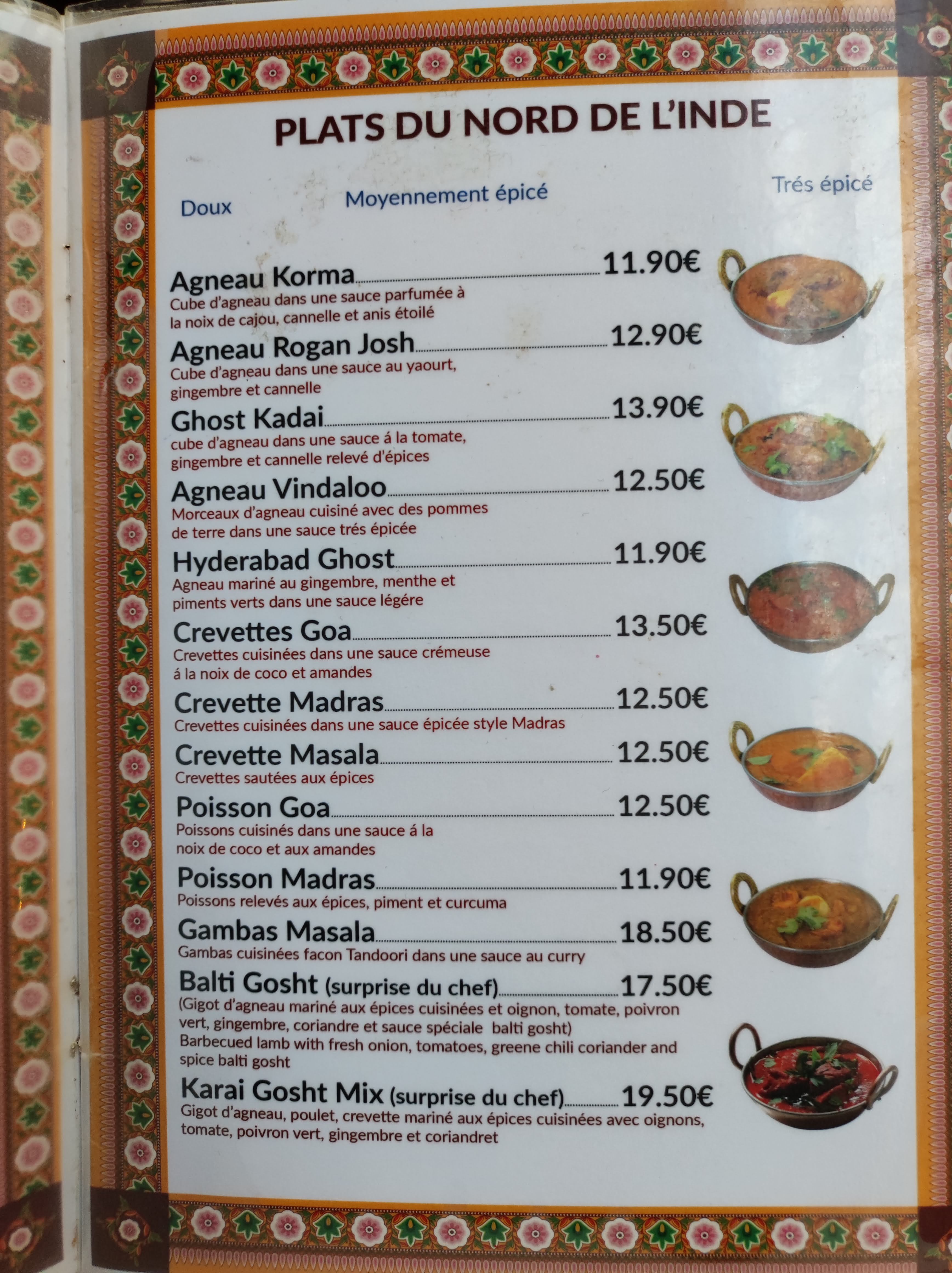 Cadre sympathique et accueil chaleureux. J'ai cependant été déçu dans l'ensemble : - Peu de viande. Sur la photo du menu il y a une cuisse de poulet entière, mais finalement dans l'assiette il n'y a qu'une moitié. Par ailleurs, concernant les viandes en sauce, il n'y a que deux pauvres morceaux. - Samoussa avec viande sur le menu, mais en réalité fourré à la pomme de terre uniquement, - Le serveur nous offre deux naans au fromage pour nous convaincre de nous assoir. Mais in fine, lorsque la note arrive, aucun geste commercial. Le soit disant naan est simplement déjà compris dans le plat à 16,50€... On peut trouver bien mieux !