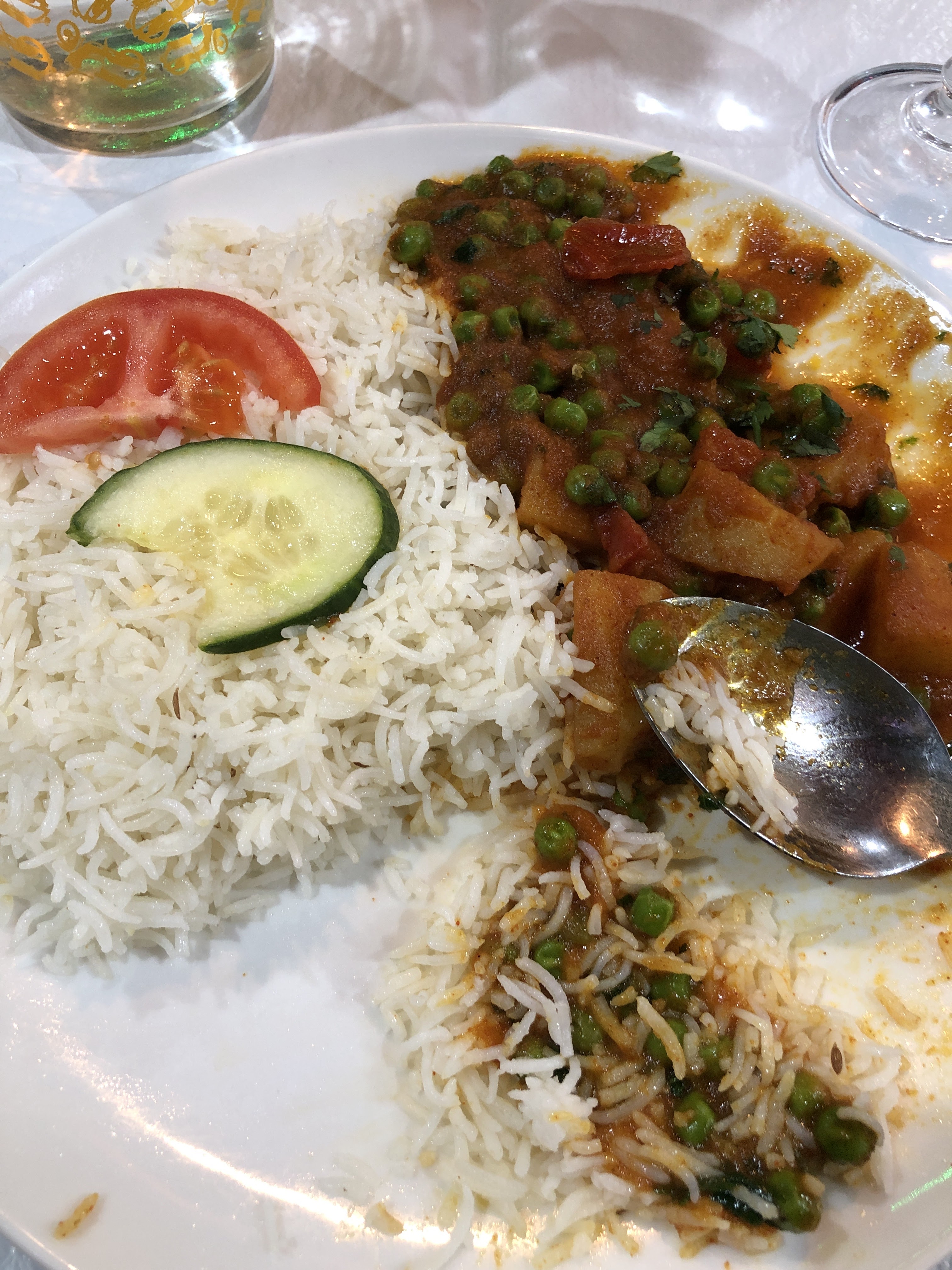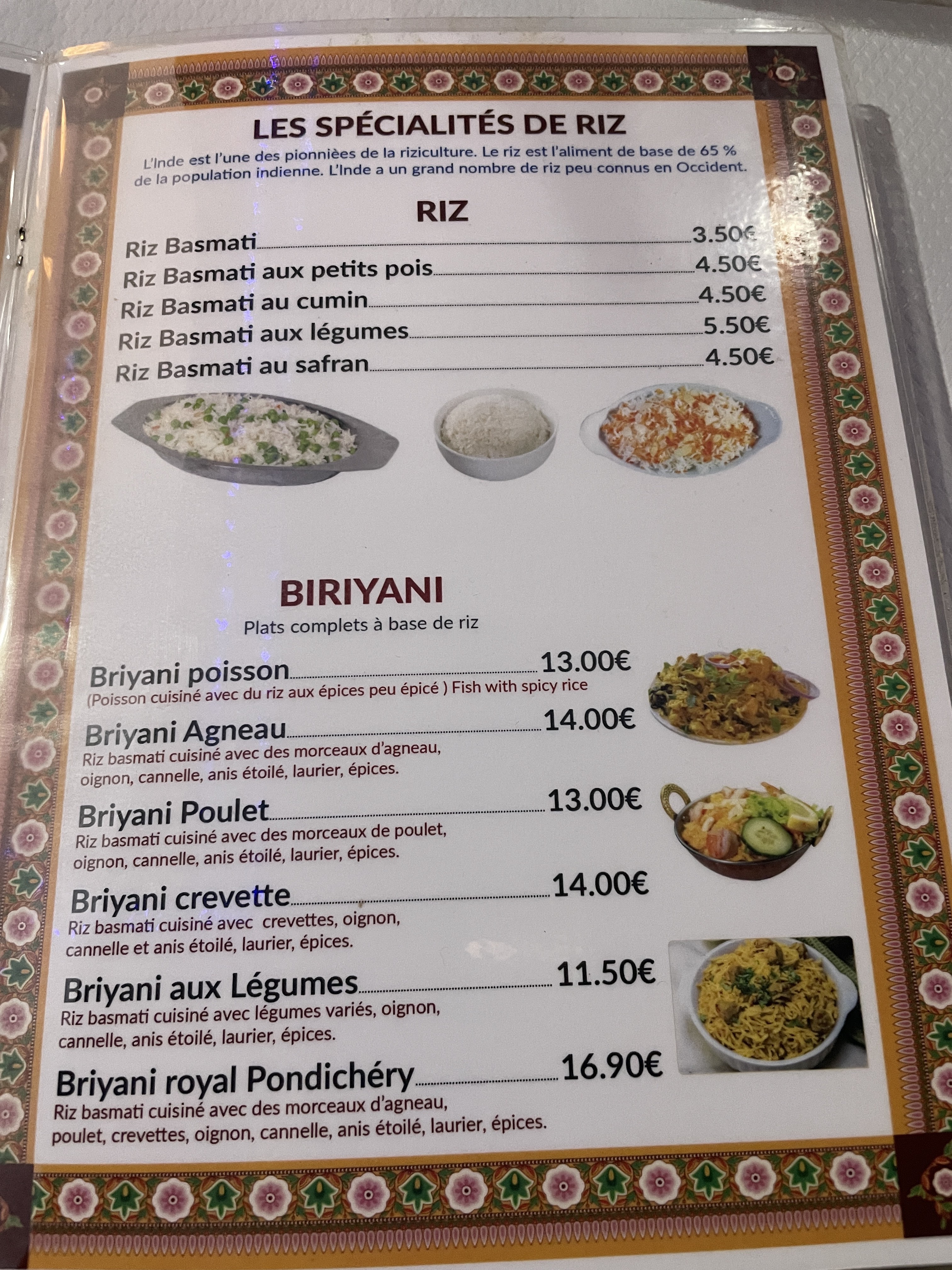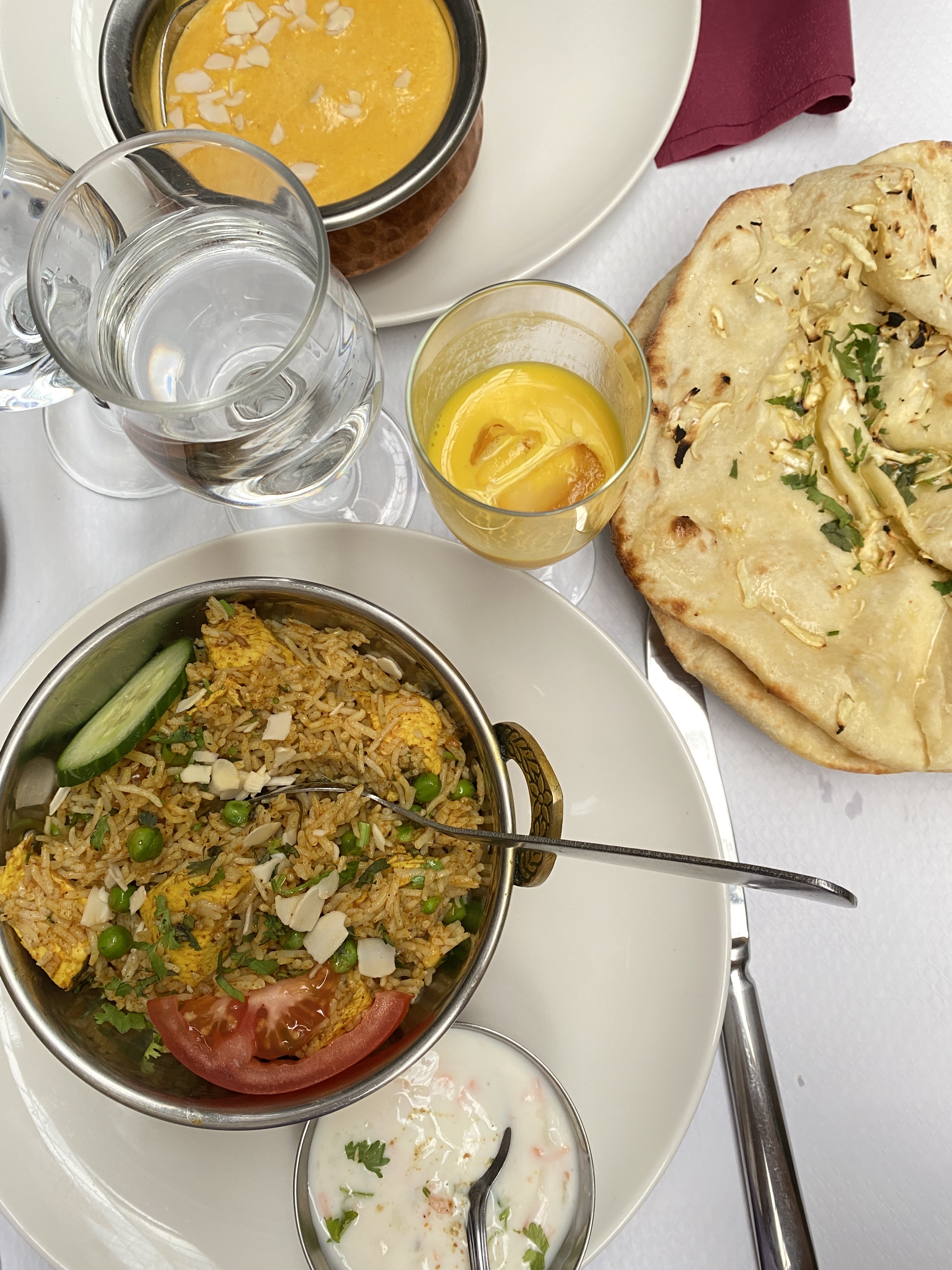 Surprise de voir qu'il n'y avait pas de monde car c'est un bon restaurant avec des prix plus que raisonnable. Les gérants sont très aimable et m'ont offert une boisson. Je conseille le lassi à la mangue et les plats en menu ou le poulet biryani.