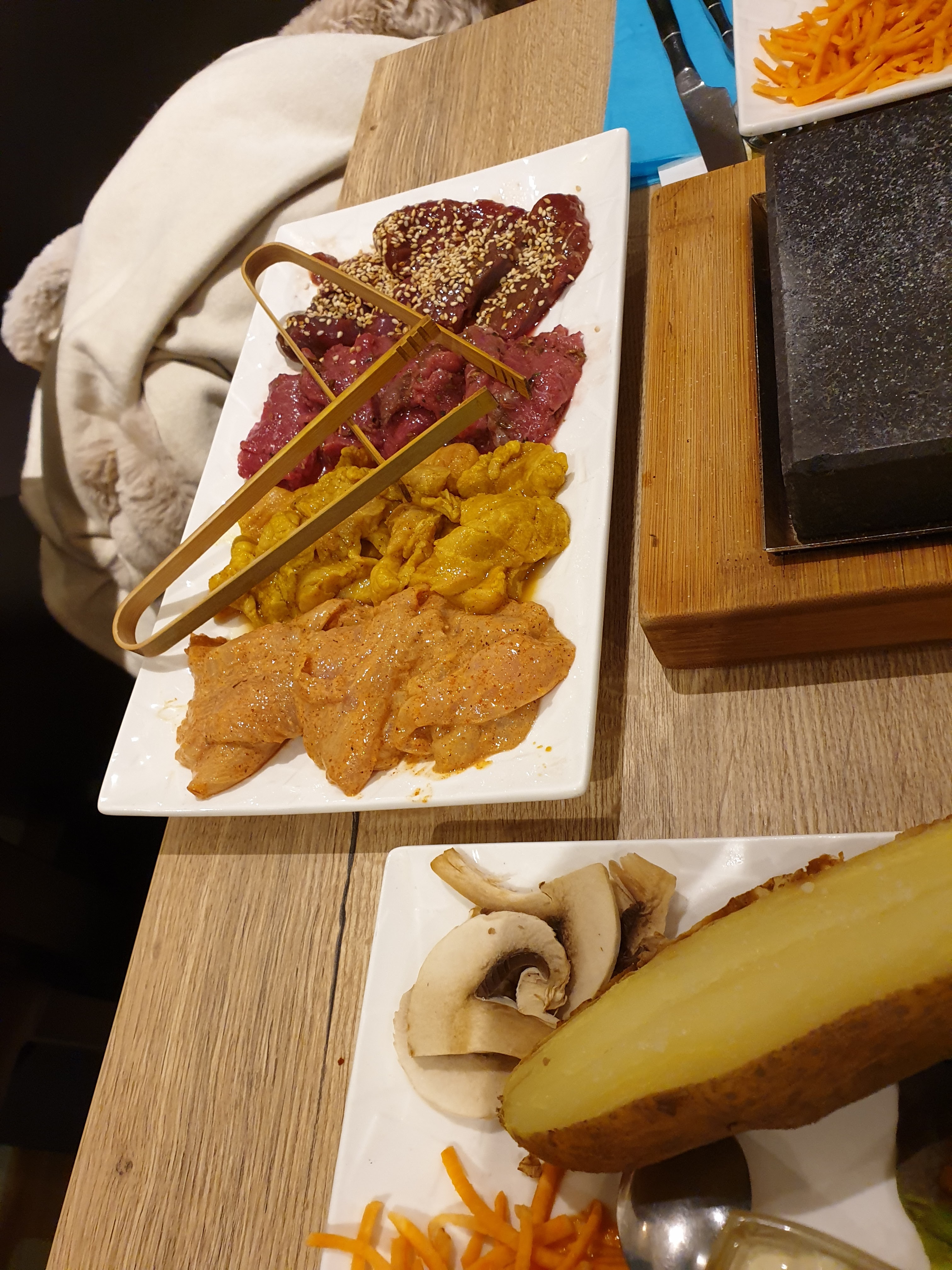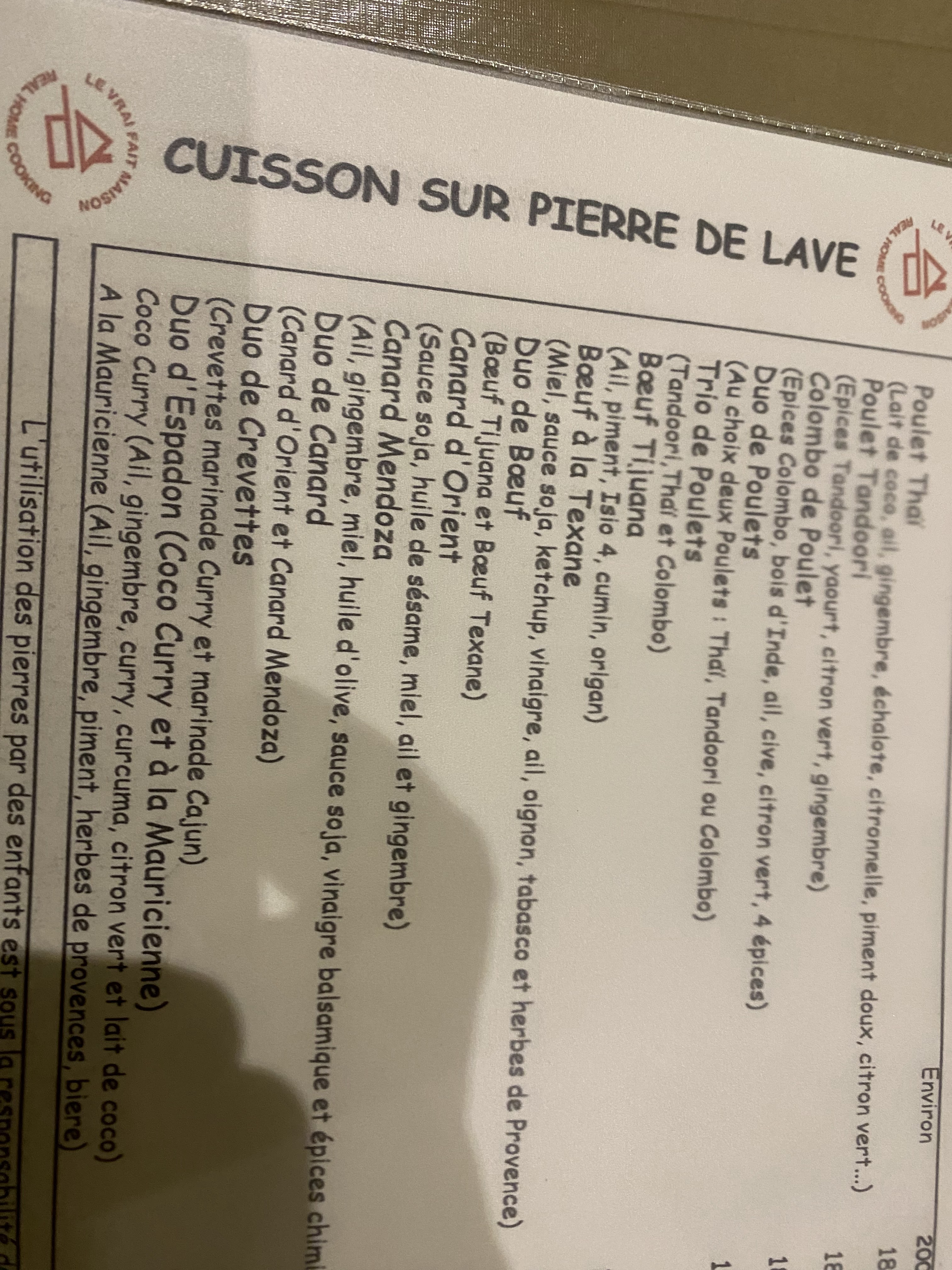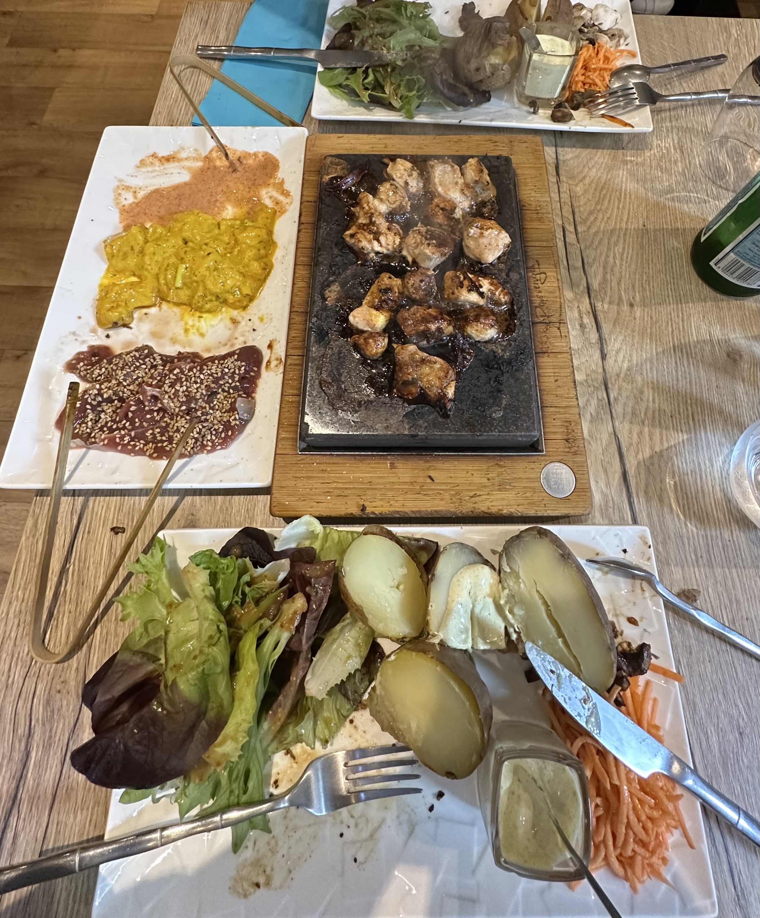 Cuisson à la Pierre sur la table, pas adapté aux plus petits. Plats copieux. Dessert pas terrible.