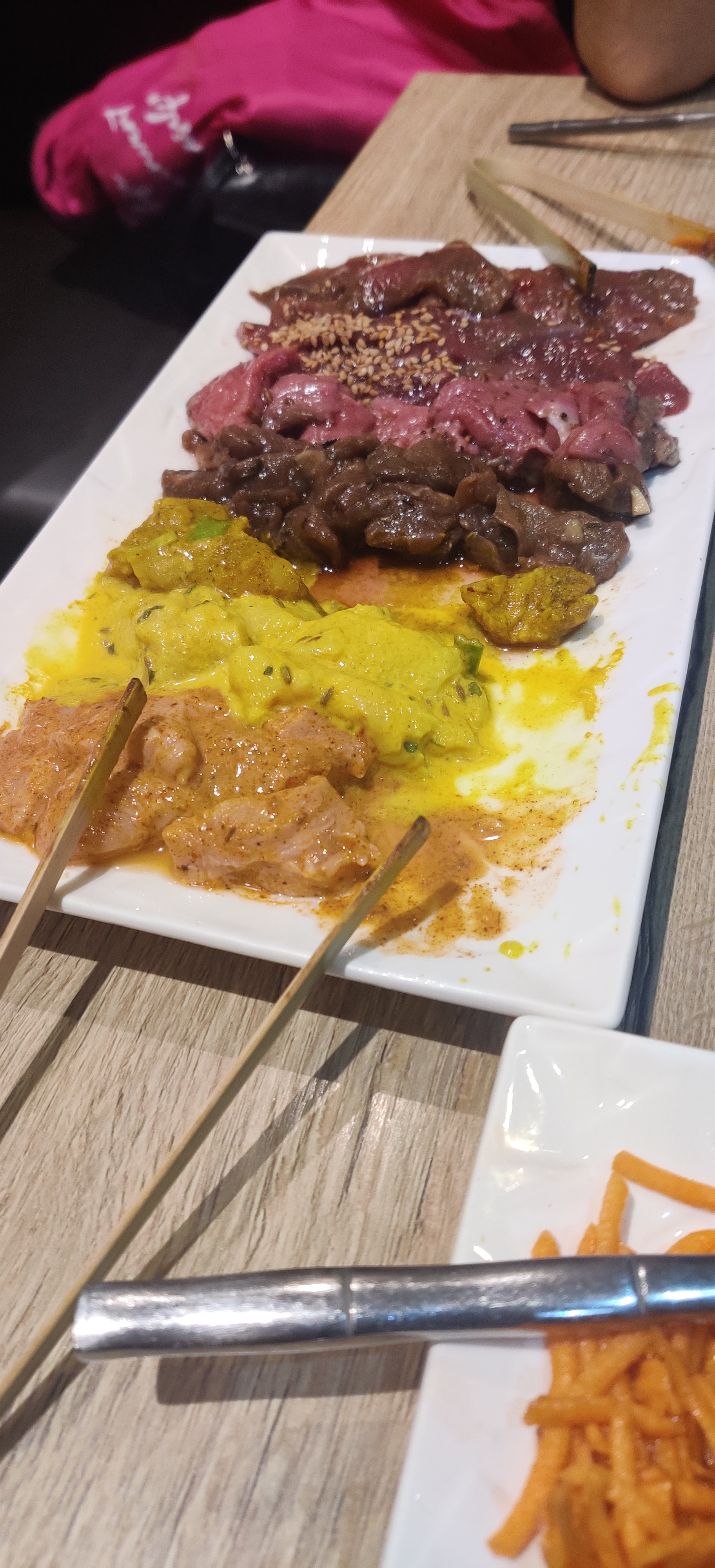 Service irreprochable, concept original, viande marinée TRÈS BONNE. Je regrette juste le manque de légumes dans l'assiette d'accompagnement.
