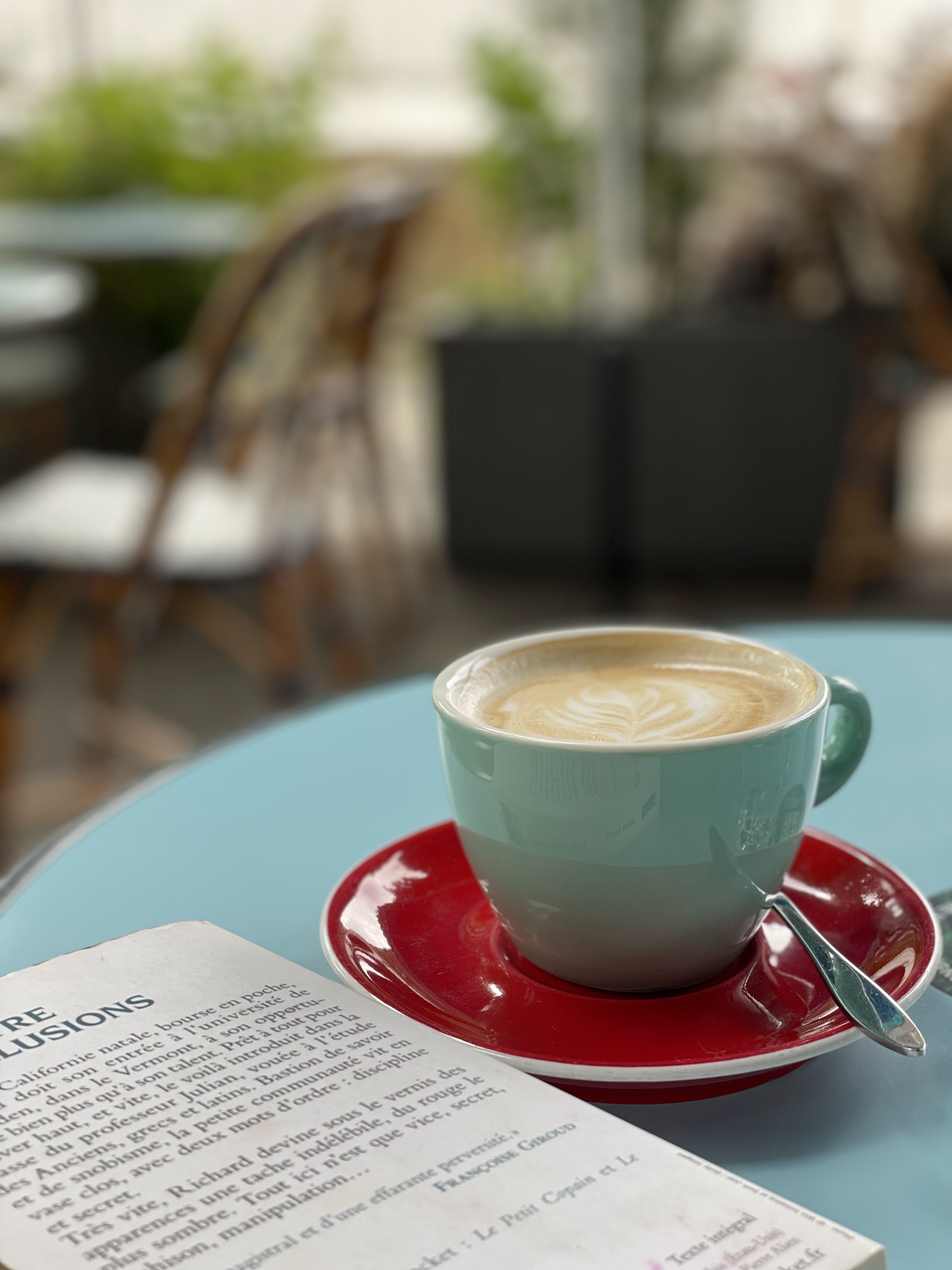 Mon café crème de l'après-midi sur la terrasse de ce charmant endroit. J'adore le nouveau design, les nouveaux meubles et couleurs authentiques ! Délicieux café crème. Bonne lecture et observation des gens - quoi d'autre ? 😁