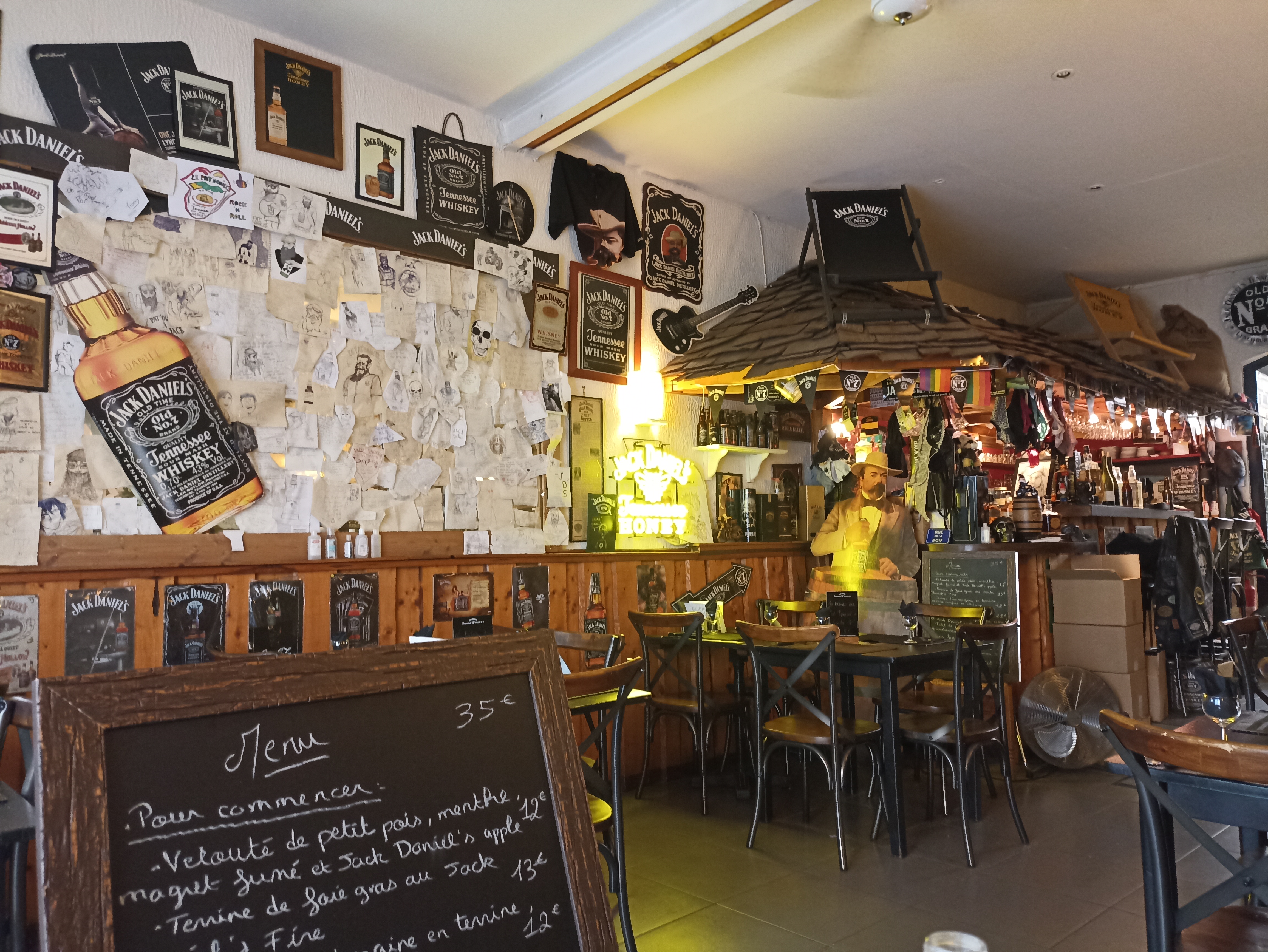 C'est un restaurant qui est en fait un lieu de vie...pour y aller vous devez aimer la vie, les gens, rire, profiter de l'instant présent. C'est un personnage haut en couleur qui dès la première seconde vous ouvre ses bras... Vous aurez tout un repas pour apprécier le fil rouge de ce moment : le Jack Daniel's... Mais il a d'autres whisky en réserve qui ne laissent pas indifférent... Si vous n'y êtes jamais allé, c'est vraiment dommage car vous raté un moment inoubliable... La carte est réduite ce qui me rassure au niveau de la qualité des mets, dans lesquels vous retrouverez le Jack Daniel's en arrière goût... La décoration ne laisse pas indifférent non plus...