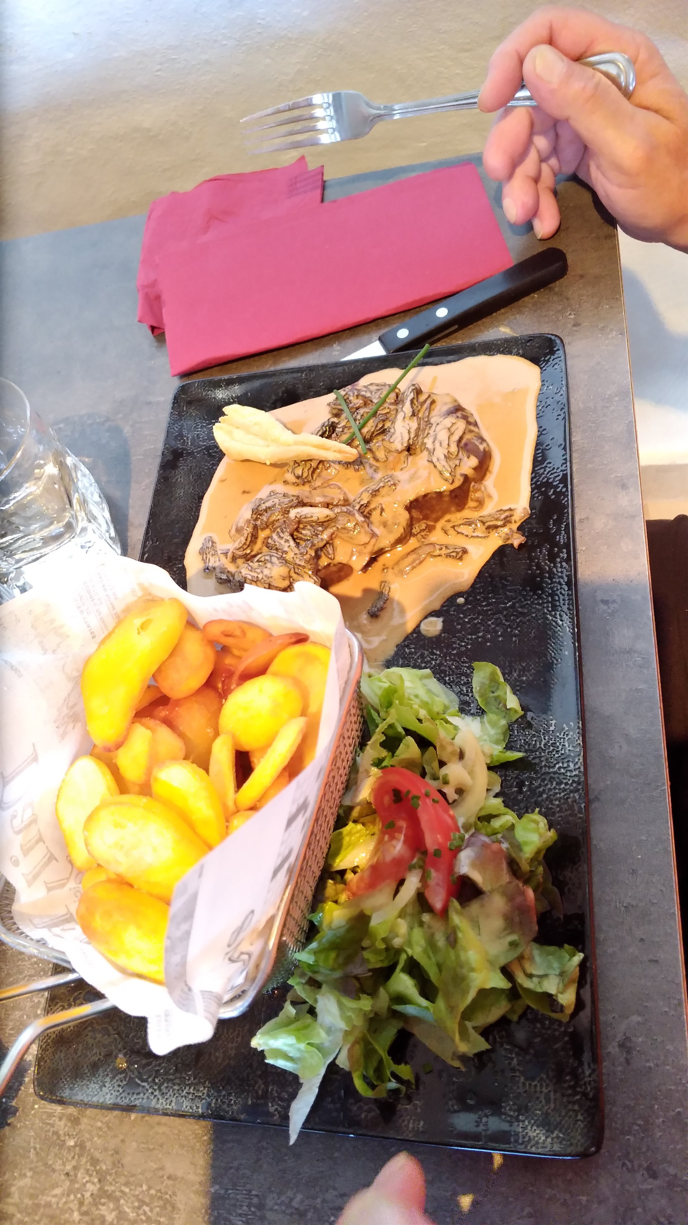 Très bien mangé, les croûtes aux morilles sont copieuses et délicieuses. Seul bémol, on ne nous a pas demandé si on désirait du vin. Sûrement un oubli.