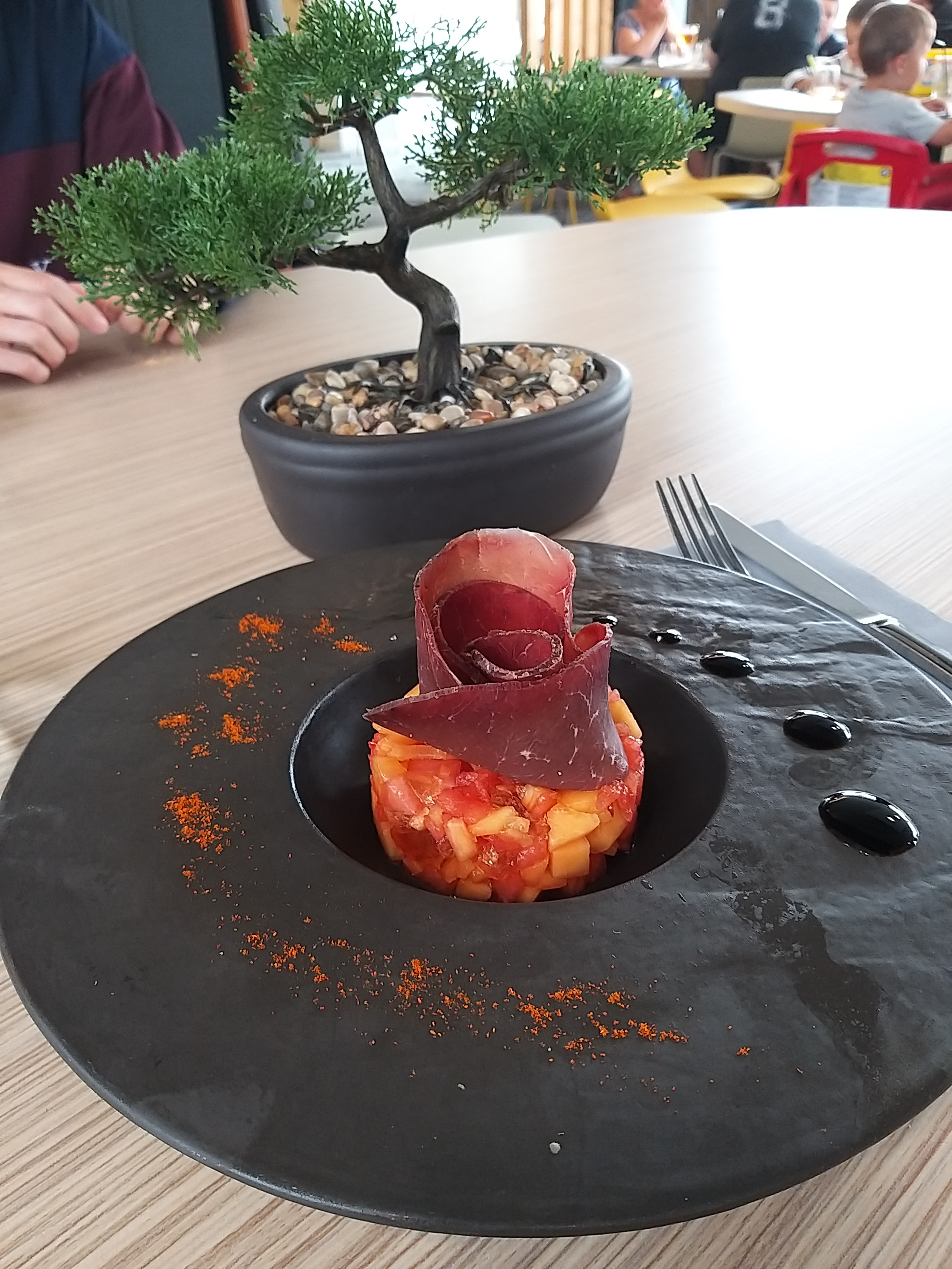 Personnel agréable , un peu mal organisé pour le service par contre , peut être des choses à revoir... Personnellement j ai trouvé que les plats manquent terriblement de saveur . C est dommage car c est très bien présenté par contre . Terrasse extérieur sympathique et calme