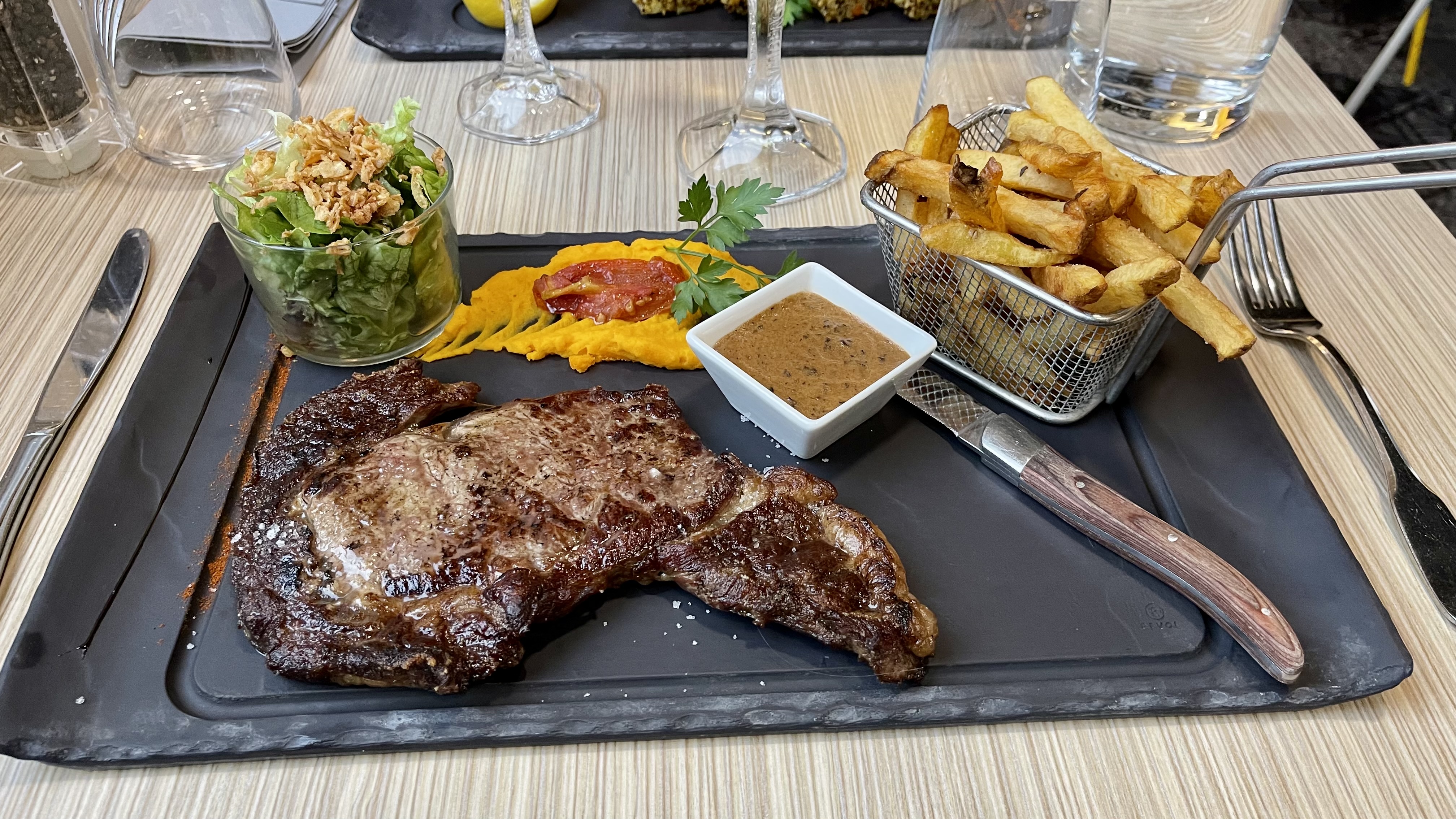 J’y était toujours allé avec des promotions, c’était toujours superbe et l’accueil parfait. J'y suis retourné en février 2020 à l'occasion d'un stage. Ce fut l'occasion de découvrir la carte et son entrecôte Black Angus. L'entrecôte était bonne, mais je n'ai rien trouvé d'exceptionnel dans ce produit si réputé. Conséquemment, je trouve le rapport qualité-prix assez médiocre, ceci est de ma responsabilité, je me méfie ordinairement des modes. Le vin sicilien conseillé par le monsieur qui nous a servi fut une très belle découverte. Je reviendrai