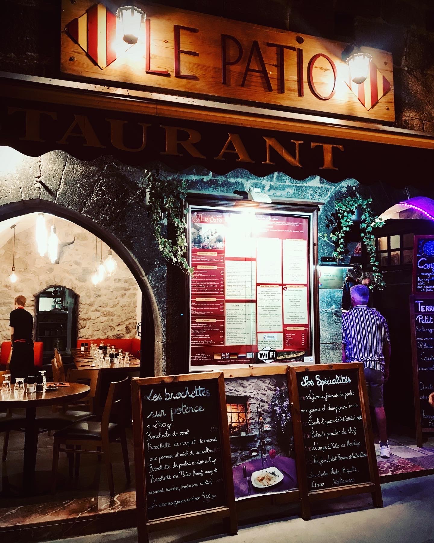 Beaucoup de restaurants dans ce village fortifié, Le Patio propose des menus variés, à des prix abordables. On aurait préféré déjeuner dans le patio en ce samedi midi plutôt que dans la salle avec cheminée, car les tables sont trop serrées. Sur les plats traditionnels, que du très bon, service impeccable, bravo à l équipe ! 🐻