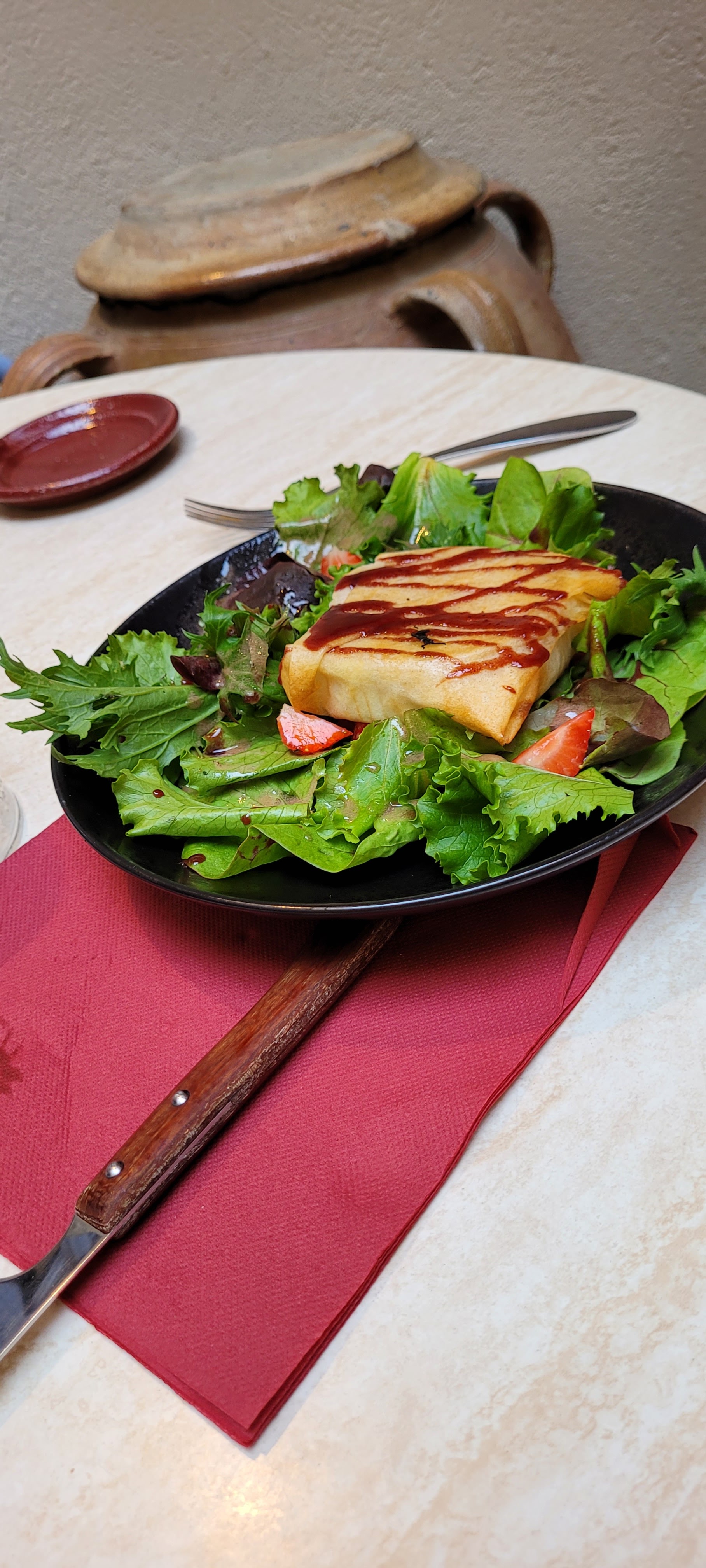Repas excellent , accueil sympathique l endroit est typique avec un sublime sapin de noël dans le patio … toujours aussi bon et frais .. Chapeau à La Cheffe 😋