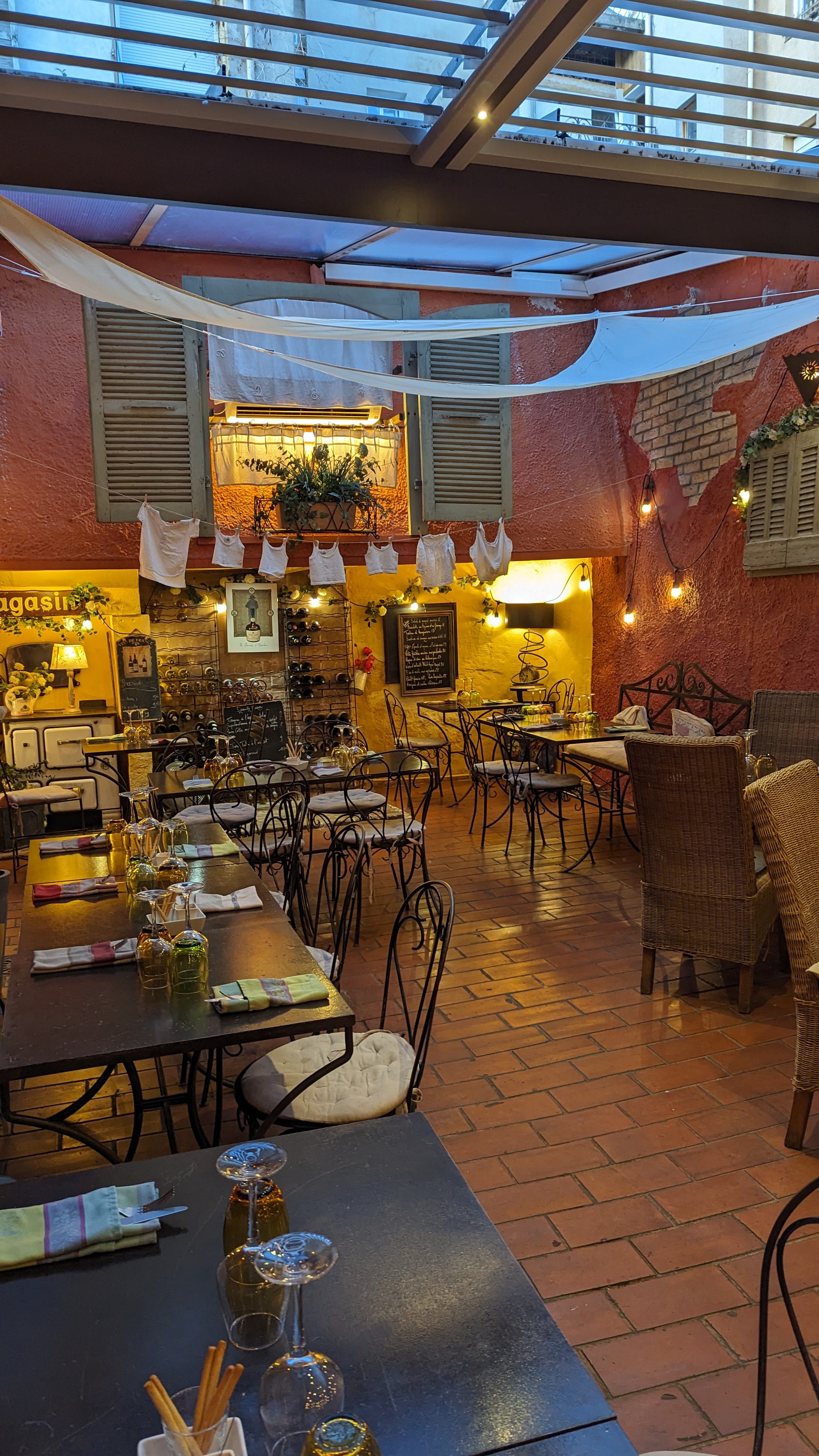 Une jolie adresse dans une rue peu passante du centre d'Aix. le décor est très sympa et original (cour couverte) ; service attentionné. La cuisine est bonne, même si pas très raffinée. Le rapport qualité prix pourrait être amélioré