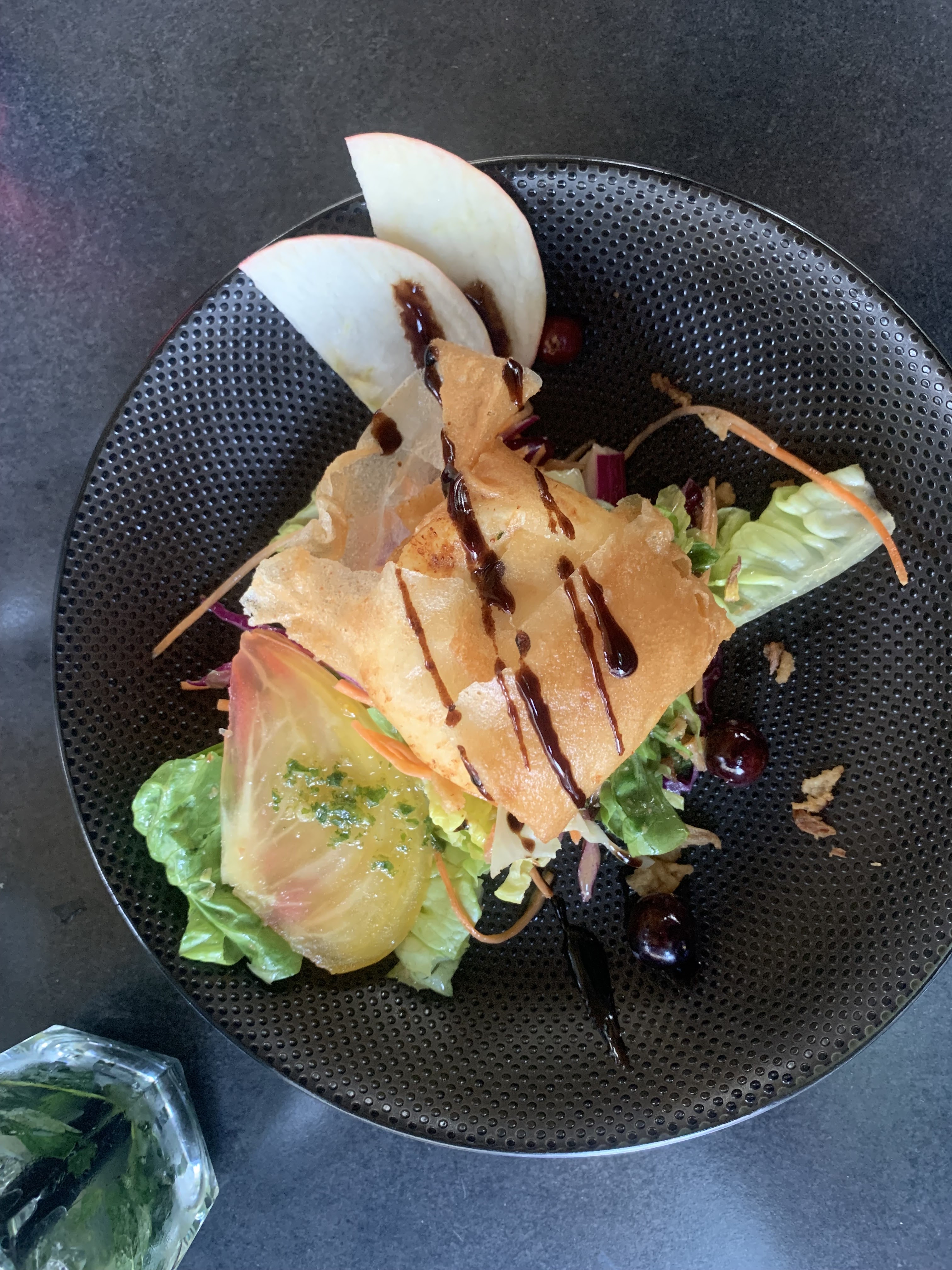 Plutôt de bonnes idées et de belles assiettes, mais une cuisine trop grasse à notre goût, et plusieurs plats manquants qui nous faisaient envie. En +, pas de chance sur 2 points : concert sur la place, que nous aurions pu apprécier par ailleurs mais qui rendait les discussions impossibles. Pas cool pour nos retrouvailles en famille ! Cerise sur le gâteau 😏, 2 oiseaux perchés au-dessus de nos têtes ont voulu participer au festin (ou plutôt nous faire participer au leur... à 2 cm de l'assiette). Pas cool, vous dis-je...