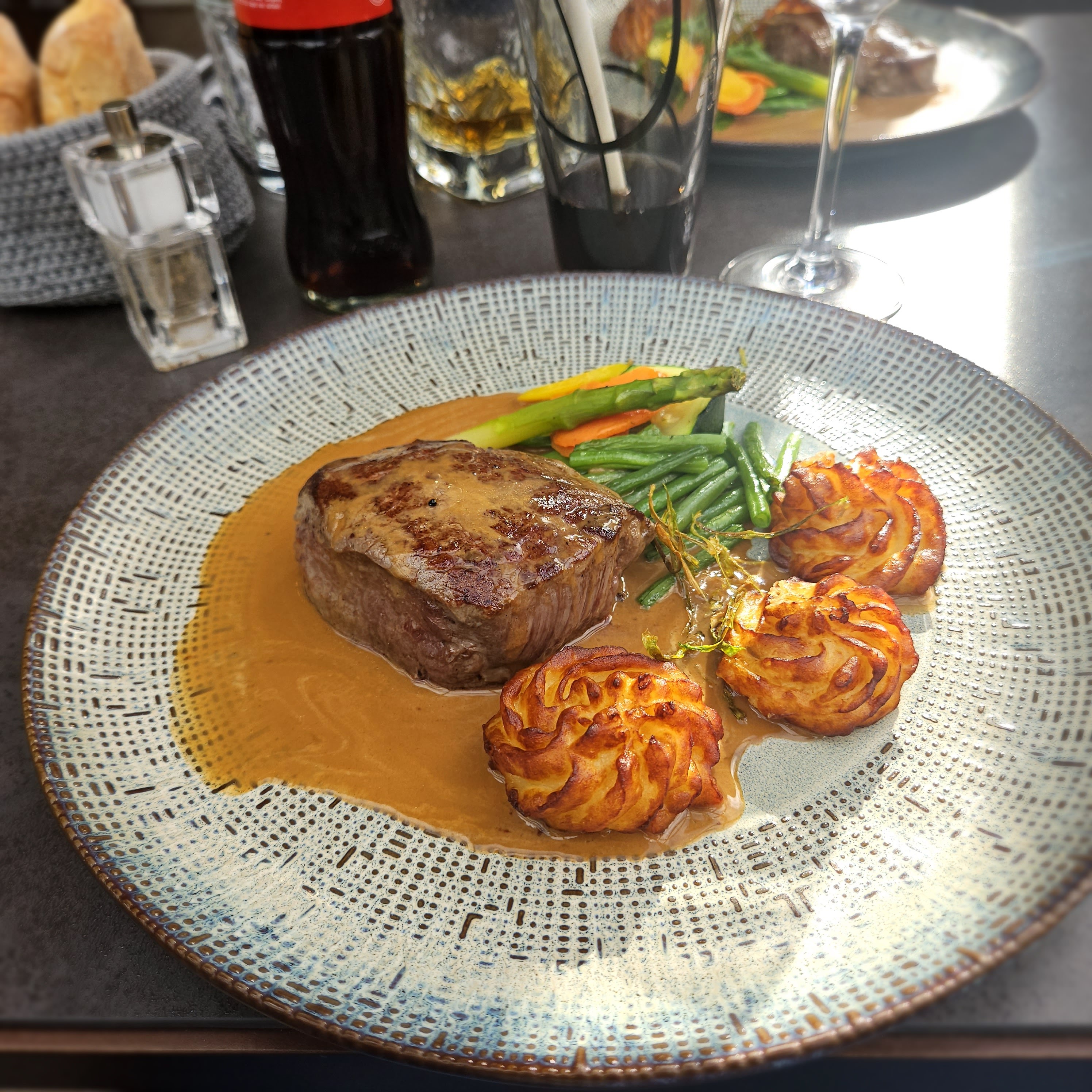 Beau cadre- par contre se veut cuisine gastronomique mais ce n'est pas trop goûteux et surtout on a faim quand on ressort même avec entrée plat dessert... Les portions sont ridicules