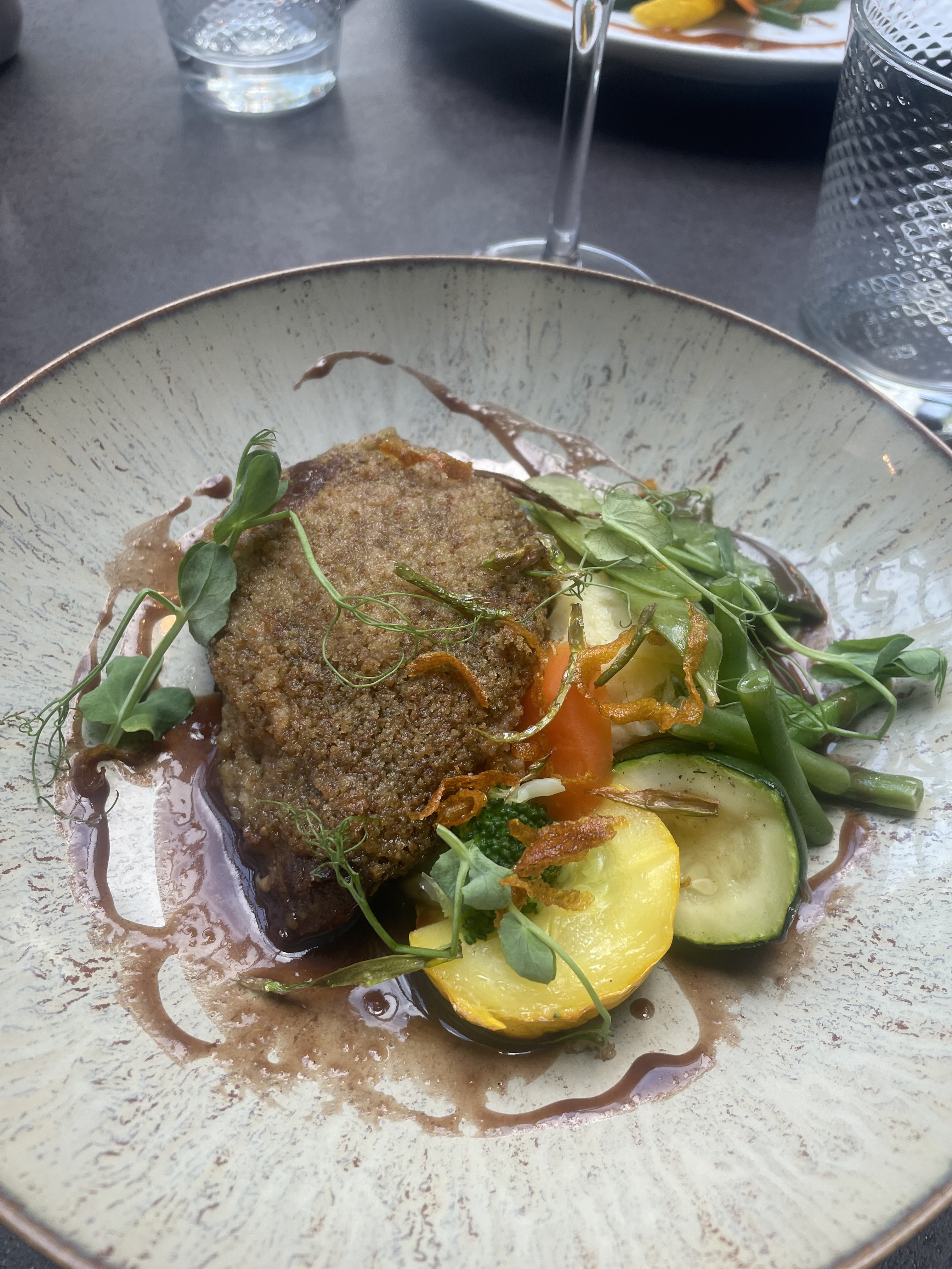 Superbes plats dans un décor plein de poésie, en terrasse avec vue sur le jardin. La table à côté a eu droit à des assiettes végétariennes faites sur mesure. Service attentionné et agréable.