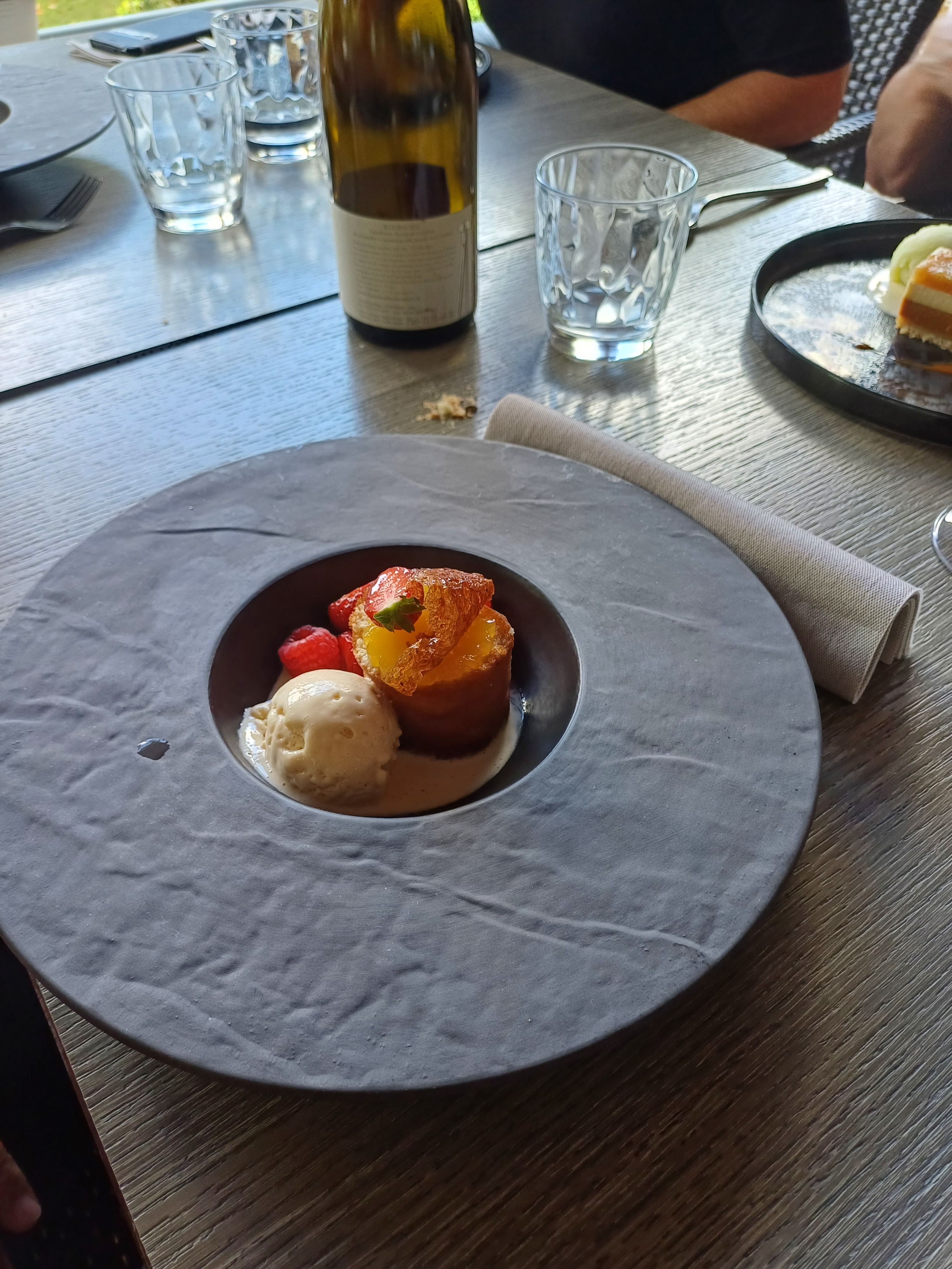Beau cadre. Côté service, assez déçus : pas d’échanges ni de conseils. Parfois un peu bruts. Côté nourriture, très déçus : on ne peut pas dire que c’est mauvais mais on ne peut pas non plus dire que l’on s’est régalés... on ressort tous avec le même avis : « bof ». Cuisine assez traditionnelle, pas d’originalité, fade, pas assez copieux, pas gourmand.... et donc vraiment trop cher !