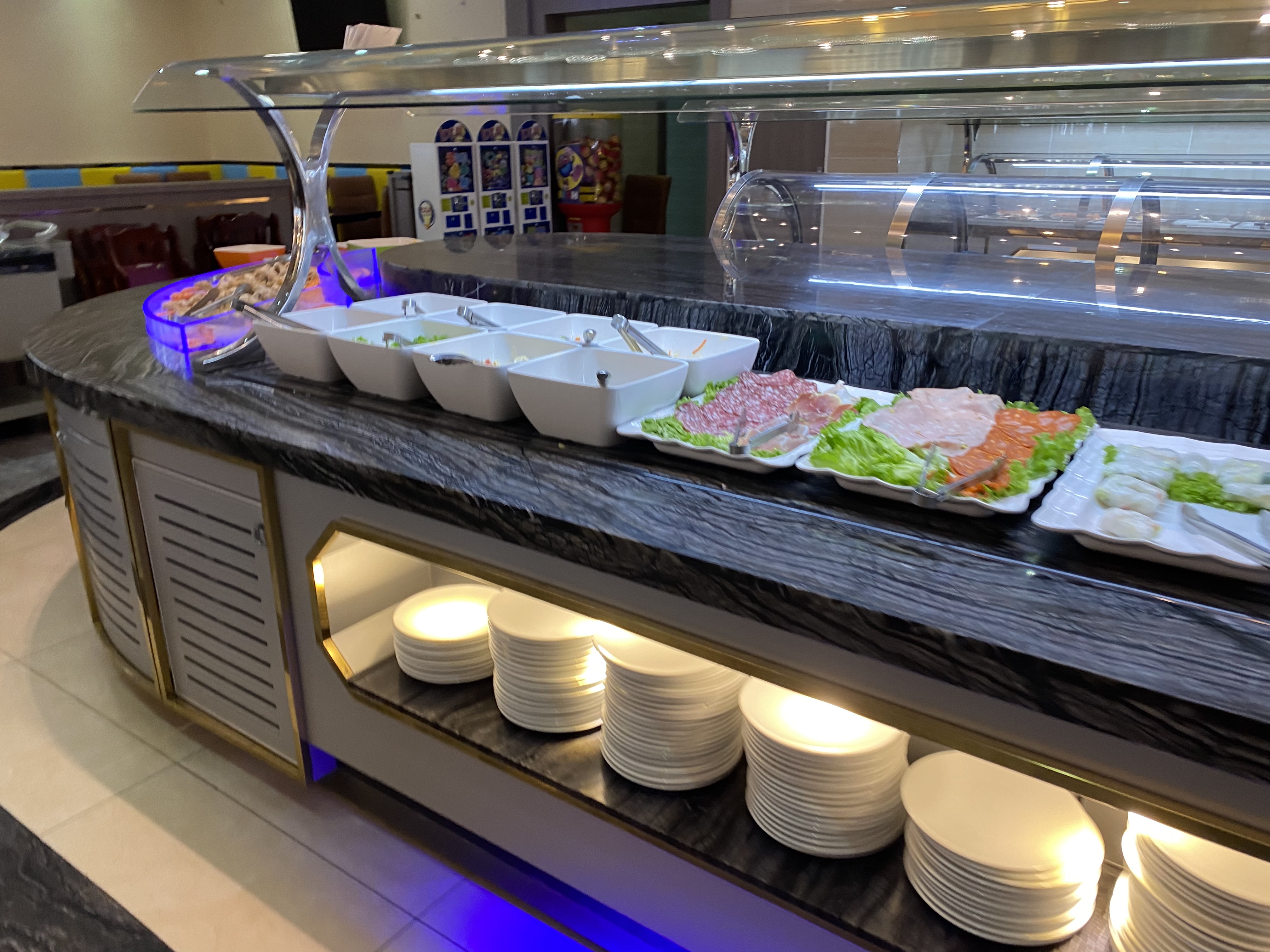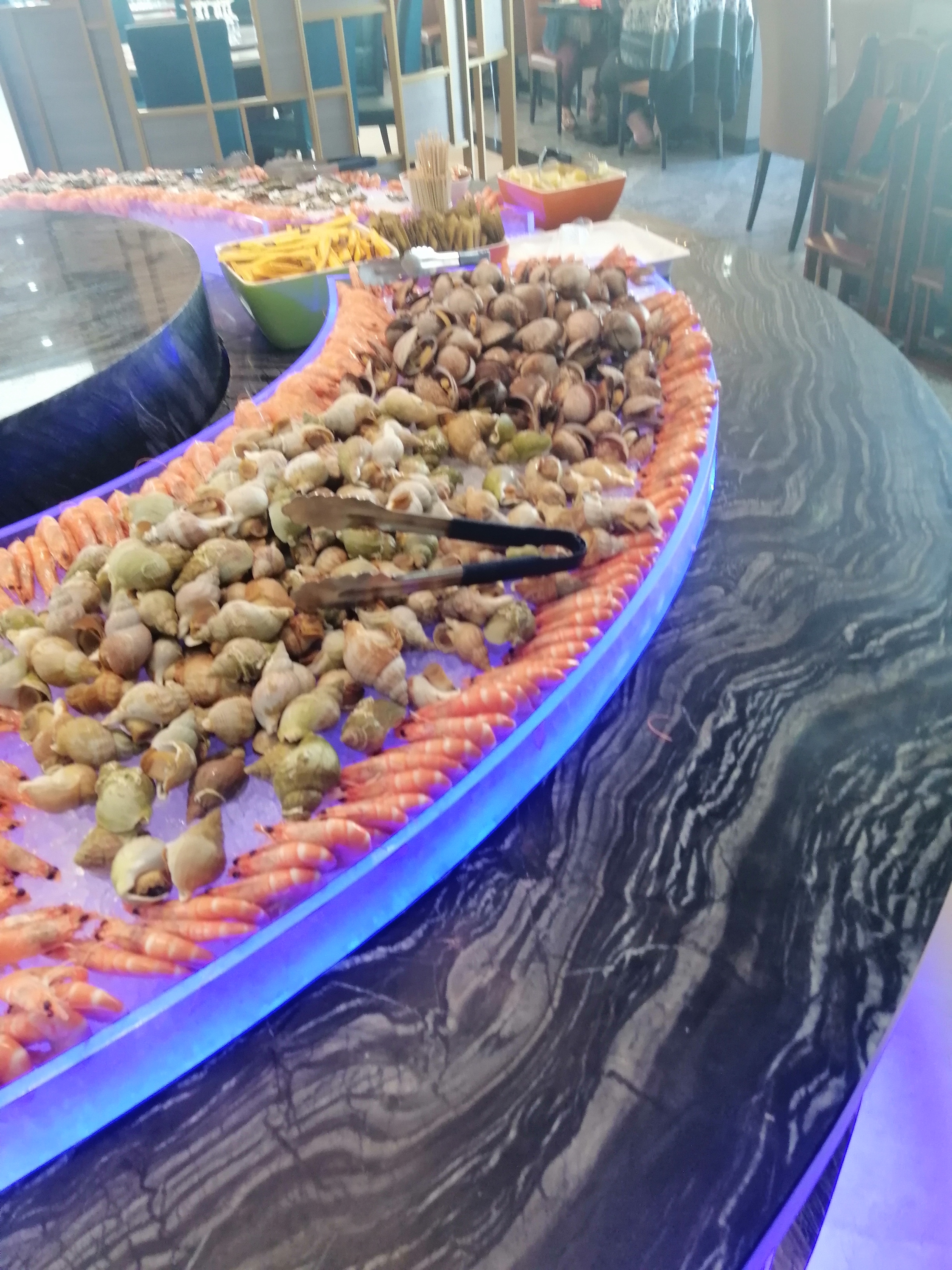 Grand restaurant bruyant avec beaucoup d'éclairage artificiel. Ce n'est pas l'idéal pour un dîner romantique. Le choix des plats est très varié mais la cuisine est trop industrielle. Idéal pour les gros appétits qui apprécieront le système du buffet à volonté.