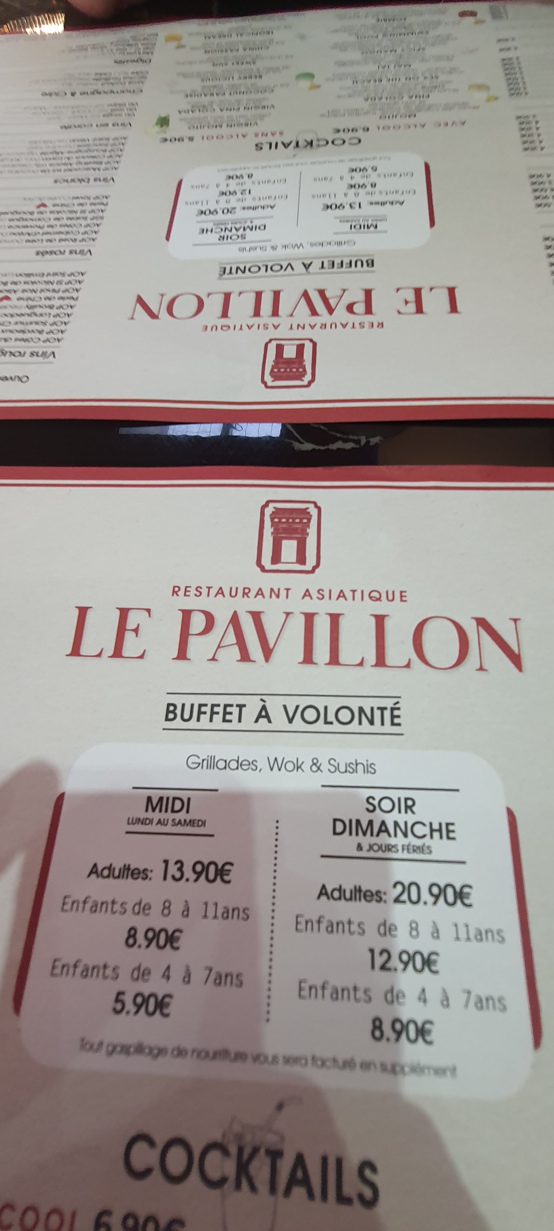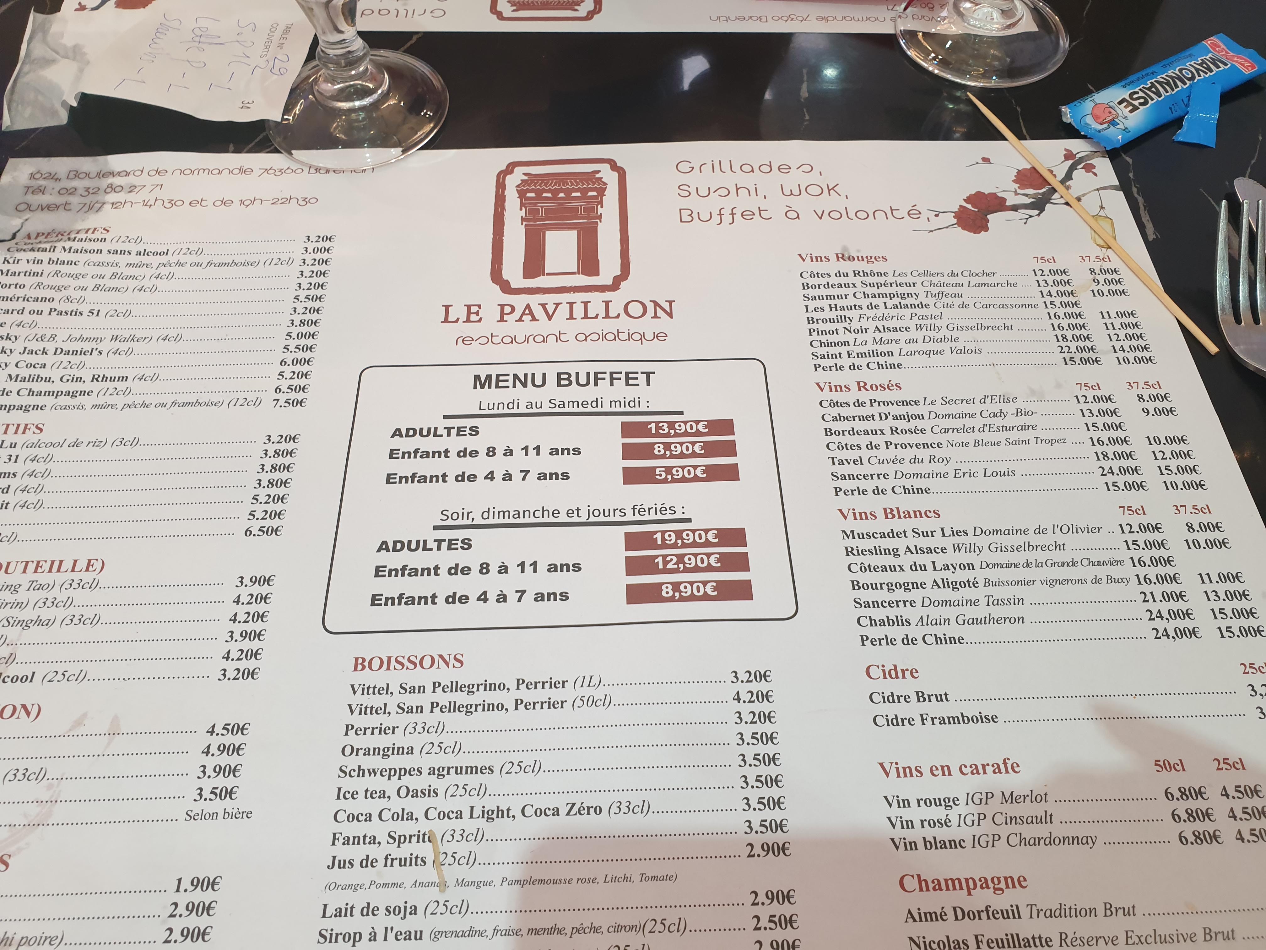 IMPRESSIONNANT !!! Je suis allé dans ce restaurant de style buffets à volonté asiatique tout à fait par hasard et j'en suis ressorti vraiment épaté ! Pour un prix très abordable (13€90 en semaine et 19€90 le soir, les dimanches et jours fériés) la qualité, la quantité mais surtout la diversité des produits font de cet établissement un restaurant à ne pas manquer. J'ai été vraiment impressionné par le choix des buffets. Vous pouvez manger Japonais, thaïlandais, chinois, français (frites, entrecôte, pomme de terre) ou même favoriser kes fruits de mer. Le service est très convenable mais par contre, il y avait beaucoup de monde. Mais quoi d'étonnant ? Le Pavollon est vraiment digne d'un restaurant servit à l'assiette. Bravo ! 😊