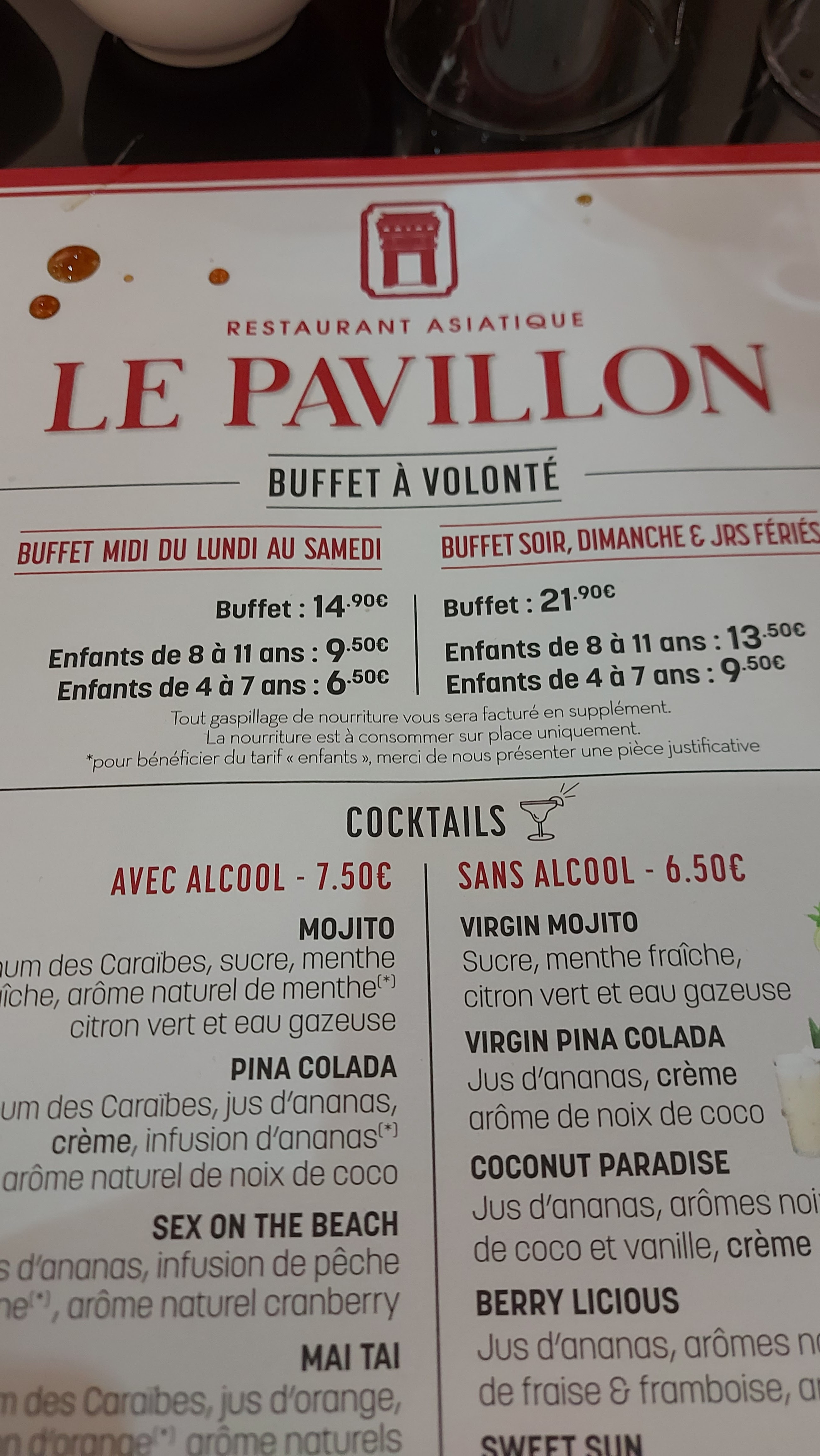 Très bon accueil. Propreté impeccable. Choix très variés du buffet. Sushi, wok, chinois, desserts, glaces et bonbons pour les petits ou bien sûr les grands enfants 😉. Je recommande.
