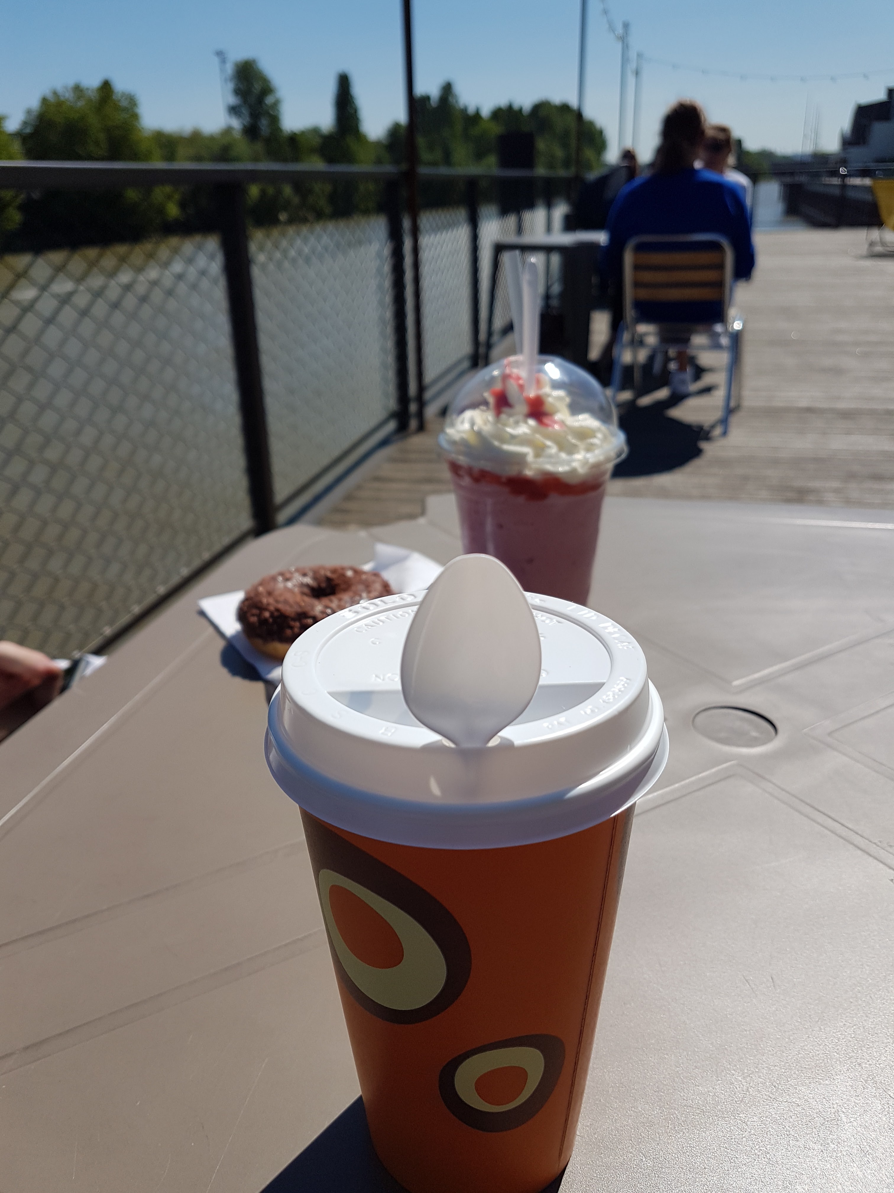 Une terrasse spatieuse sur le fleuve, avec de très bons frappés de mangue et de fraise tagada (les enfants adorent), de bons cafés latte king size. Entourée de verdure, le foot est bienvenu sur la pelouse, une promenade pavée où on peut faire du vélo, de la trotinette. Le seul hic : bruit du trafic venant de la route juste derrière, couverte qu'à moitié.