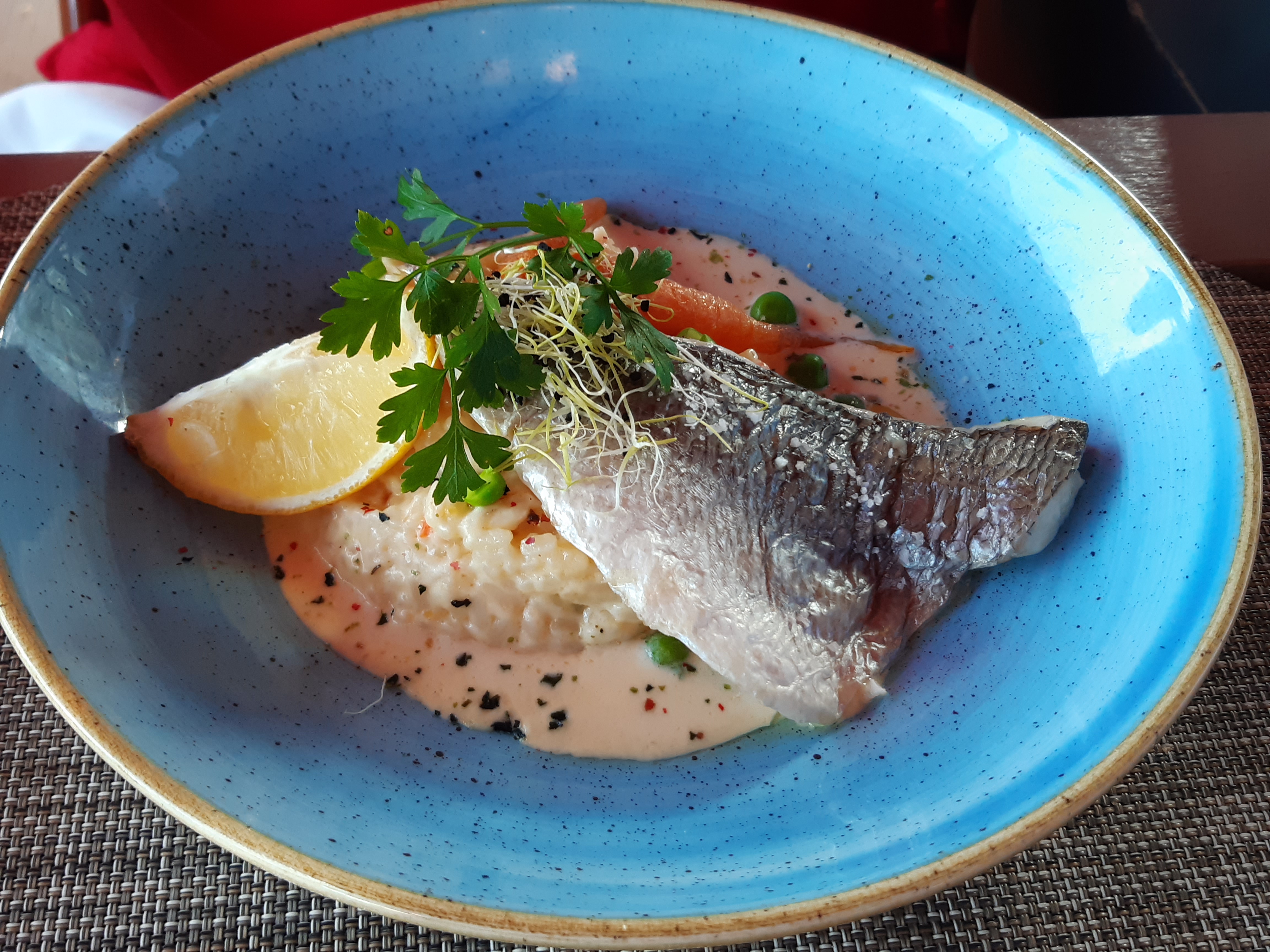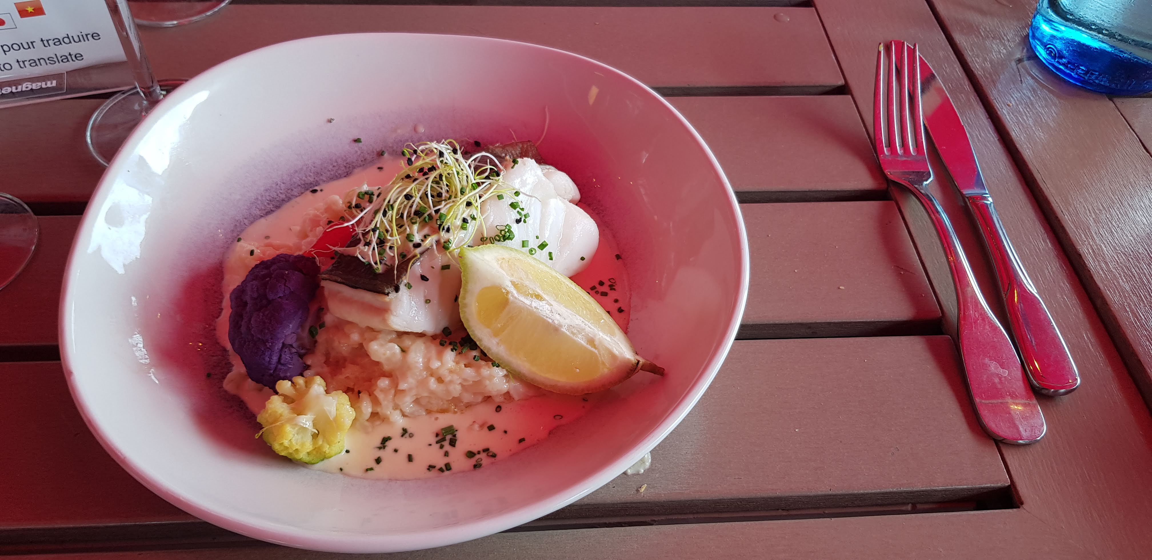 Bon accueil mais ⚠️. 4 petites gambas fades et dures, non décortiquées sur un risotto tiède, du pain de la veille et le poisson de mon épouse pas assez cuit. A éviter même si le serveur a fait ce qu'il fallait concernant la cuisson du poisson de mon épouse. 2* pour l accueuil et la bienveillance des 2 serveurs.