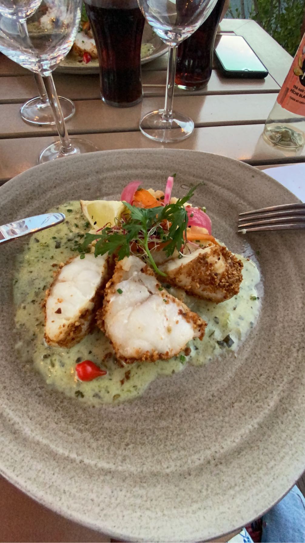 Excellent !!! Dorade et bar magnifiques Notre ado très difficile à adoré le bo bun Desserts très très bons aussi Très bons conseils sur le Vin