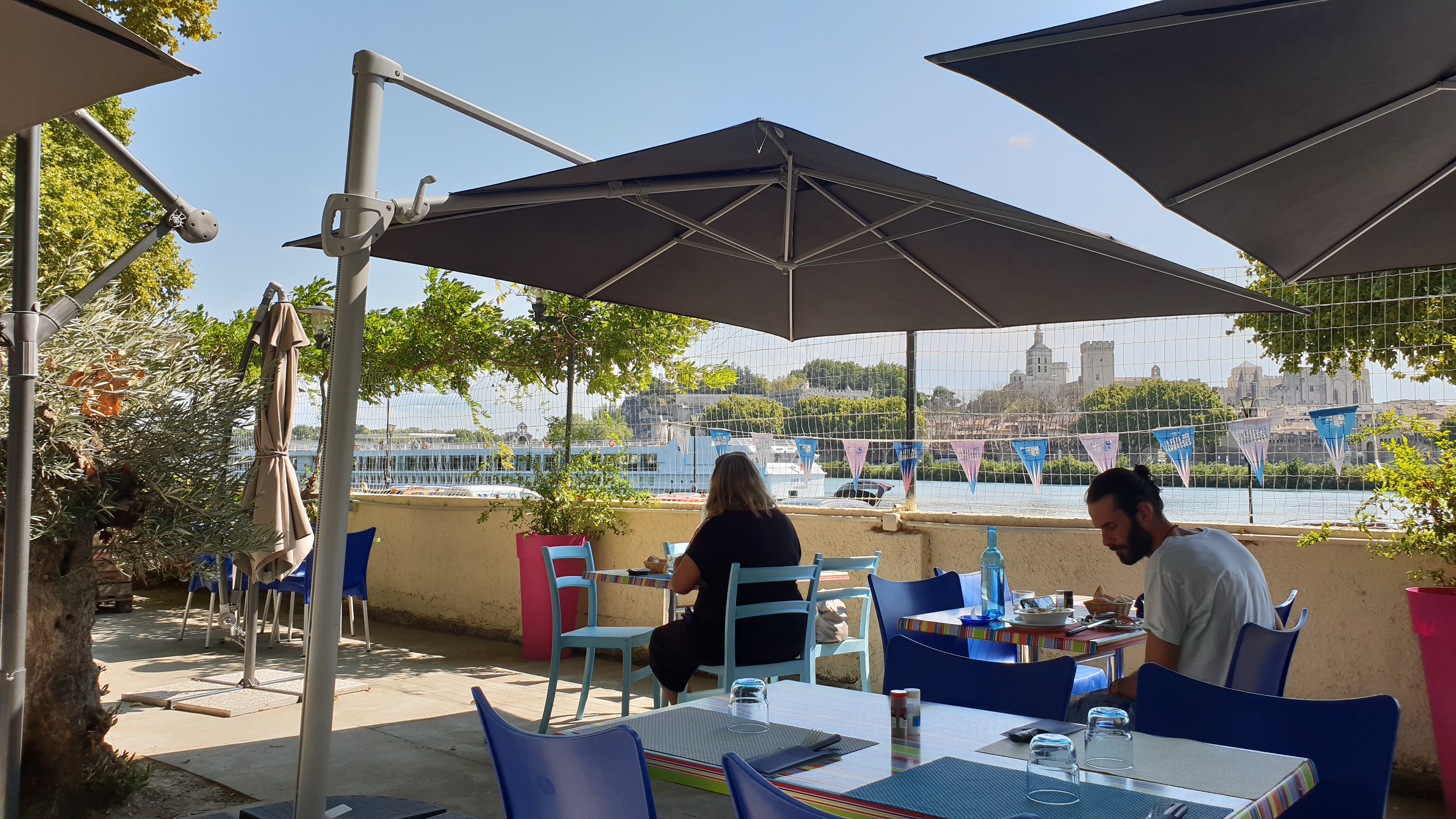 Sous les arbres, la vue sur le palais des Papes et le pont d'Avignon. Magnifique ! Une cuisine copieuse sans manières et à des prix tout à fait abordables . Le personnel aussi est très gentil ! Faites l'expérience de cet endroit au bord du Rhône ...