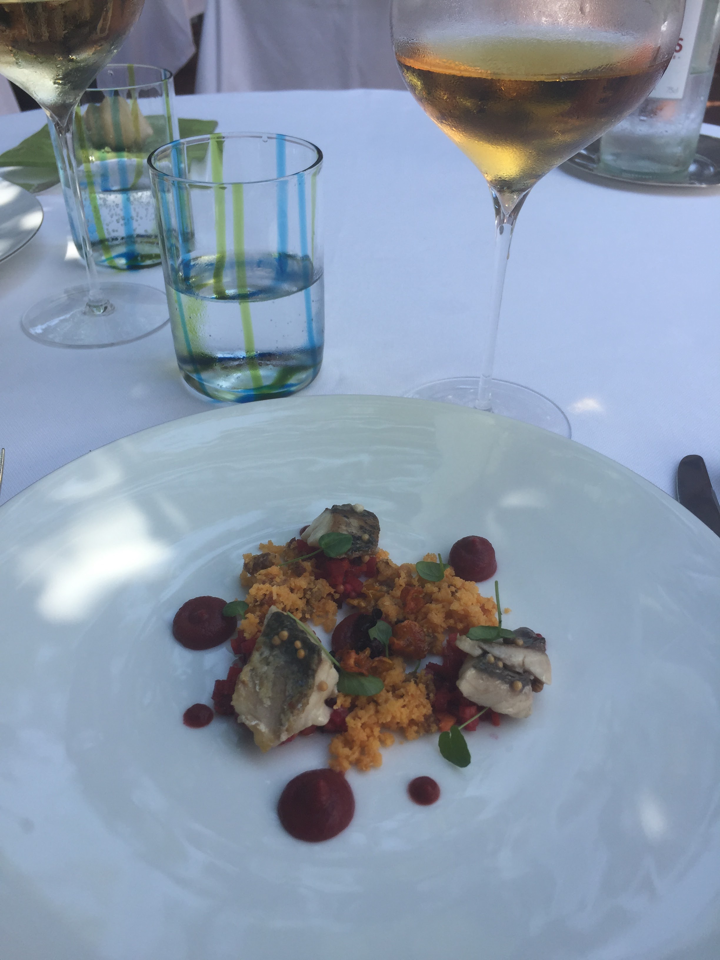 Une très belle table gastronomique. La terrasse est propice à prendre l'apéritif puis la salle intérieure -décorée de manière moderne- à prendre le repas lorsqu'il fait frais dehors. Le service est soigné, le maître d'hôtel gagnerait à sourire un peu, mais cela est compensé par la jovialité des serveuses. Seul bémol, l'accord mets-vins est décevant avec une option en 3 ou en 4 verres pour un menu en 9 temps, ce qui est un vrai point à améliorer dans un établissement de cette qualité. Globalement chapeau au Chef, qui nous fait le plaisir de sa visite des tables une fois durant le repas, et chapeau au chef pâtissier pour ses créations magnifiques.