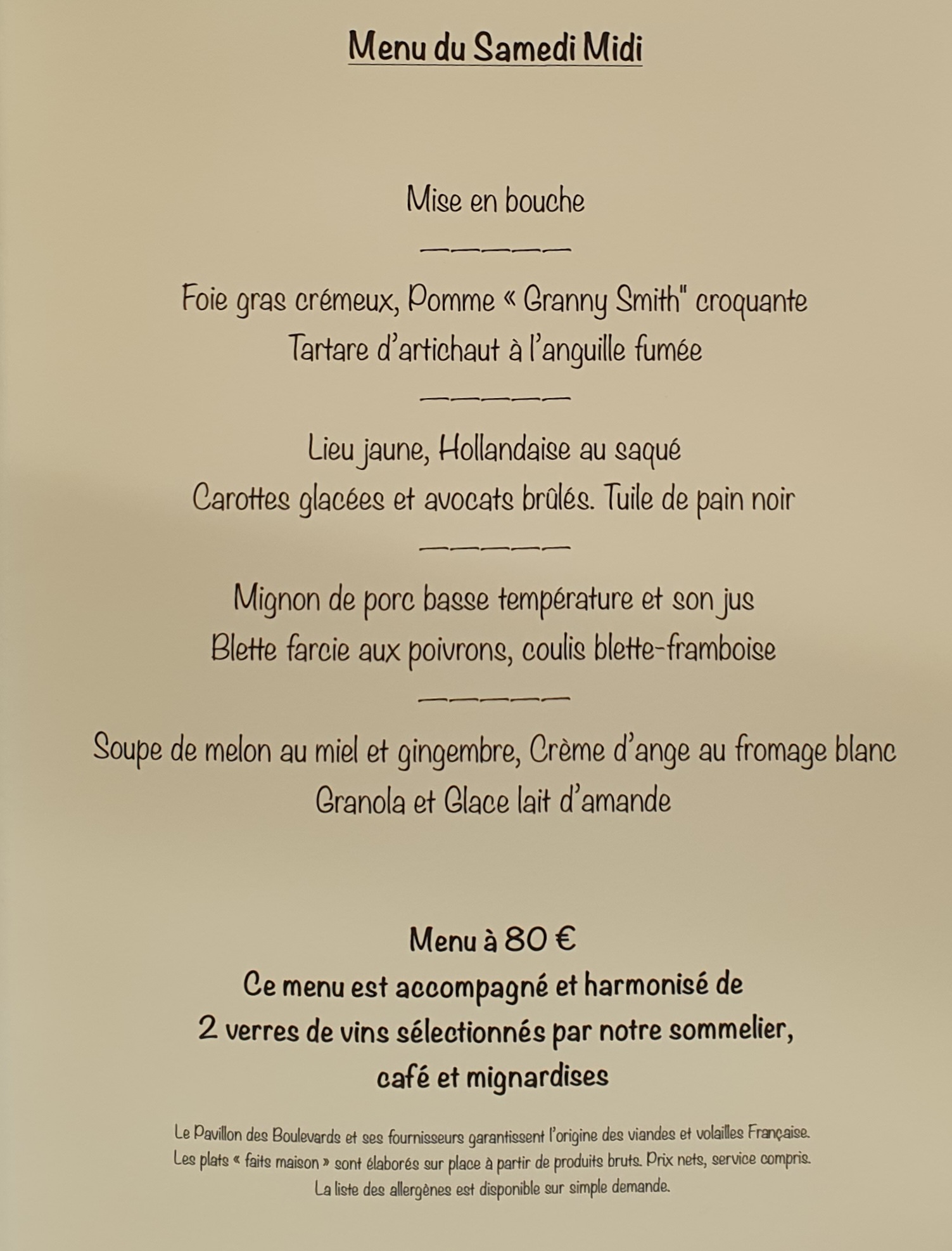 Un seul mot pour décrire le Pavillon des Boulevards : Parfait : accueil, lieu, service et nourriture. Nous avons pu apprécier le menu découverte en 8 services : un mélange de saveurs et de couleurs qui régalent autant les yeux que le palais.