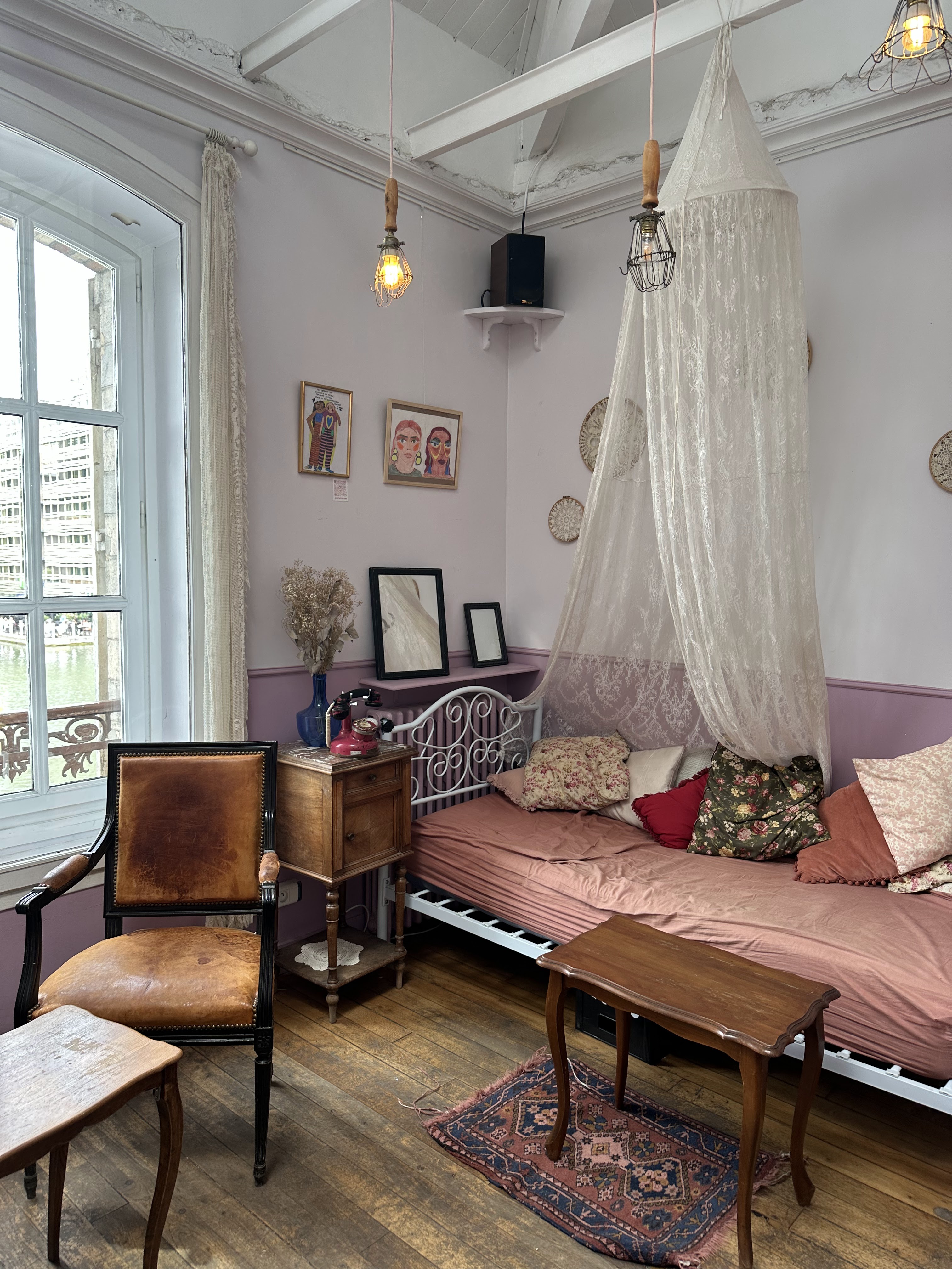 Un endroit atypique, original, superbe où l'on peut boire son thé ou son chocolat dans la cuisine de la maison, dans la baignoire ou encore dans le salon tout en couleur ! Victime de son succès ce lieu est pas mal prisé et la place dans les petites pièces manque parfois. Service au bar et terrasse agréable en bord de quai. Seul bémol les gâteaux qui étaient trop secs.