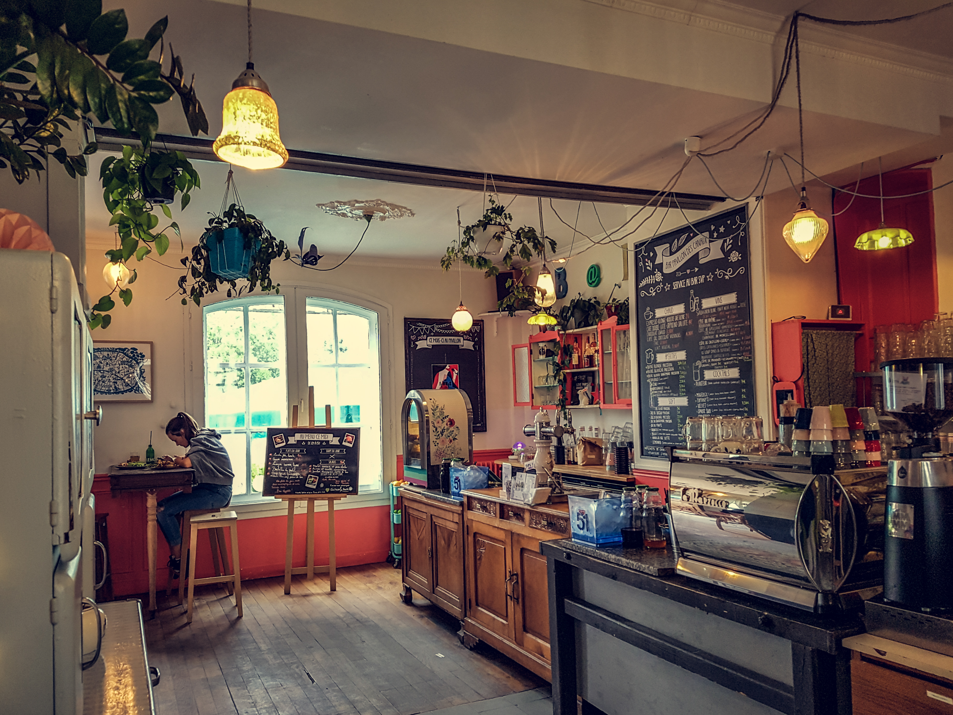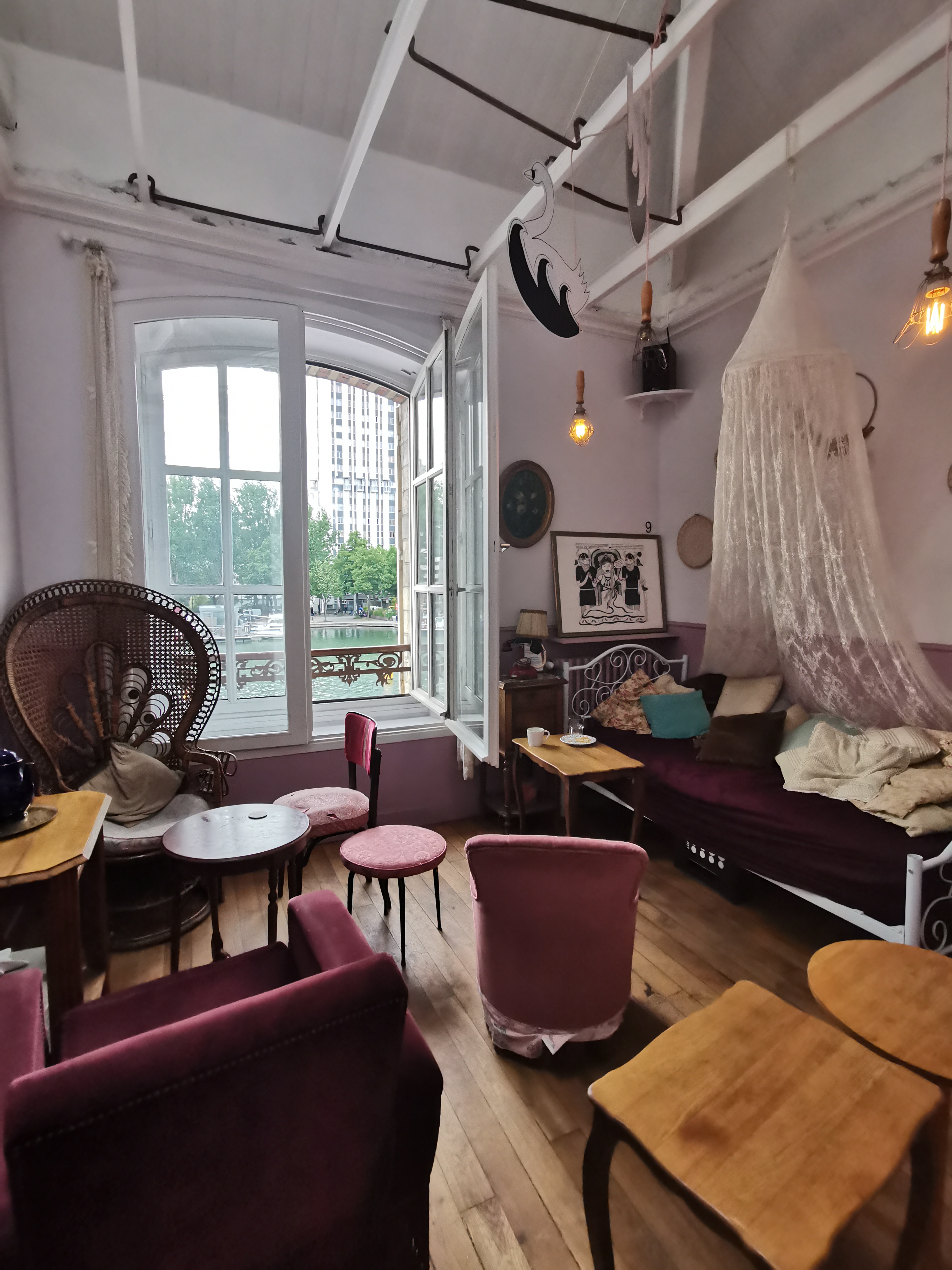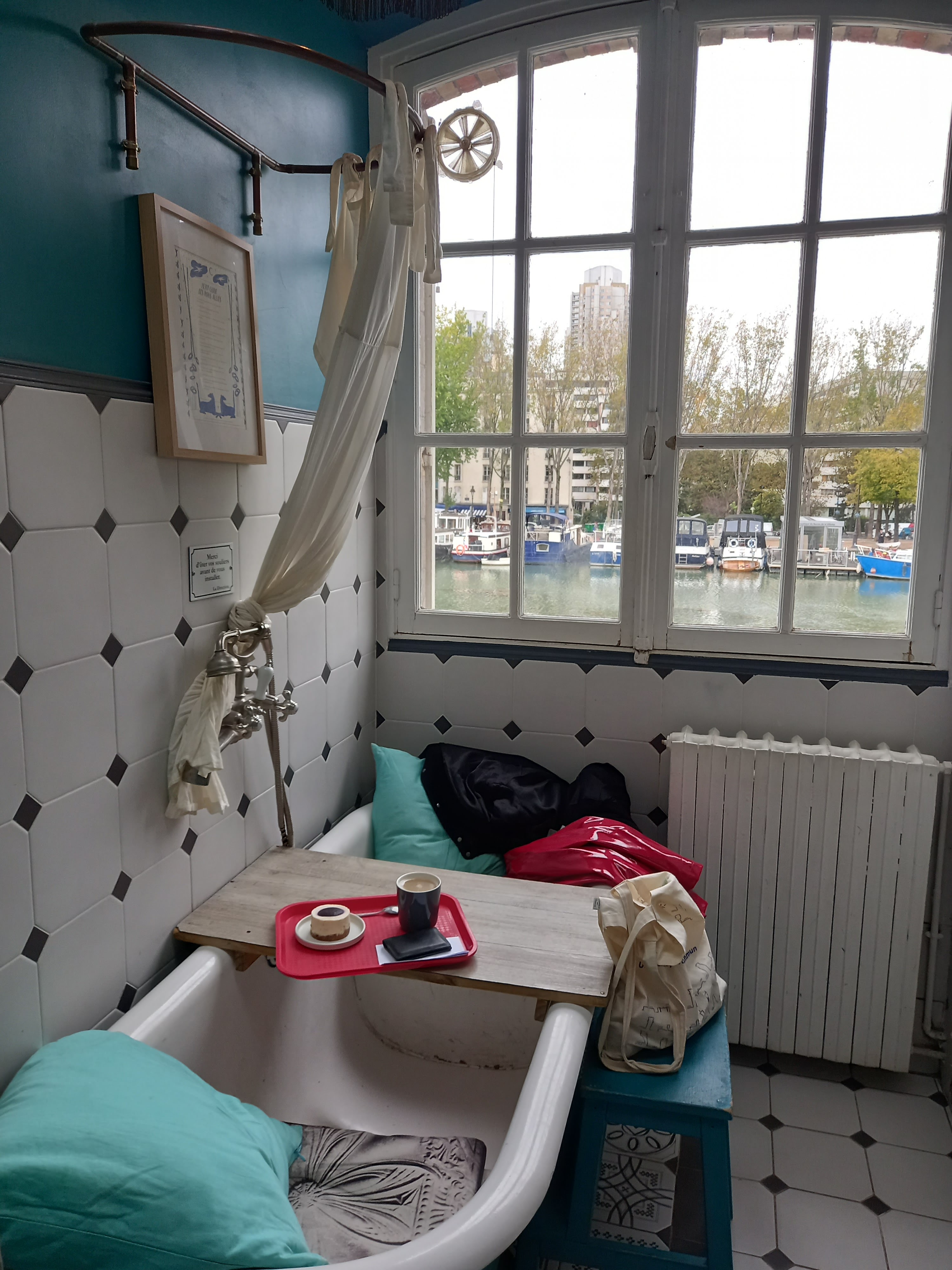 Maison/café juste en face au bassin de la Villette avec pleine de charme où on peut manger même dans une baignoire ..