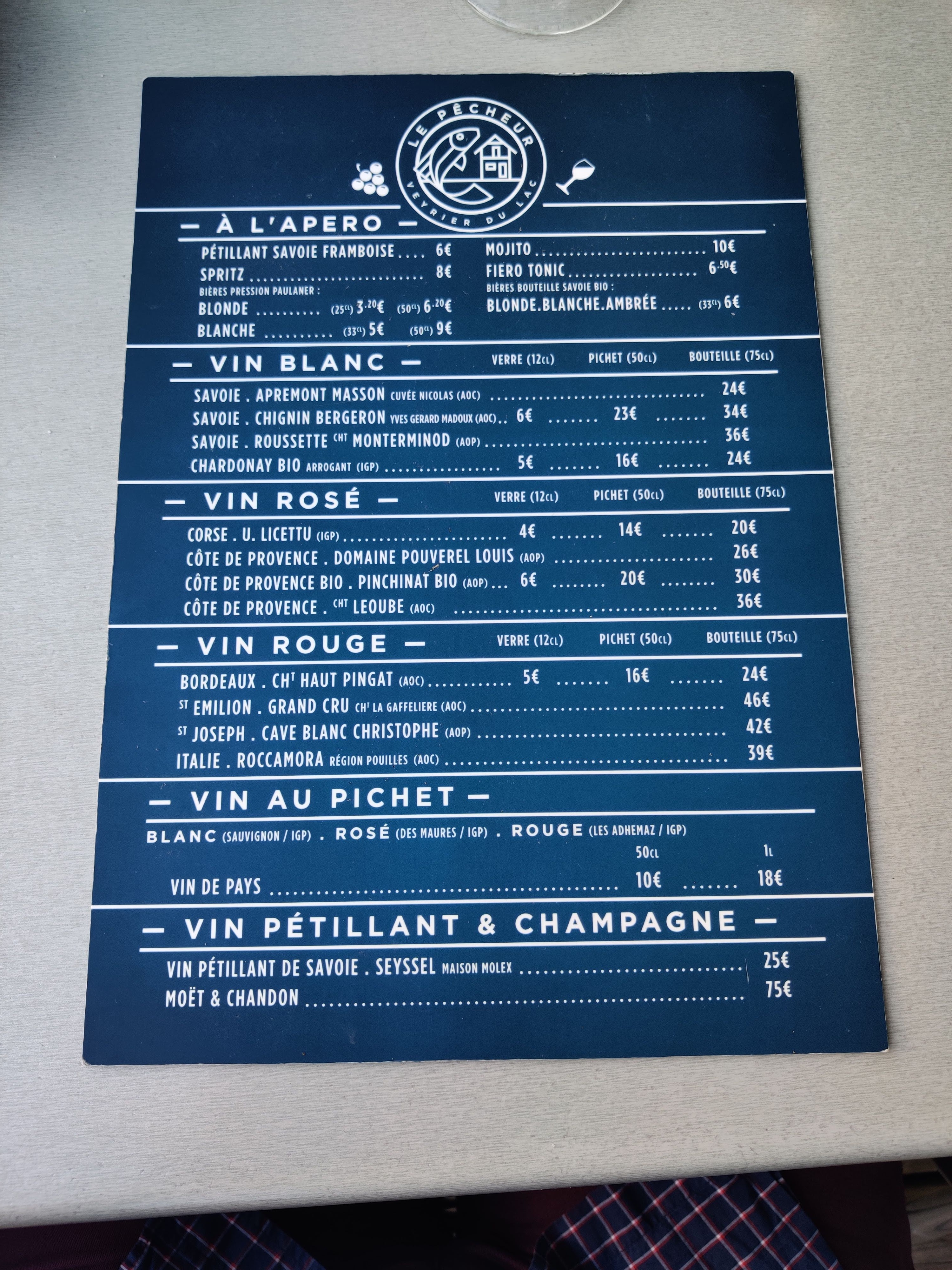 Accueil super sympa. Serveuses disponibles et efficaces. Un peu cher à mon goût. Mais peut etre comme ailleurs sur Annecy ? Il faut compter 50 euros par personne. Apéro. Friture a l apero. Plat. Dessert. Vin. Café. La vue sur le lac est magnifique la nuit. On y reviendra sûrement un jour...