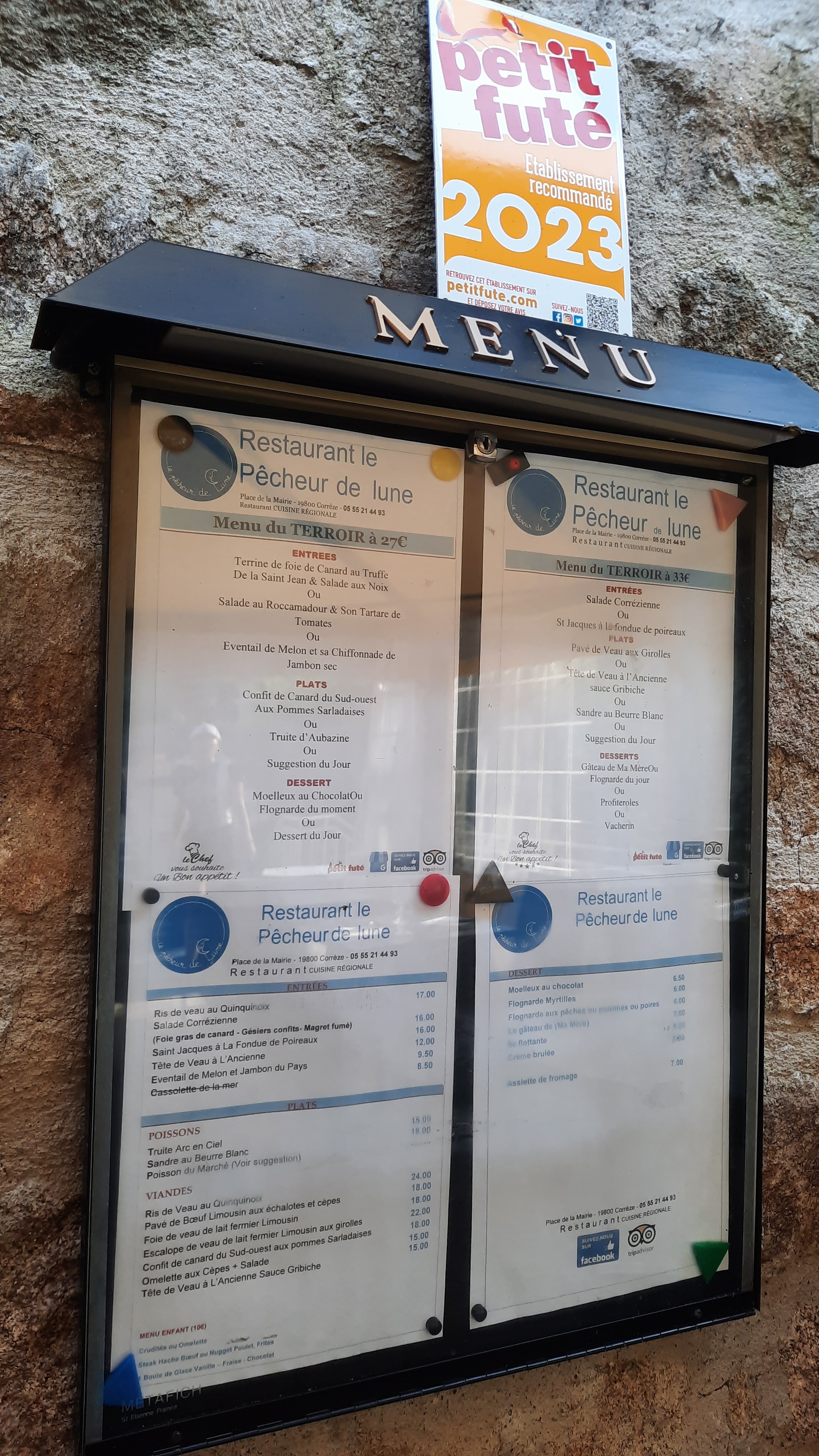 La Corrèze est réputée pour sa bonne cuisine. Voici une très bonne adresse pour manger des bons petits plats du terroir : salade Corezienne avec du foie gras de canard et des gésiers, omelettes aux cèpes, escalope de veau aux girolles, Flognarde aux myrtilles, glaces fait maison ... Le pêcheur de la lune est primé au guide du routard et bison futé 2023. Très bon accueil. Le restaurant est situé en face de la mairie de la commune de Corrèze, parking gratuit. Réservation fortement recommandée.