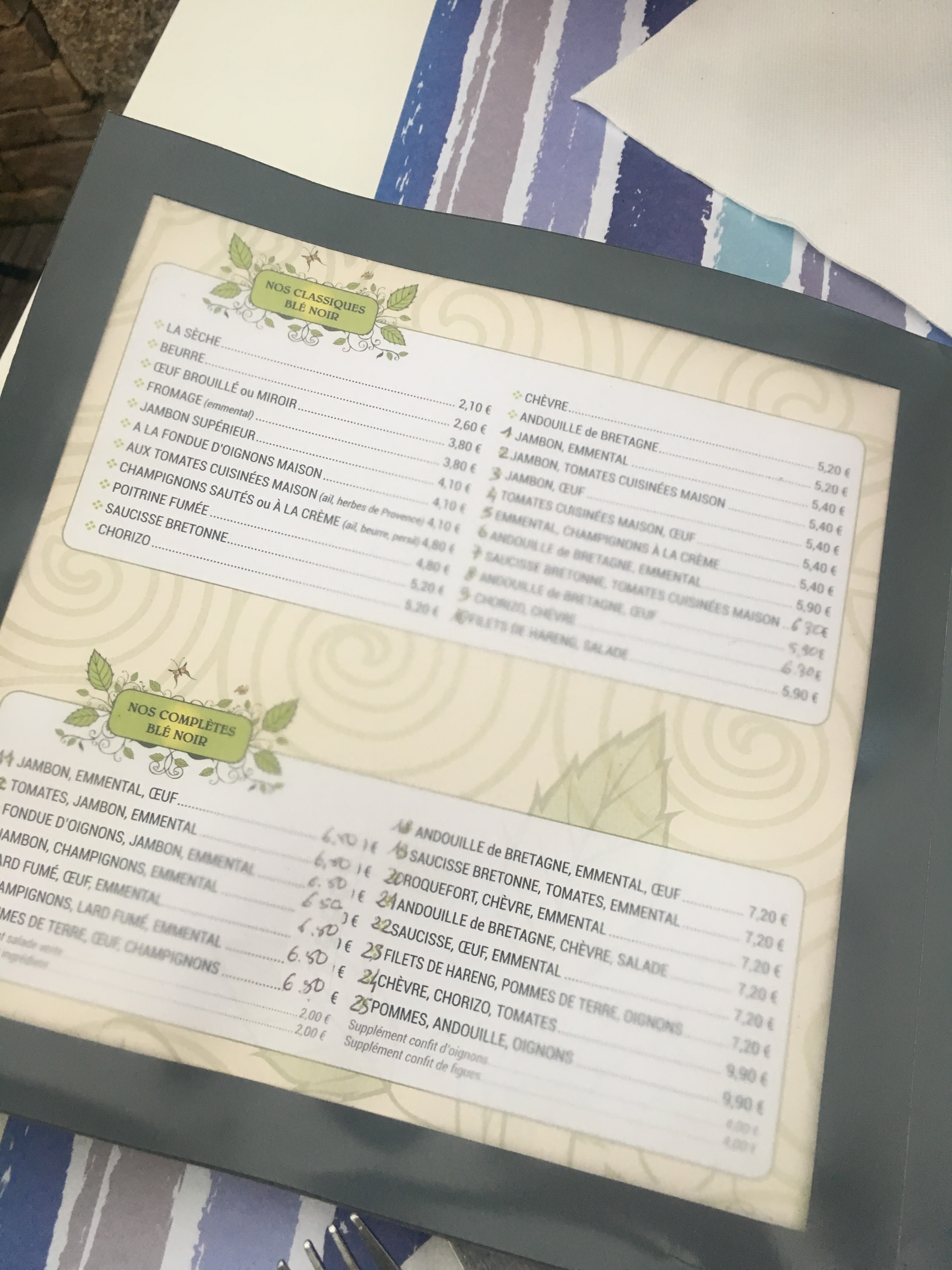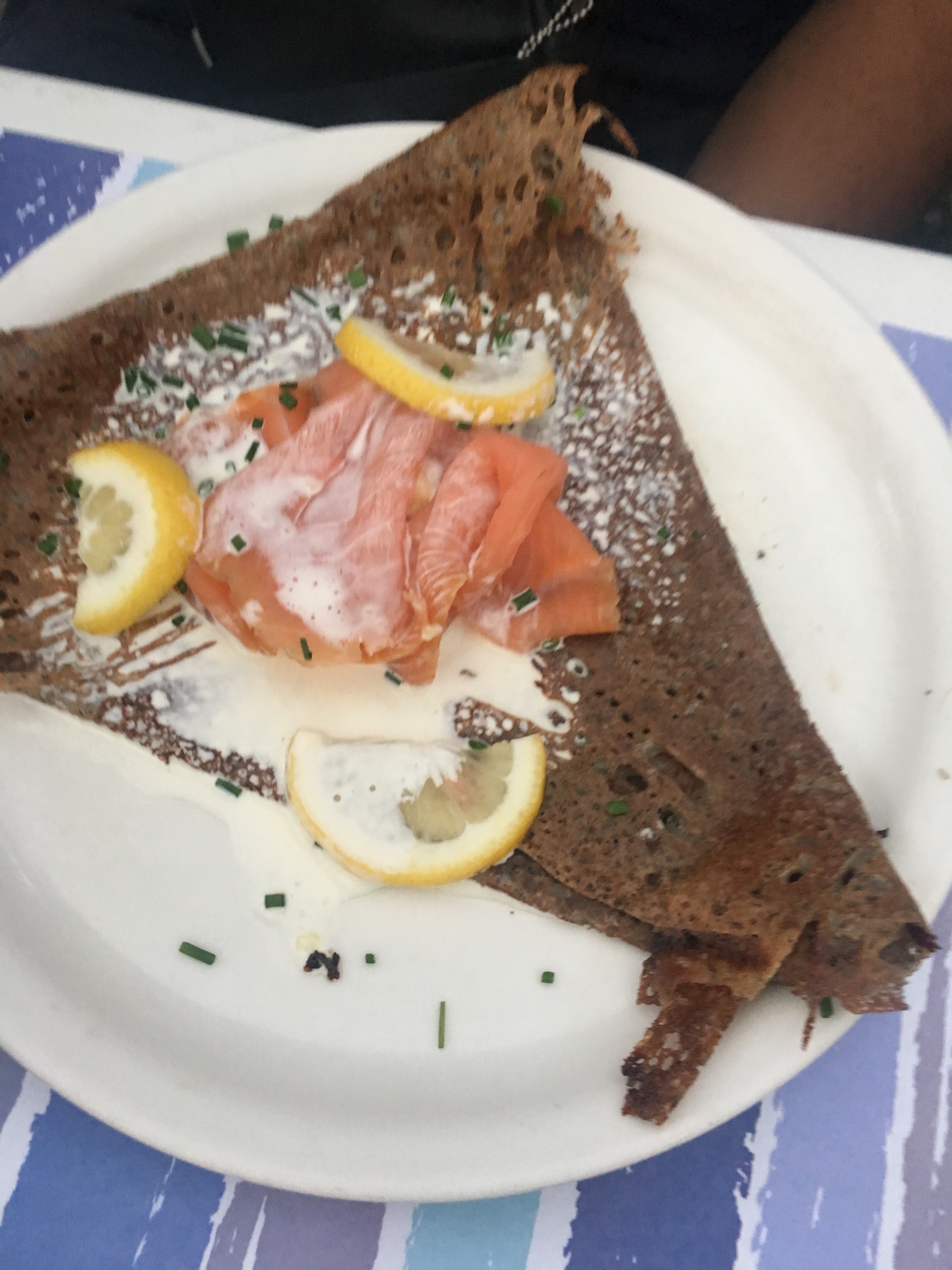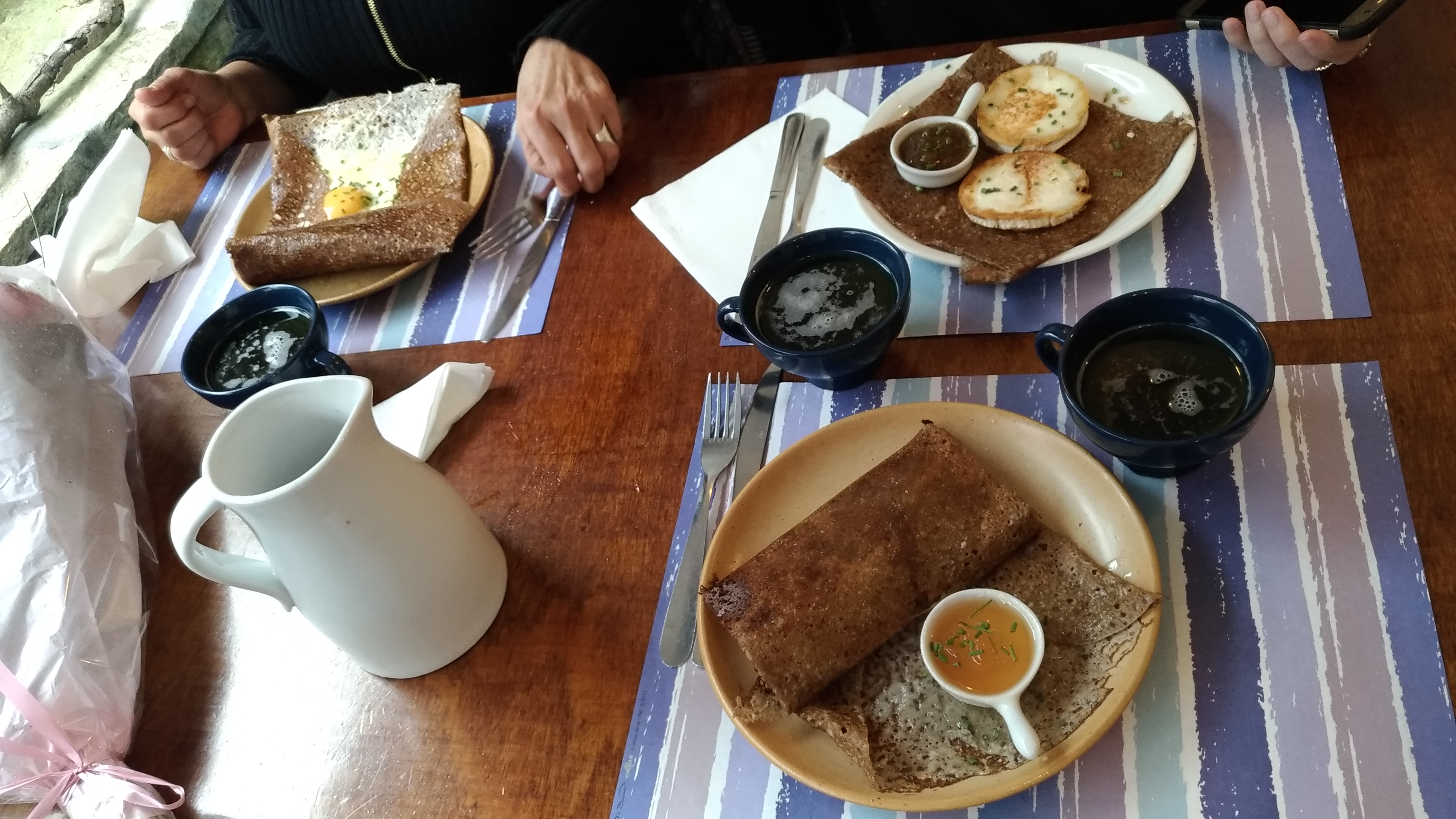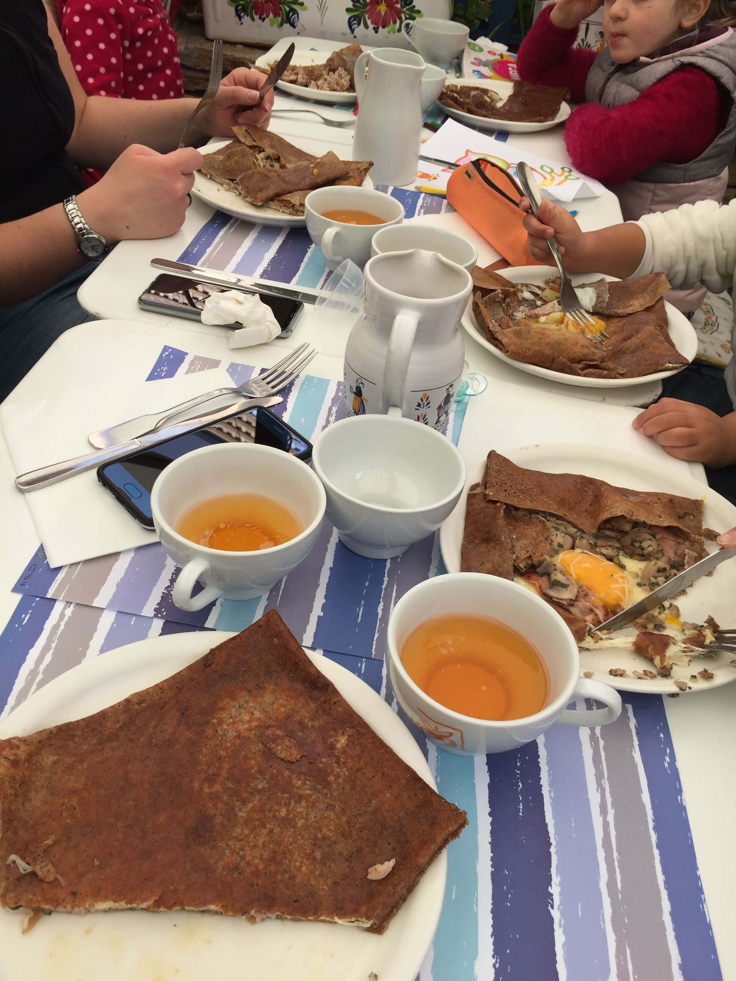 Nous avons déjeuné samedi midi dans cette crêperie. Nous étions côté rue, agréable à cette saison de profiter du calme et du charme de la ville close. Crêpes très bonnes ! Les tarifs sont plus élevés qu’en moyenne, une dizaine d’euros par crêpe dès qu’il y a plusieurs garnitures. Avec 2 crêpes et 1 boisson il vaut mieux compter un budget de 25/28 euros par tête