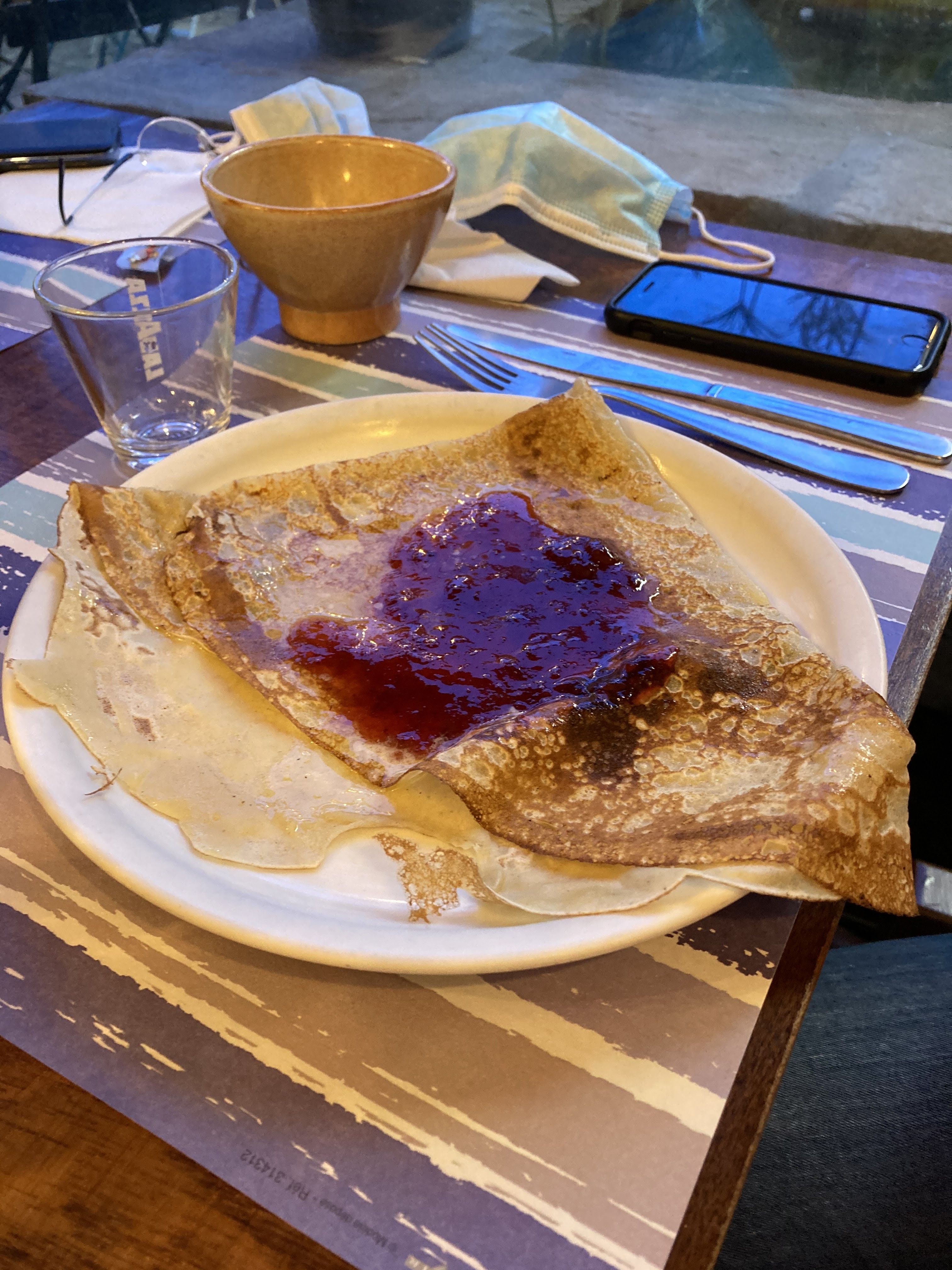 Réservé pour midi, ça tombe bien, la crêperie ouvre à midi. Et les réservataires attendent sagement l'ouverture. On s'installe, un peu inquiet, ça va être l'assaut à la cuisine ?...eh bien non, les plats arrivent sans retard, sans précipitation, cool ! La serveuse est gentille et attentionnée...tellement que je finis par lui demander de lever un coin de son masque pour que je puisse voir quel minois se cache derrière...impossible, Monsieur, c'est le règlement ! Je lui ai dit que je me plaindrai. Voilà qui est fait. A part ça, les crêpes sont délicieuses, le Chardonnay bien mieux que souvent. En résumé, et à tous points de vue : excellente maison.