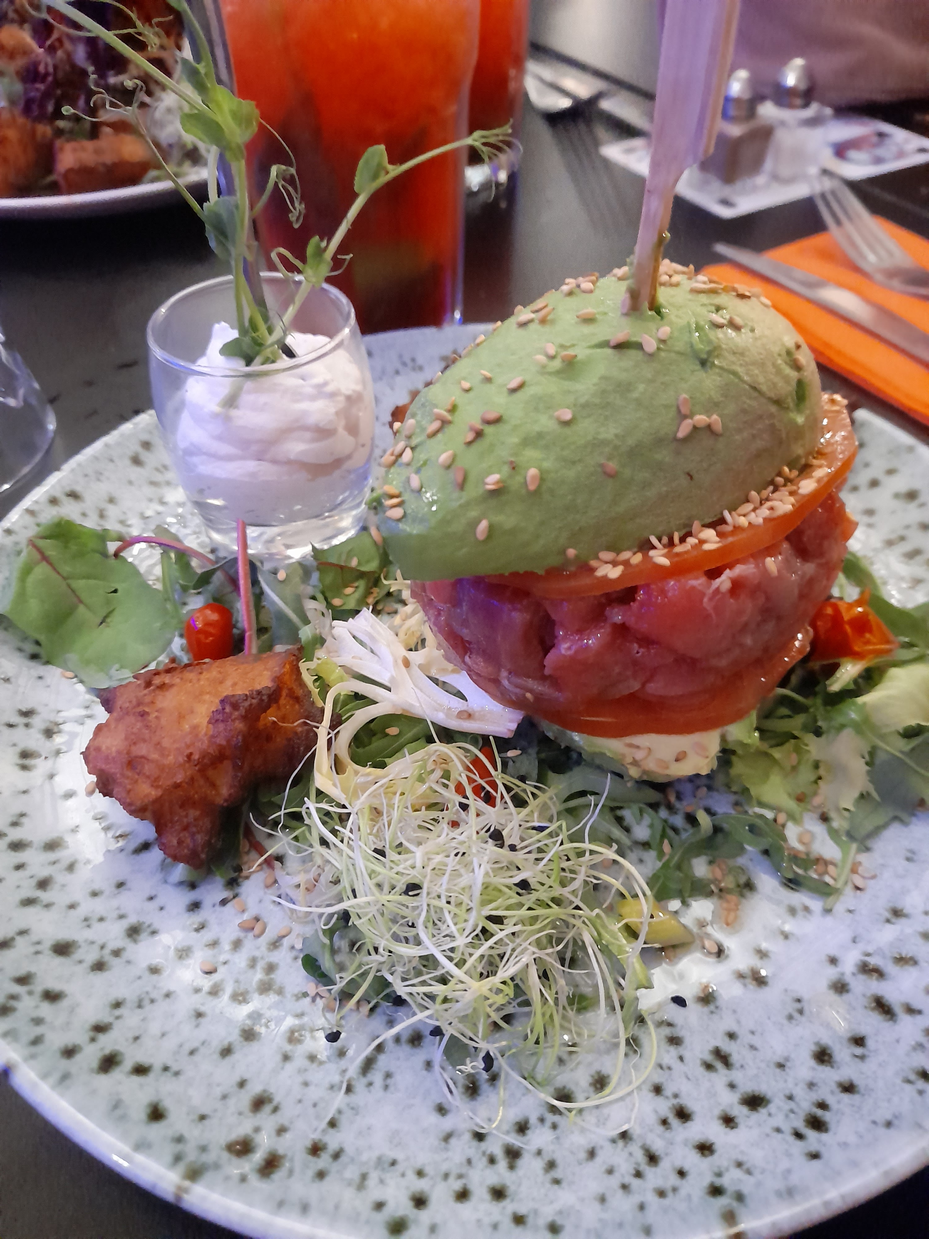 Deco superbe. Personnel gentil. Et cuisine délicieuse. Un Burger avocat avec un tartare de thon un pur régal.
