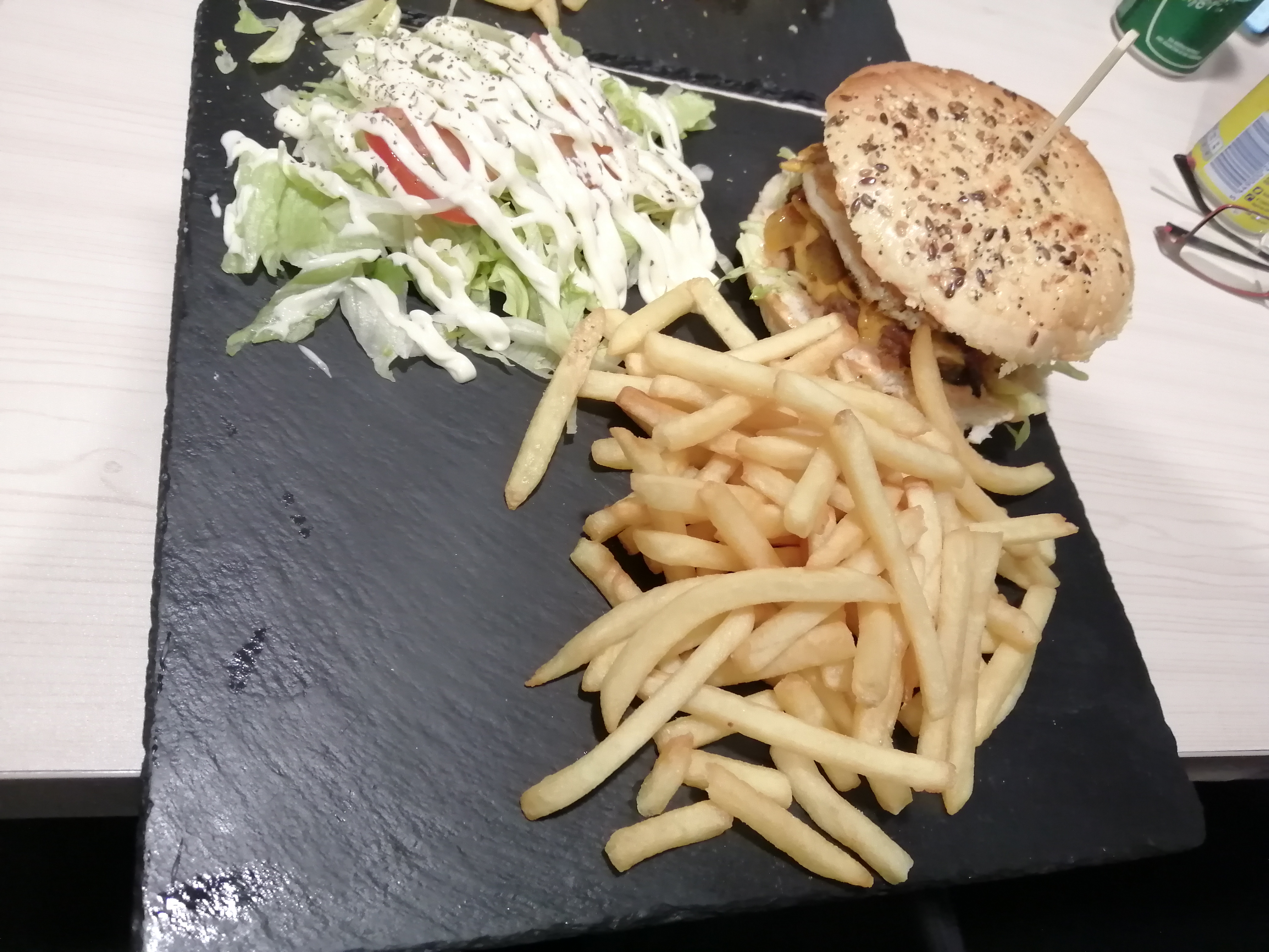 Les hamburgers 🍔 sont super bon servis avec une petite salade sur une ardoise au top . Le prix est raisonnable pour 2 menus hamburger 25,50 € . Je recommande. À très vite