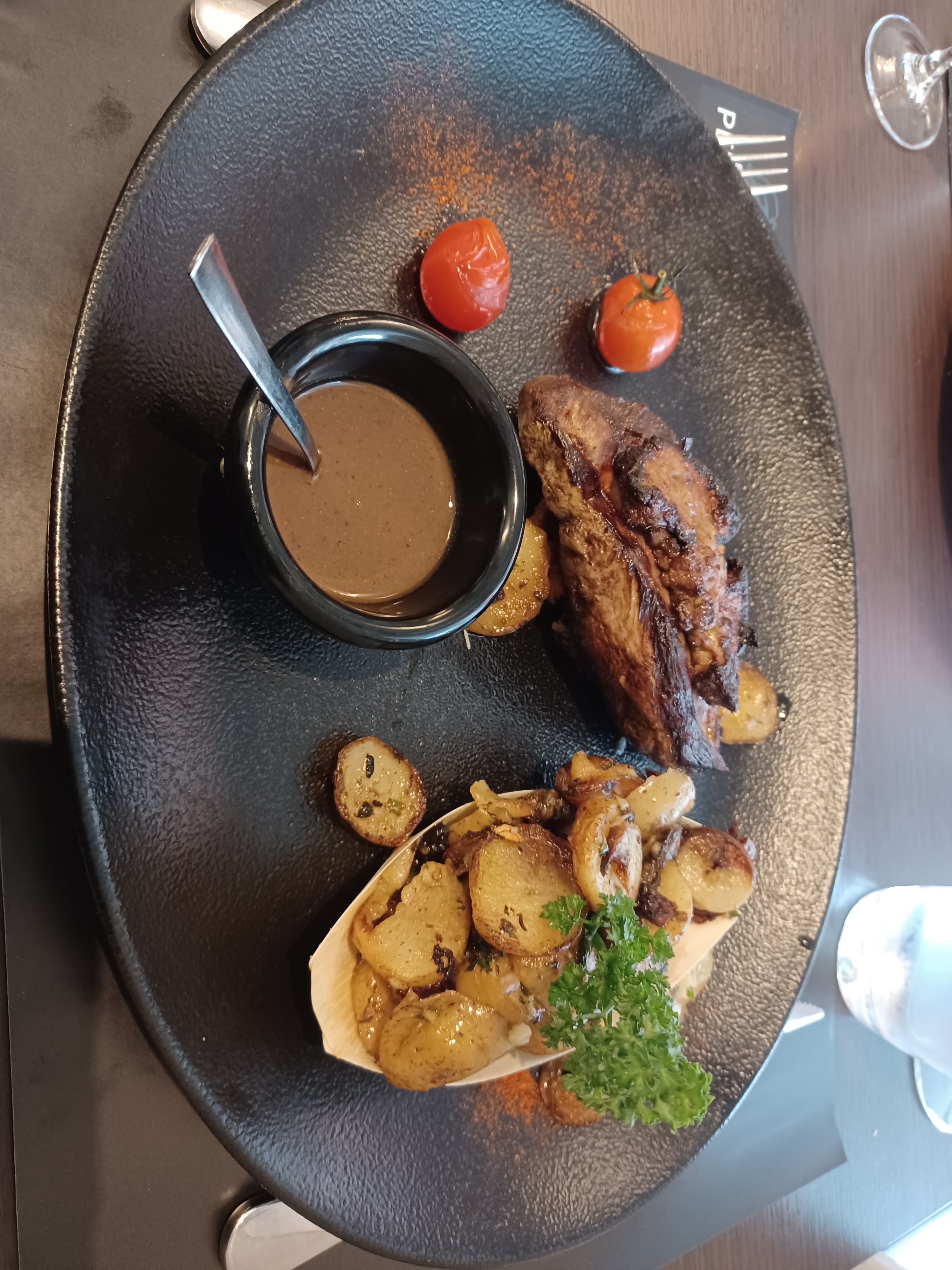 Nous sommes allés par pur hasard manger là ce soir( car il pleuvait) et quelle chouette surprise… Personnel super accueillant et bienveillant, de très bons conseils pour la carte et les suggestions du jour. L’entrée « fricassée de girolles avec son œuf cassé » et le plat « entrecôte de bœuf, frites, sauce au poivre » étaient non seulement succulents ( chapeau au cuisinier), mais aussi copieux et joliment présentés. Tellement copieux que nous n’avions plus de place pour le dessert( car en plus nous avions reçu un amuse bouche pour patienter). Un excellent moment . Merci à vous.Trop gourmands, nous n’avons pas pris le temps de prendre de photos.