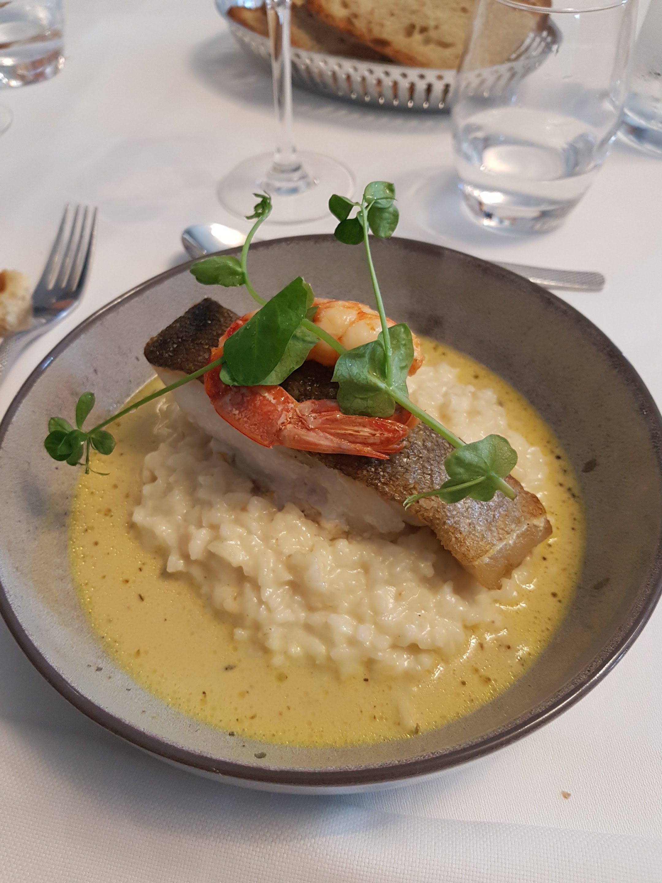 Poisson du jour très bon. Lotte avec crevettes et risotto sauce bisque