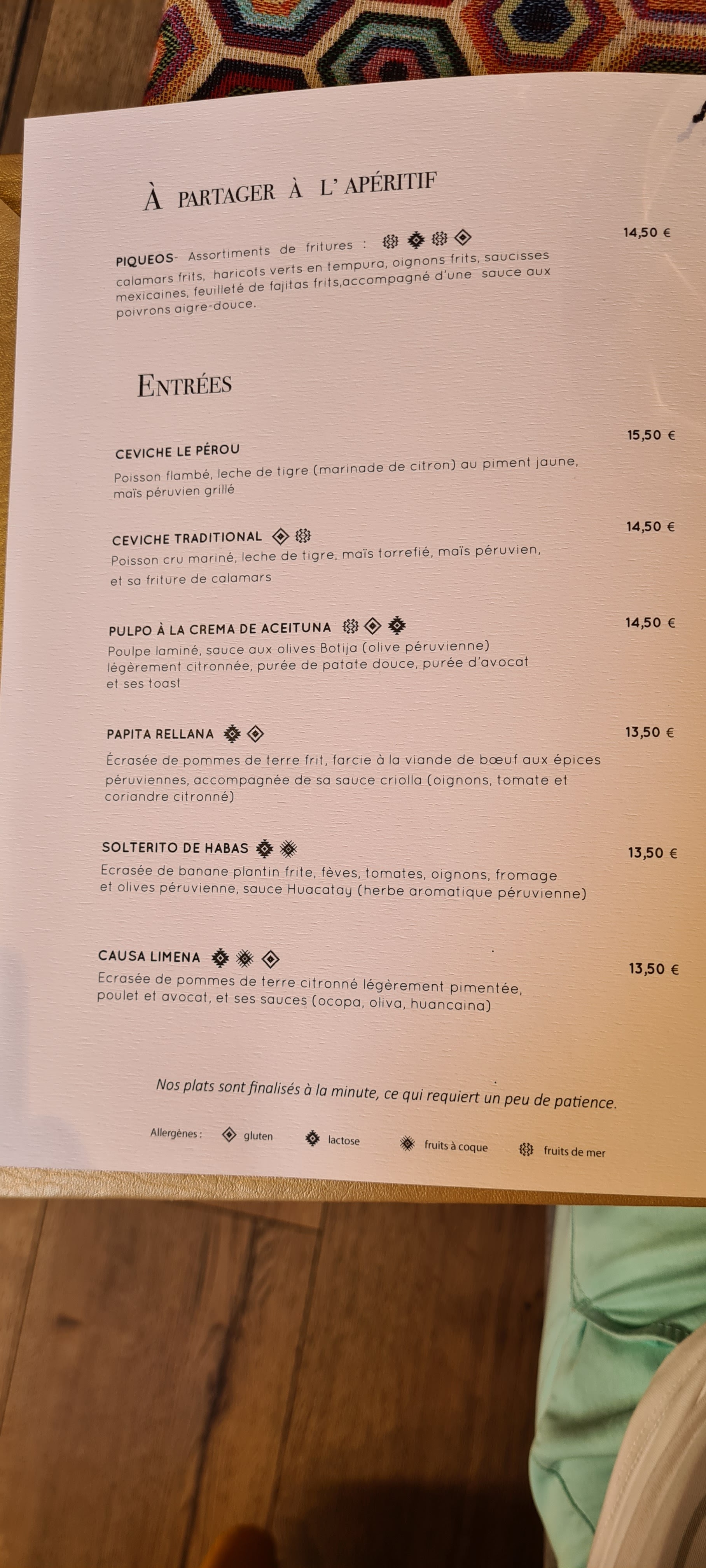 Superbe carte, l'ambiance est magique un vrai voyage culinaire, le personnel est adorable, je recommande les yeux fermés la cuisine fait par de véritables péruvien est très équilibré, fait avec des produits du Pérou respectant les traditions culturelles. La carte à vin vous réserve de très belle surprise et le rhum... Voyage assuré à essayer dans un cadre chaud et agréable.